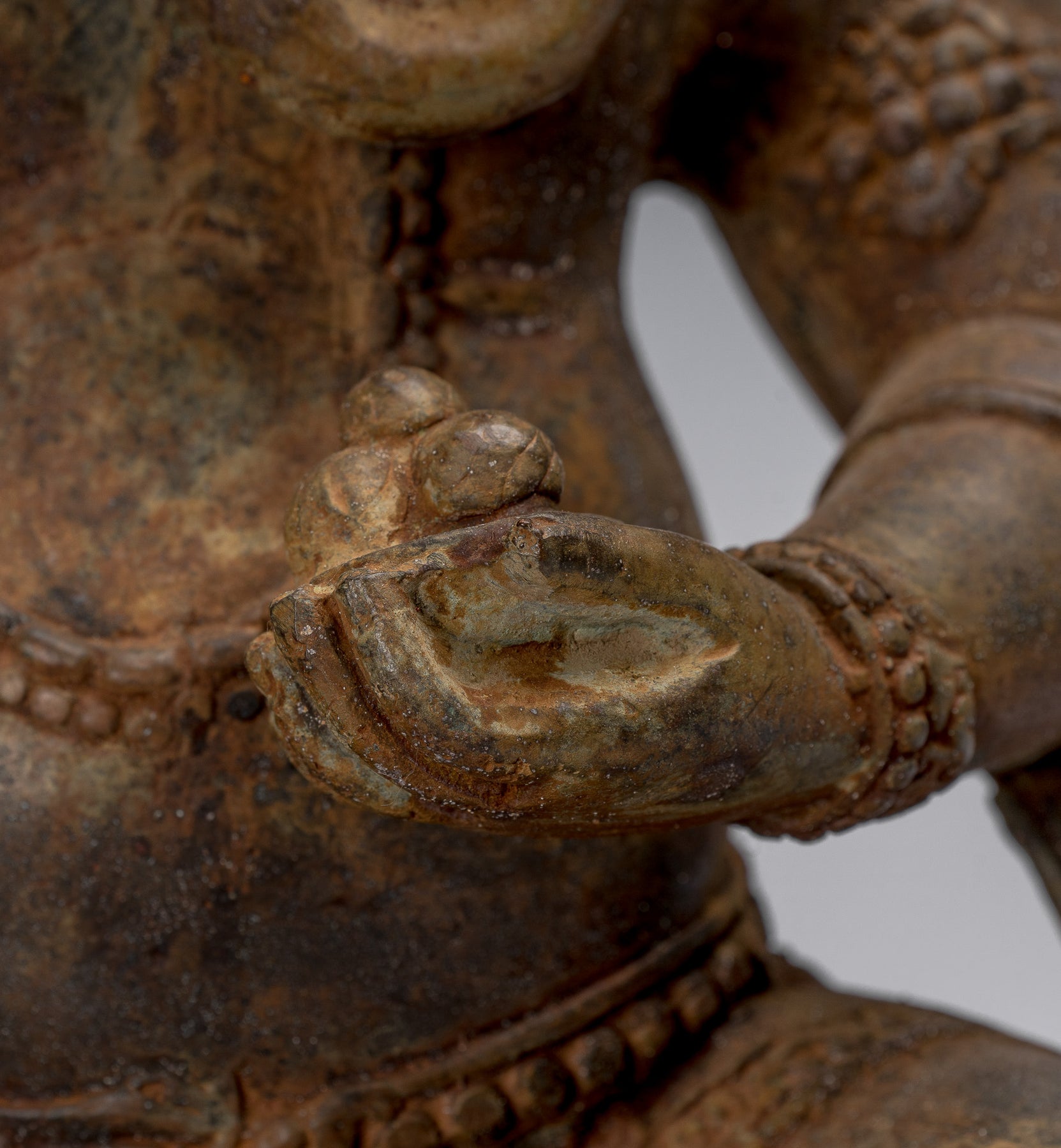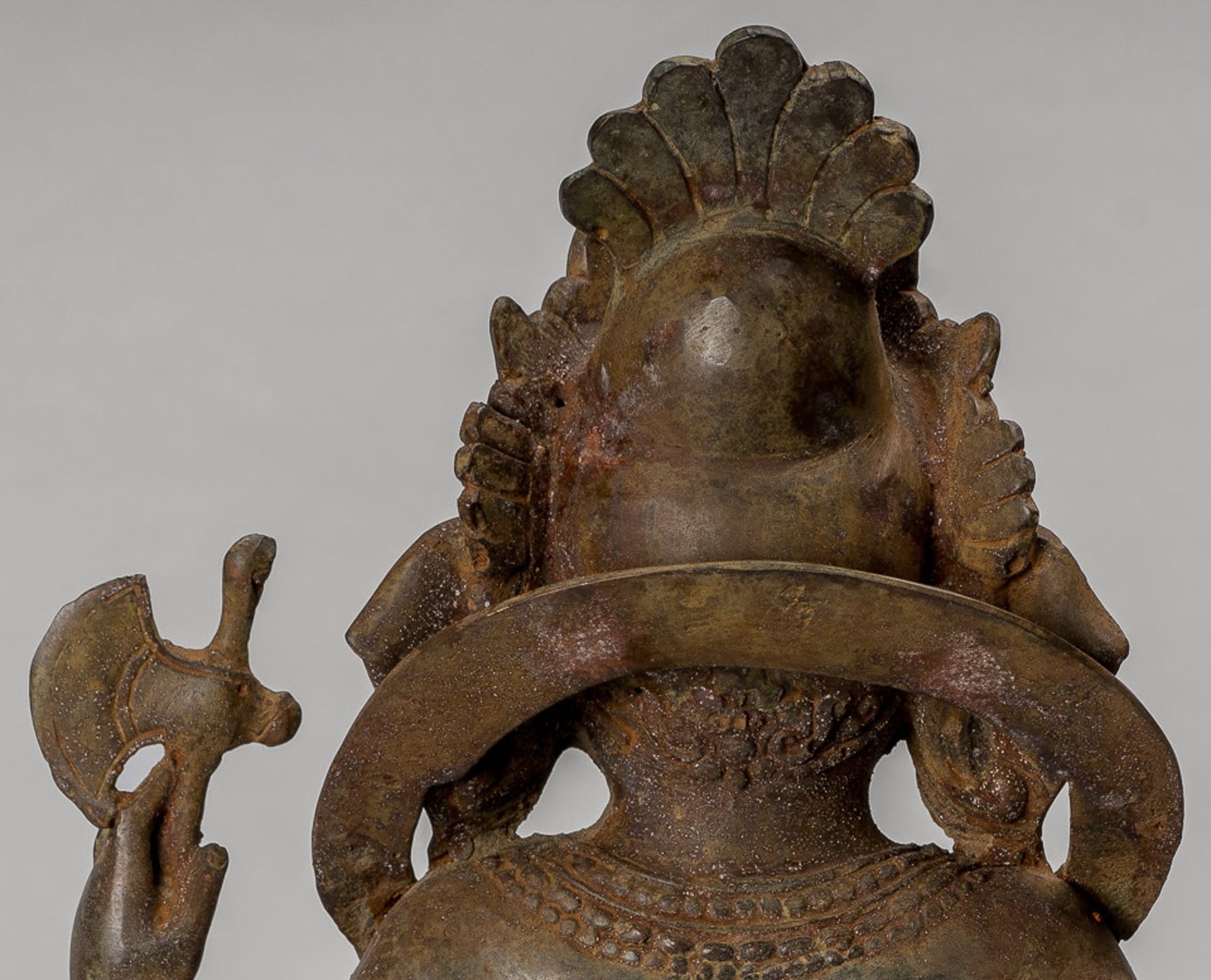 Hier hält Ganesha auch die Überreste seines gebrochenen Stoßzahns. Das Brechen des Tusks hat mehrere Hintergrundgeschichten. Eine Instanz deutet darauf hin, dass es zerbrochen wurde, als Shiva den Kopf vom Elefanten abschneidete, bevor er Ganesha verlieh. Ein anderer schreibt, dass Ganeshas Feder kaputt ging und er ein Schreibinstrument brauchte. Versuchen Sie Ihrem Chef zu sagen, dass Sie das nächste Mal versuchen, einen Bericht mit einem Elefantenstummel aufzuschreiben, weil Ihr Computer abstürzt. Unabhängig von seinen mehreren Ursprüngen stellt die Haltung des Stoßzahns weniger ein Andenken dar, und eher eine Darstellung, dass unsere Spiritualität wichtiger ist als unsere äußeren Körper, was bedeutet, dass wir die Dualität der beiden als getrennte Entitäten überwinden müssen.