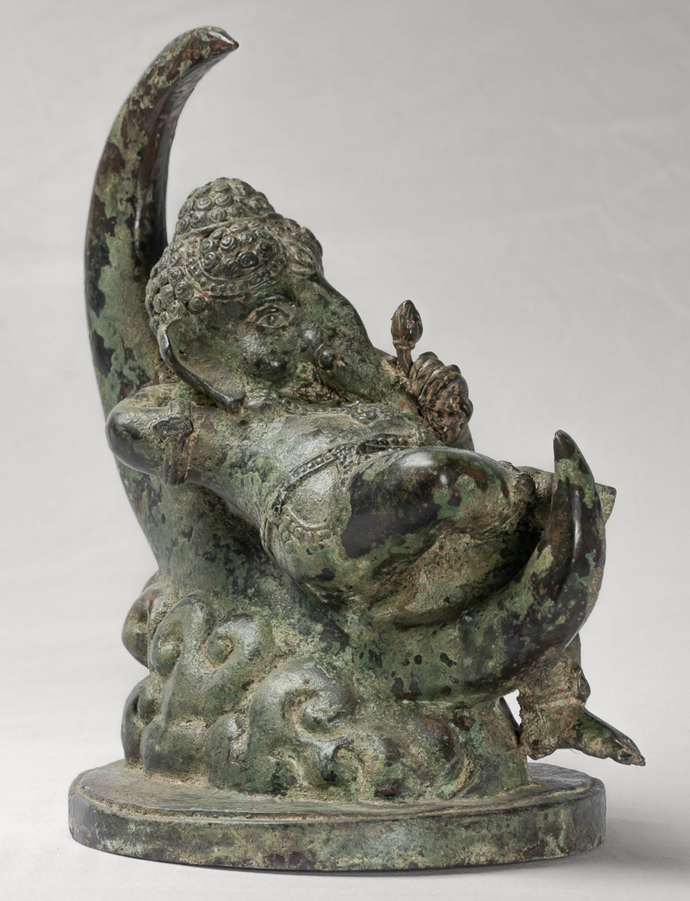 Ein anmutig auf dem Mond liegender Ganesha aus Bronze im antiken Thai-Stil mit einer wunderbar charakteristischen Patina, die seinen Charakter und sein Alter hervorhebt.