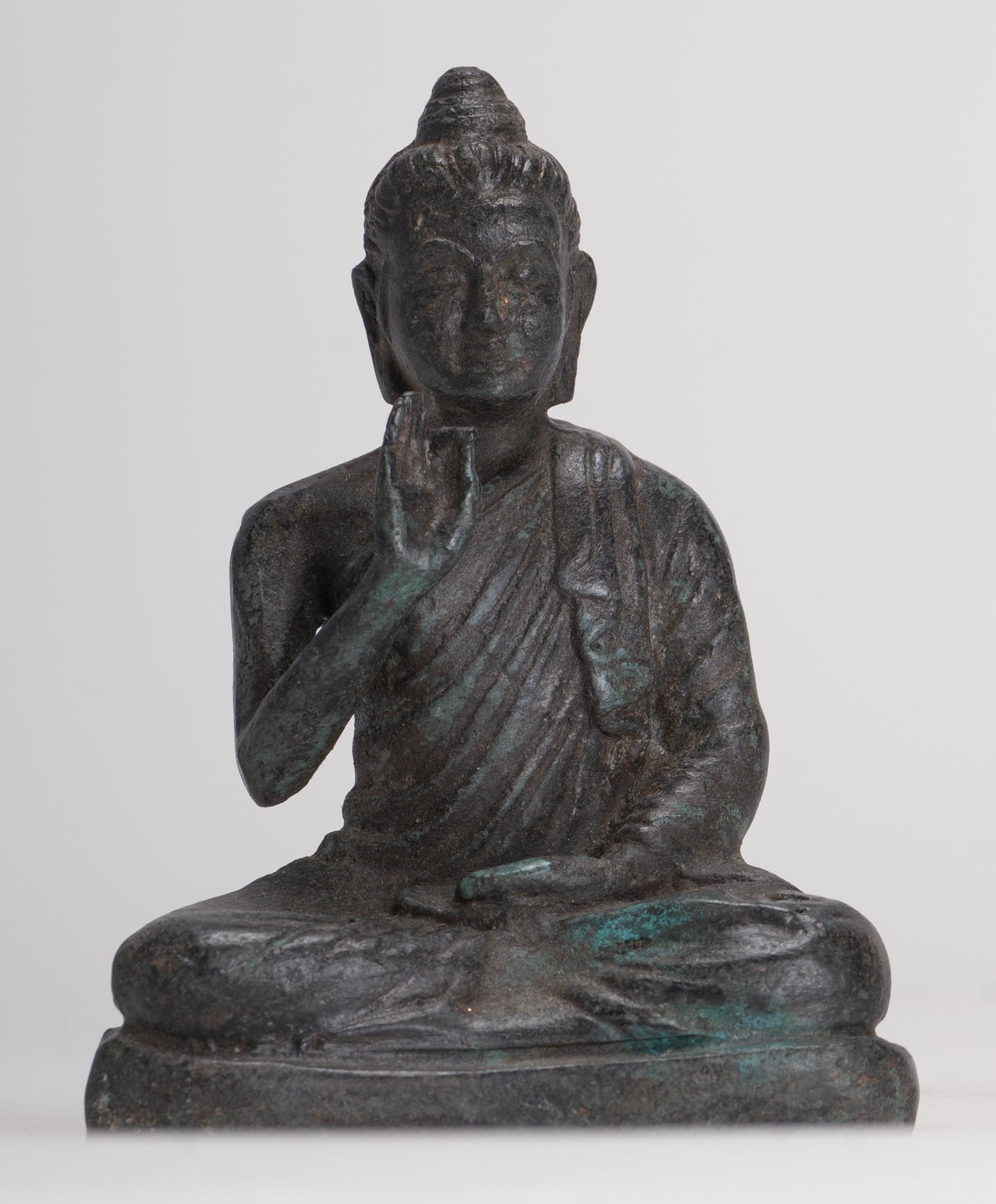 Ein antiker Gandhara -Stil Buddha im Lotus- oder Padmasana -Beitrag mit Buddha, mit Jeder Fuß auf den gegenüberliegenden Oberschenkel platziert und Hände im Doppel angehoben Dharmachakra oder unterrichtet Mudra. Seine Roben kaskaden fließend aus beiden Schultern.In Sanskrit bedeutet Dharmachakra das "Rad von Dharma". Dieses Mudra symbolisiert einen der wichtigsten Momente im Leben Buddha, die Gelegenheit, als er seinen Gefährten die erste Predigt nach seiner Aufklärung im Hirschpark in Sarnath predigte. Es bezeichnet daher die Einstellung des Rades der Lehre des Dharma in Bewegung. In diesem Mudra berühren der Daumen und der Zeigefinger an ihren Spitzen, um einen Kreis zu bilden. Dieser Kreis repräsentiert das Rad von Dharma oder in metaphysischen Begriffen die Vereinigung von Methode und Weisheit. Dies symbolisiert Großzügigkeit.