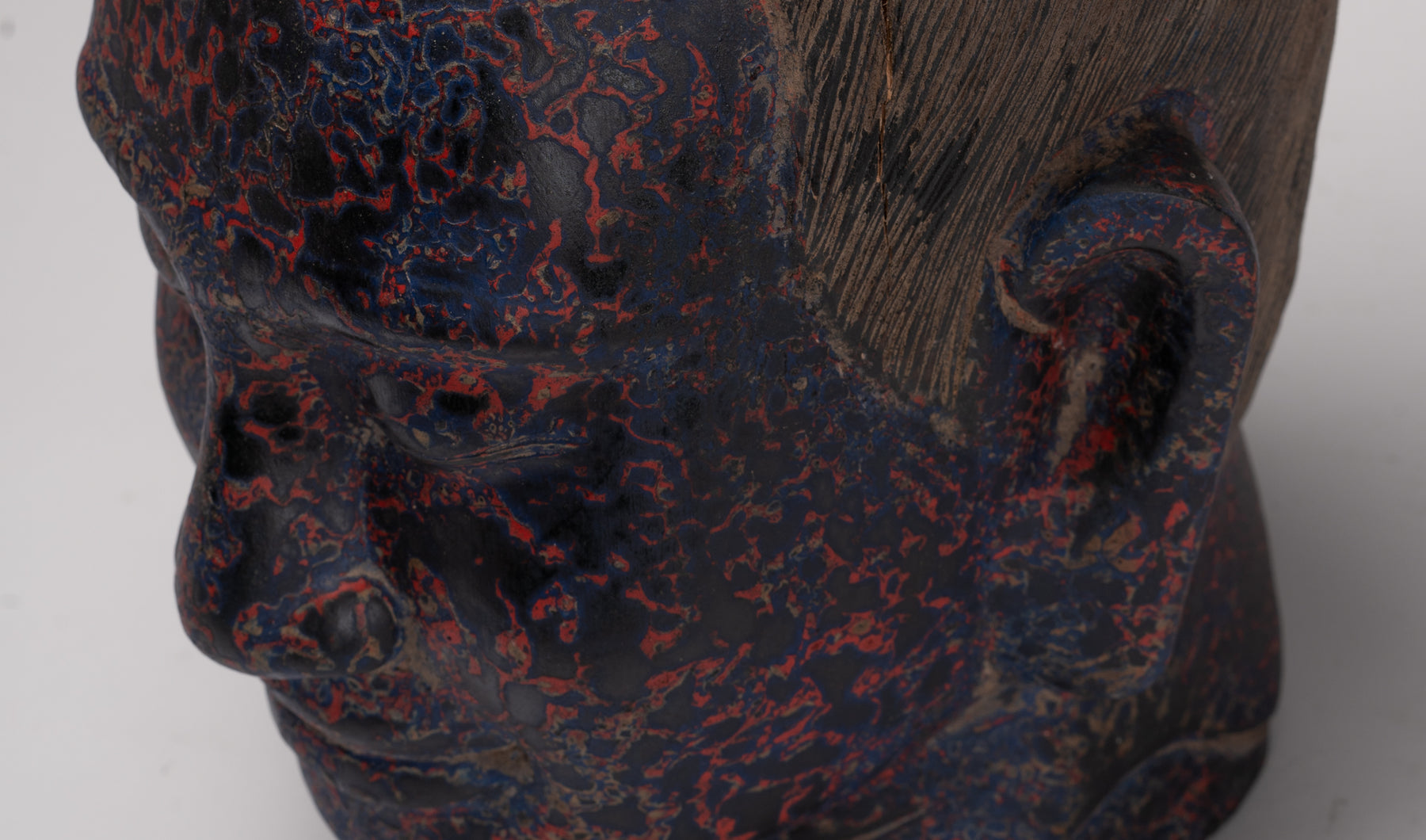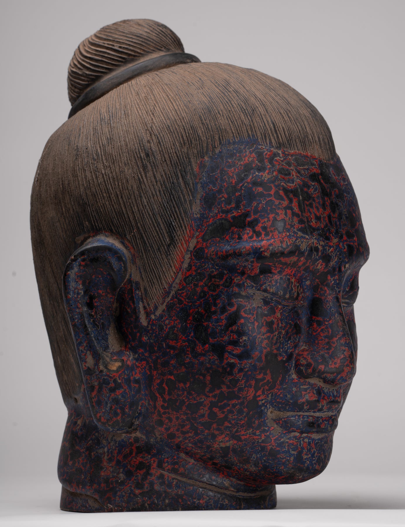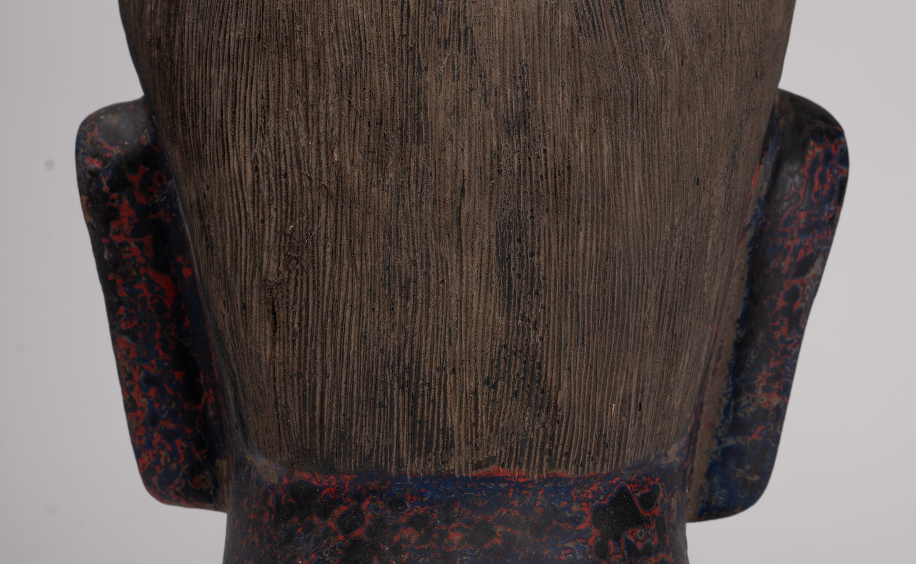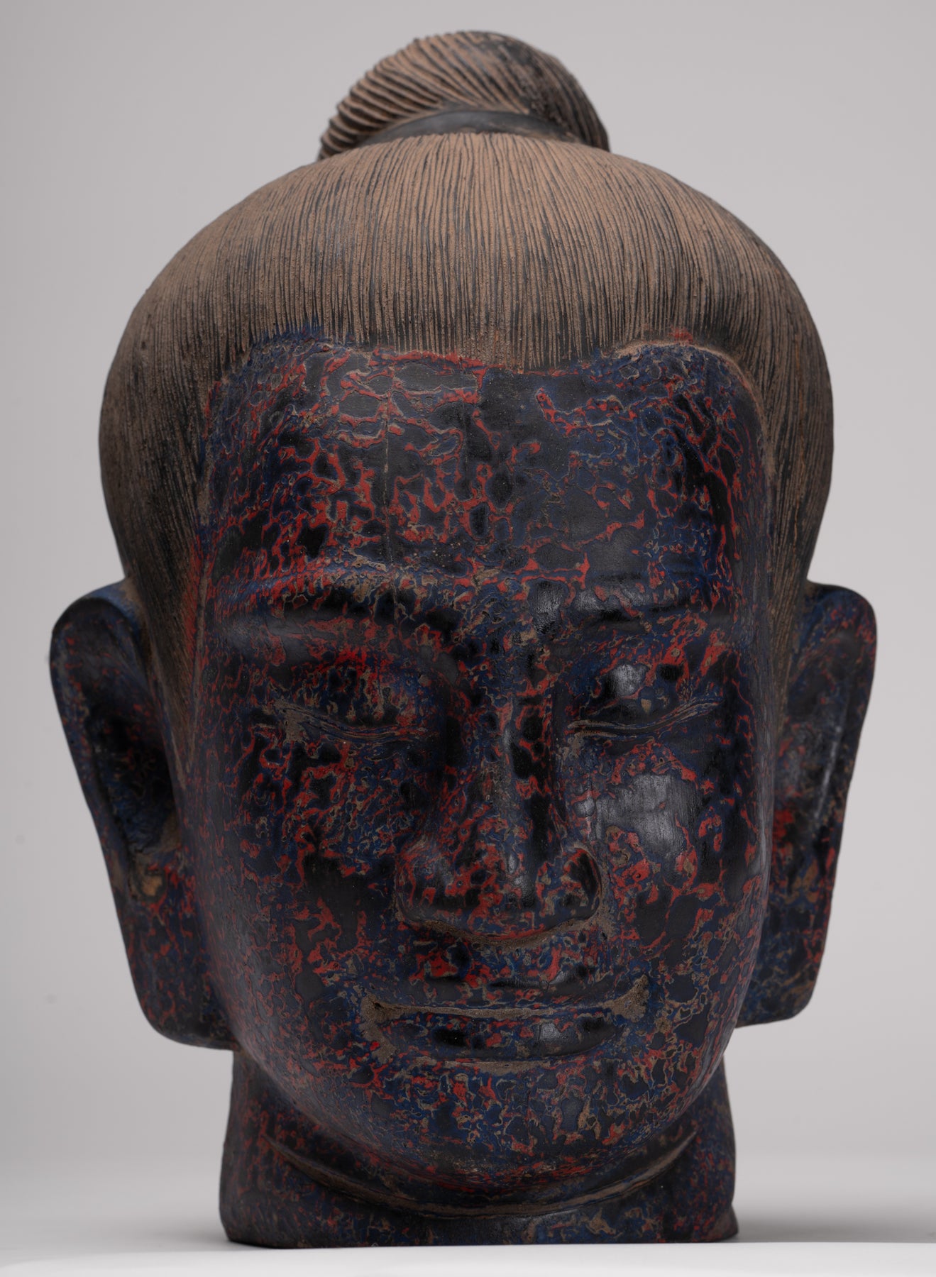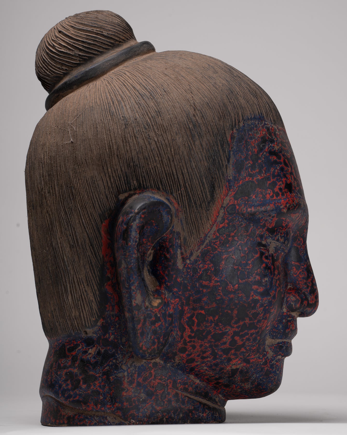 Dieser große König war ein frommer Buddhist der Mahayana -Sekte. Das Schnitzen dieses Stücks ist wunderschön, wie Sie in den feinen Details seines ruhigen Gesichts sehen können. Jedes Detail wird perfekt gemacht.