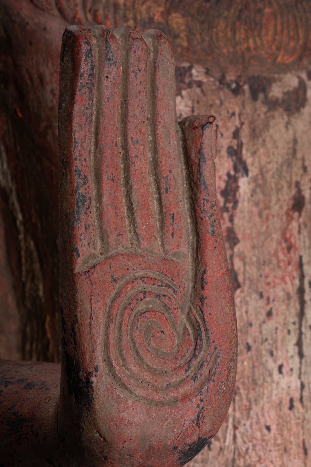 Der Abhaya Buddha ist durch ein bestimmtes Mudra oder eine Handgeste gekennzeichnet, die als Abhaya Mudra bekannt ist. In dieser Geste wird jede Hand mit der Handfläche nach außen angehoben, die Finger nach oben und der Arm in Schulterhöhe positioniert. Das Abhaya Mudra symbolisiert Furchtlosigkeit, Schutz und die Zerstreuung der Angst.