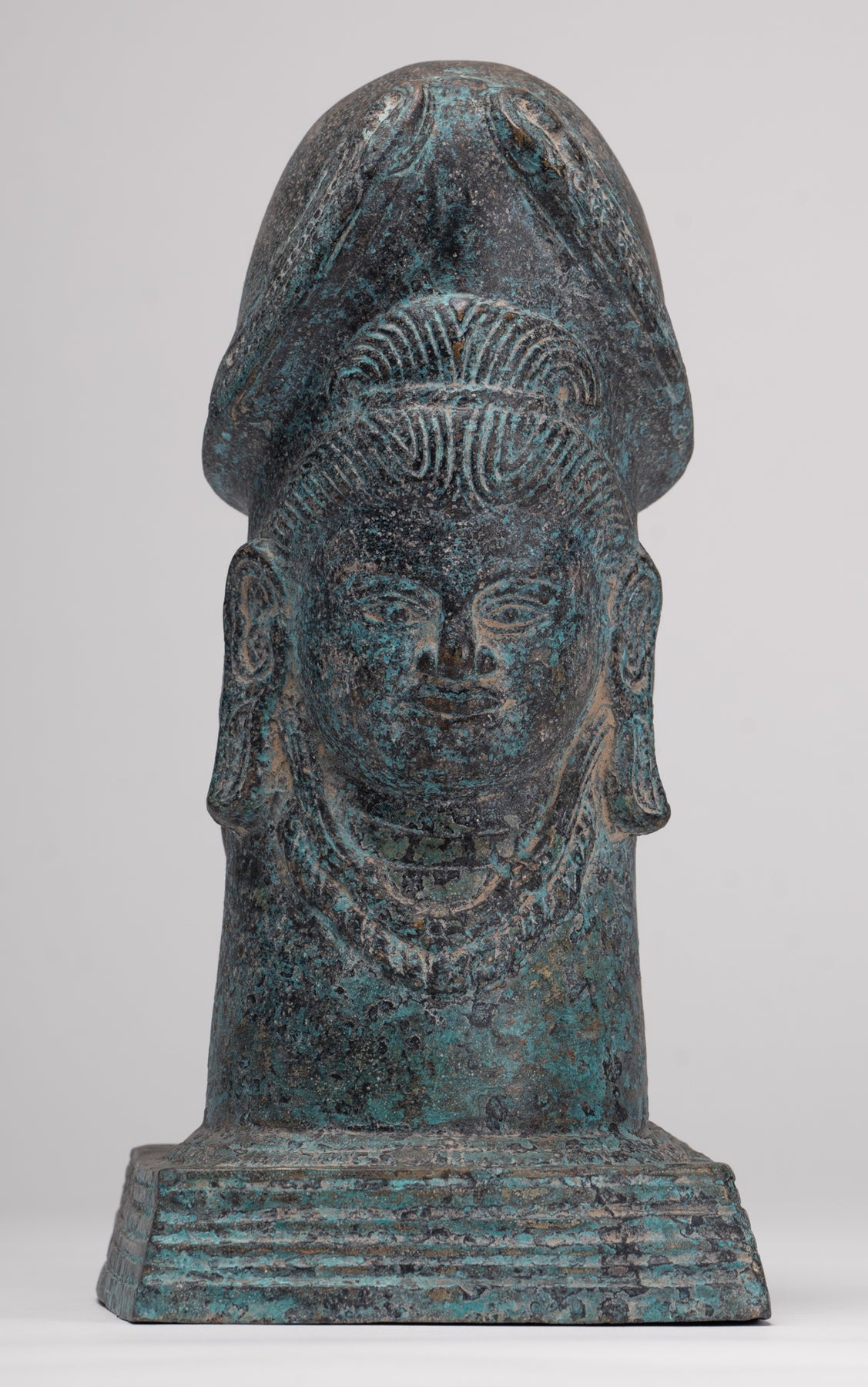 Eine hochwertige Bronze im antiken Khmer-Stil Linga mit dem ruhigen Gesicht von Shiva. Dieses bemerkenswerte Stück verkörpert die zeitlose Kunstfertigkeit der Khmer-Tradition, in der das Göttliche mit Kraft und subtiler Anmut wiedergegeben wird.