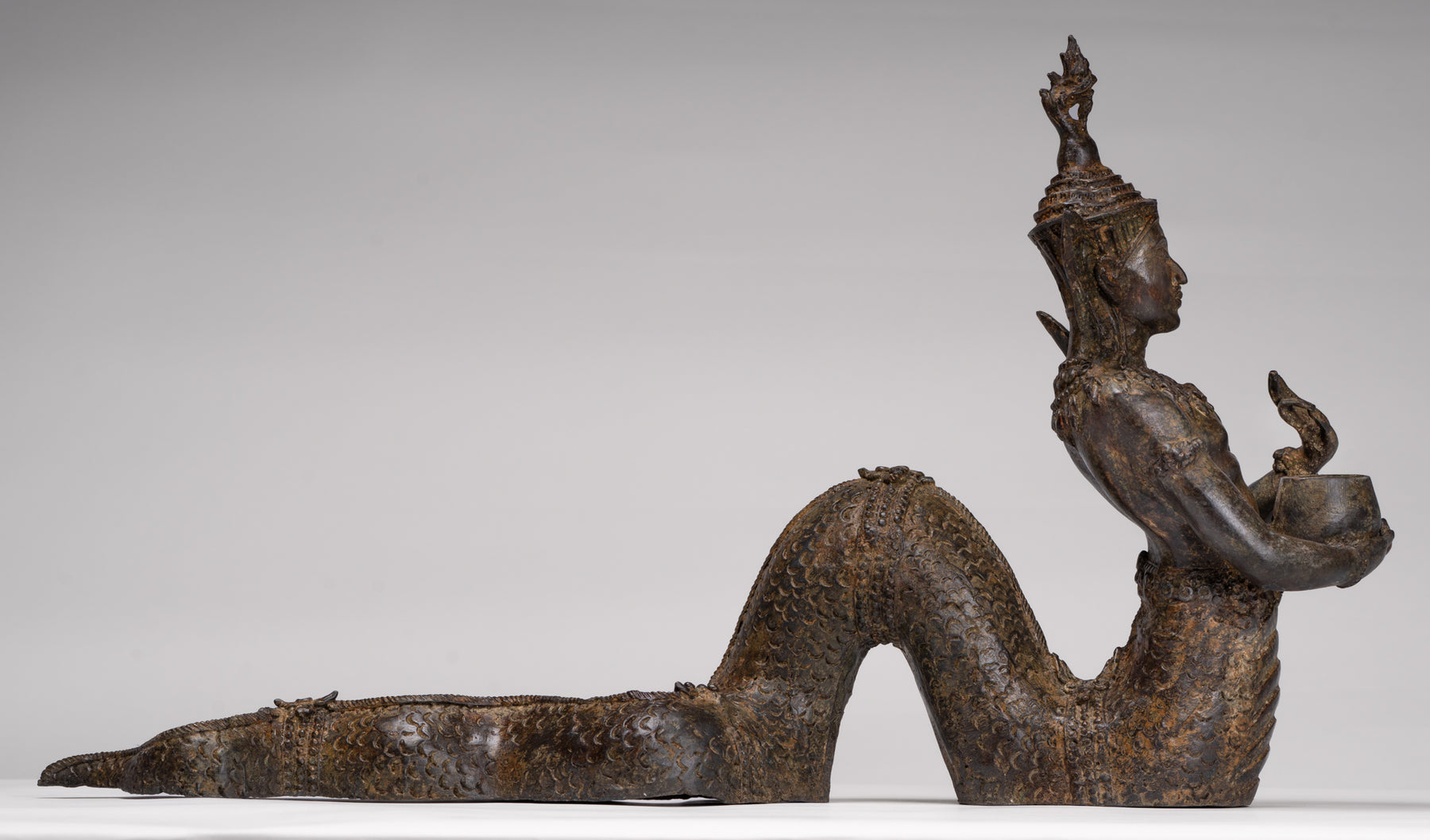 Dieser Naga -Prinz ist mit einem geschmückt Eindringlich detaillierter Kopfschmuck und trägt ausführlichen Schmuck und betont seinen königlichen und göttlichen Status. In seinen Händen hält er eine Heiliger Schiffrepräsentieren Angebote, Weisheit oder Segen. Jeder Aspekt dieser Skulptur, von den fein geätzten Skalen bis hin zu dem ruhigen und dennoch maßgeblichen Ausdruck, spiegelt die wider meisterhafte Handwerkskunst der klassischen südostasiatischen Bronzekunst.