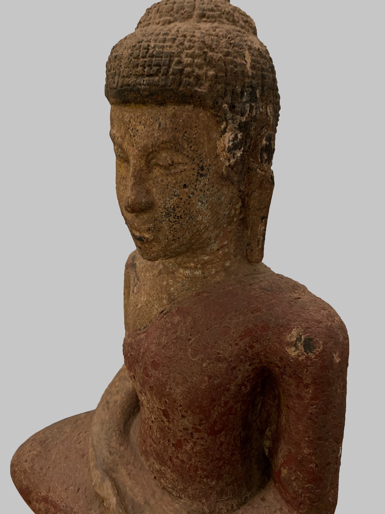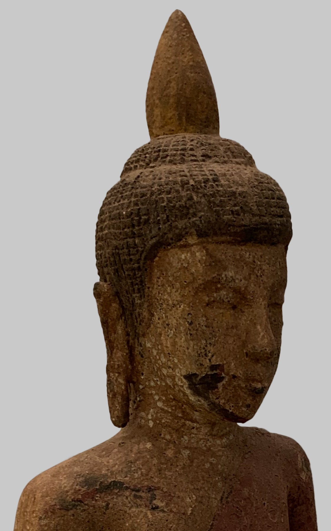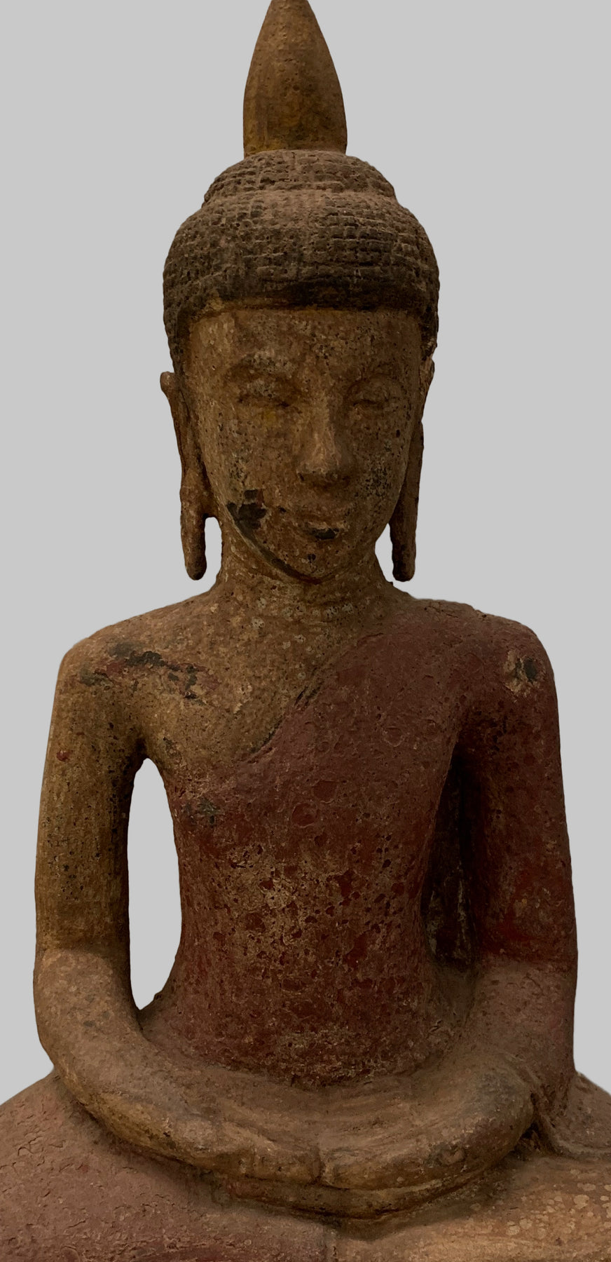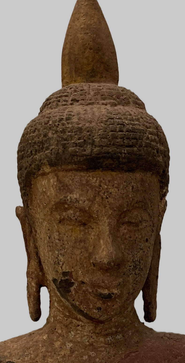 Er sitzt im halben Lotussitz und hat auf seinem Kopf eine große Ushnisha-Ausstülpung, die sein hohes Maß an spiritueller Entwicklung symbolisiert. Der Buddha hat ein friedliches Gesicht mit gesenktem, nachdenklichem Blick und einer festen Stirn. Seine Ohrläppchen sind langgestreckt, weil er als Prinz schwere goldene Ohrringe trug.