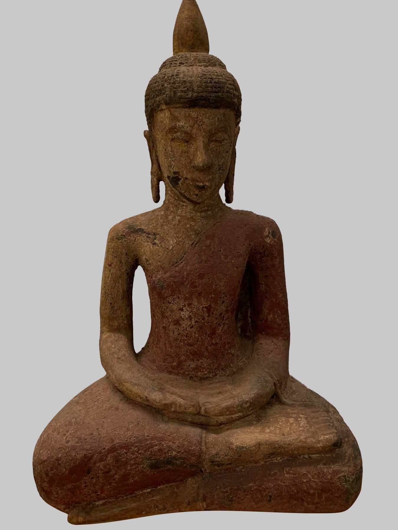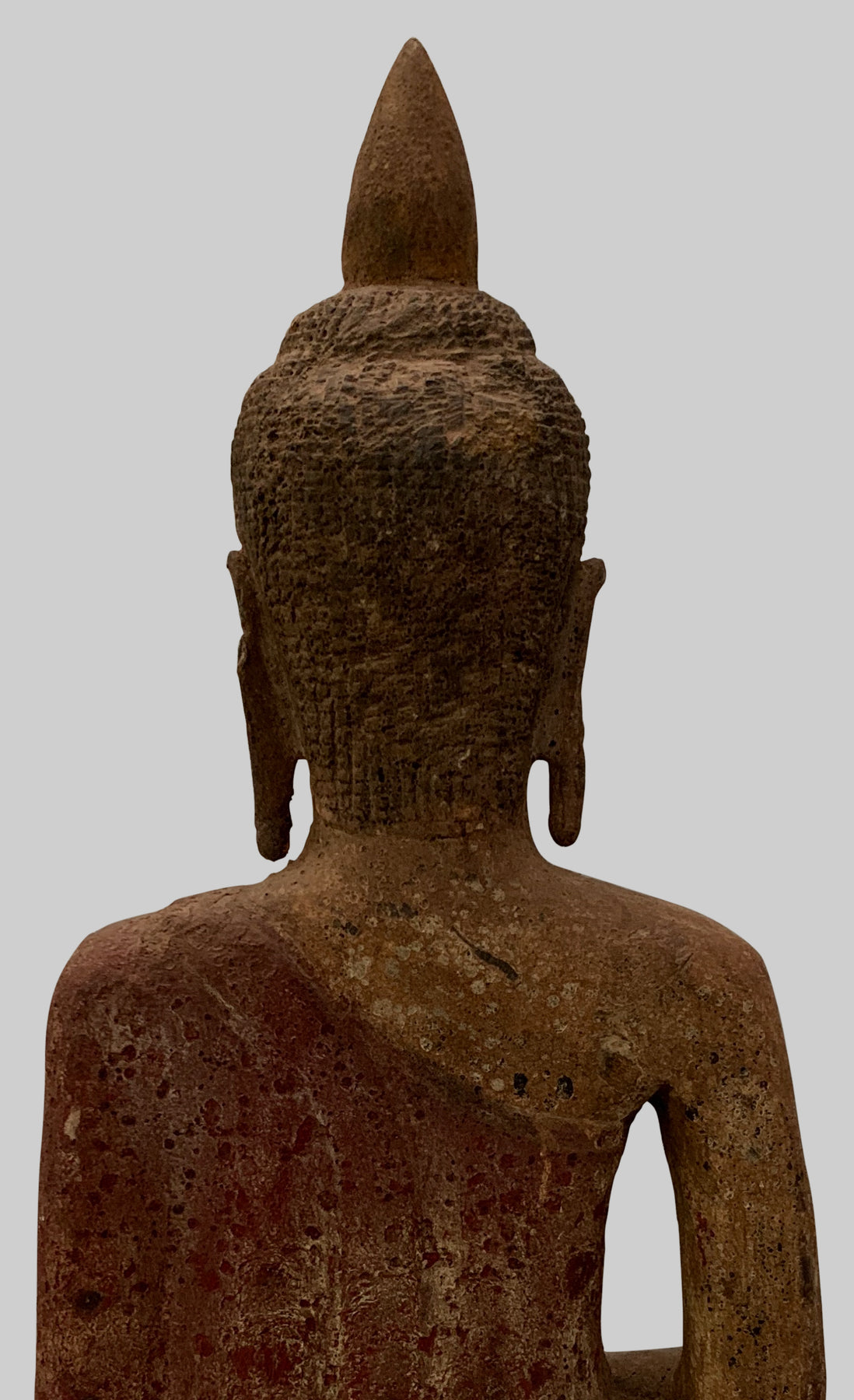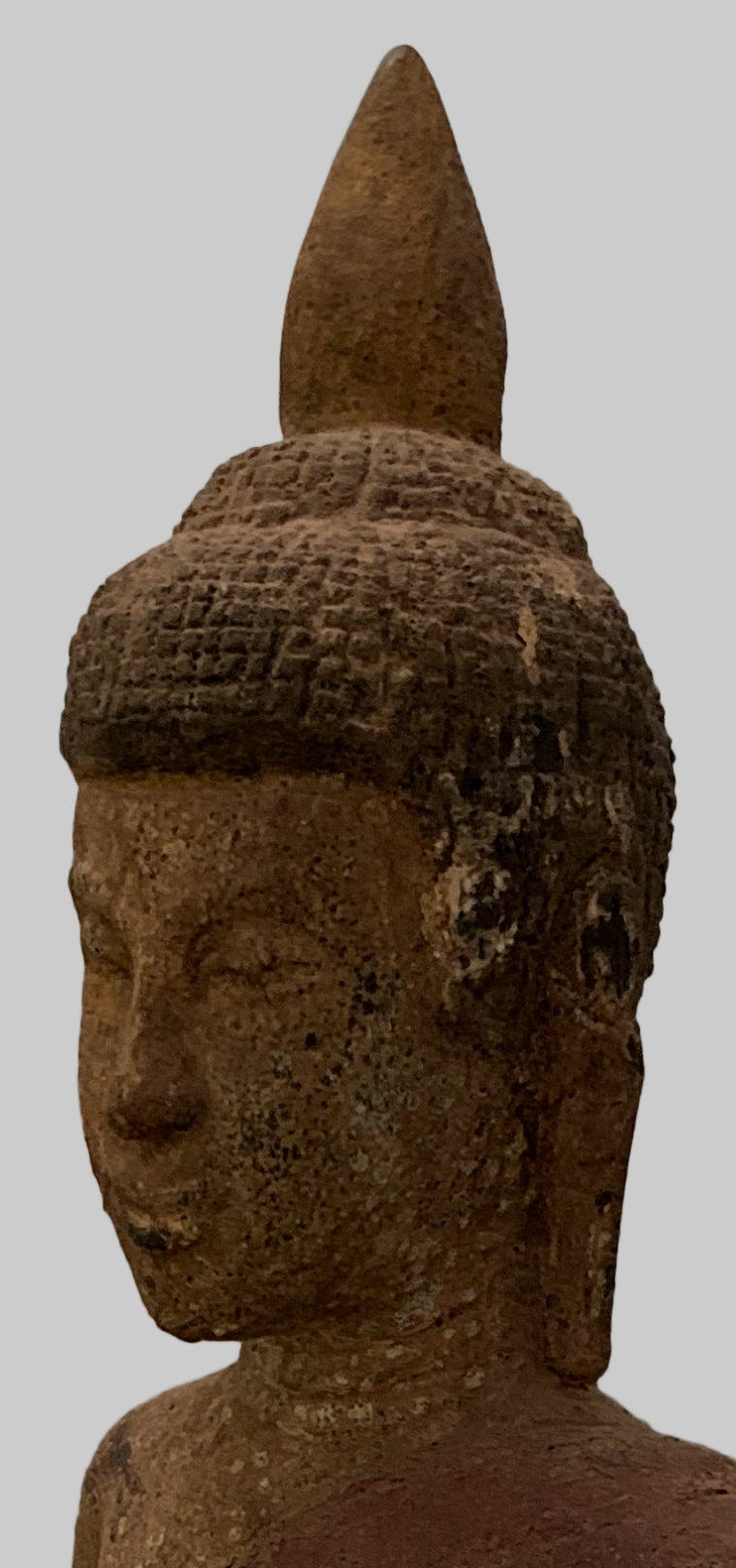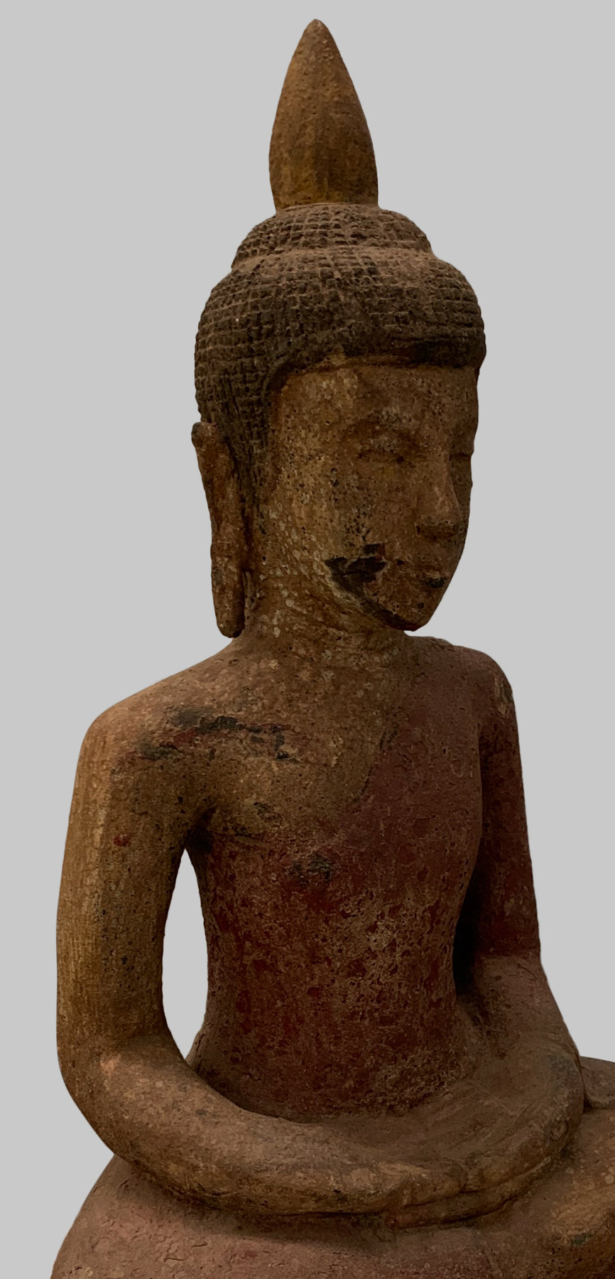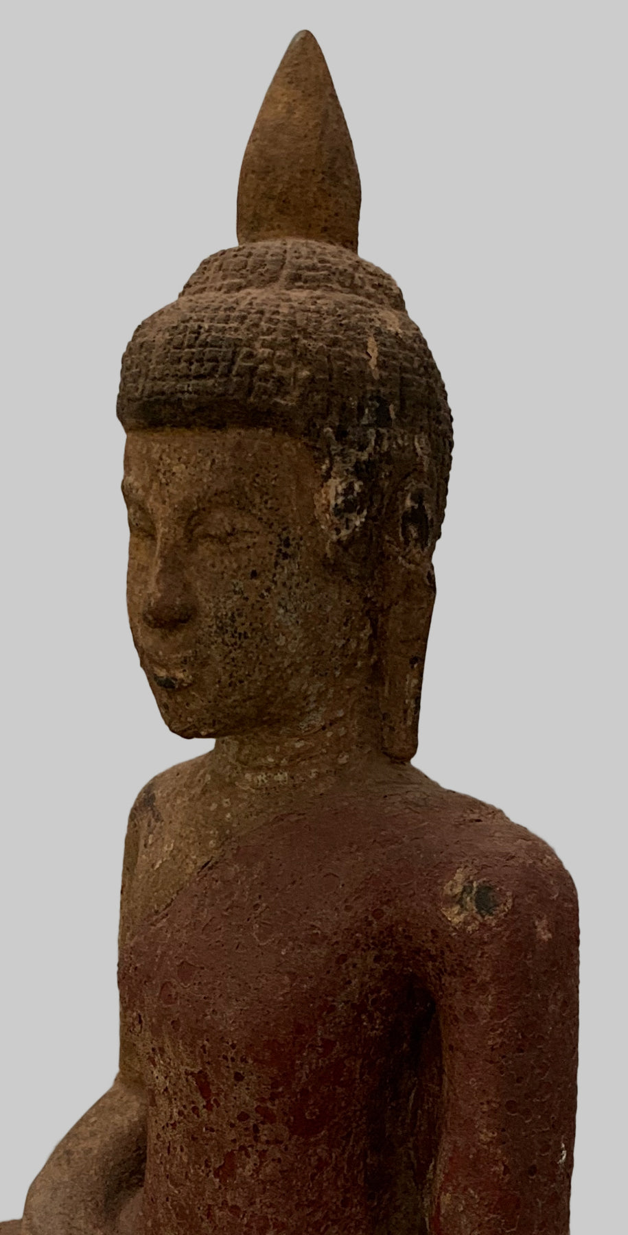 Er sitzt im halben Lotussitz und hat auf seinem Kopf eine große Ushnisha-Ausstülpung, die sein hohes Maß an spiritueller Entwicklung symbolisiert. Der Buddha hat ein friedliches Gesicht mit gesenktem, nachdenklichem Blick und einer festen Stirn. Seine Ohrläppchen sind langgestreckt, weil er als Prinz schwere goldene Ohrringe trug.