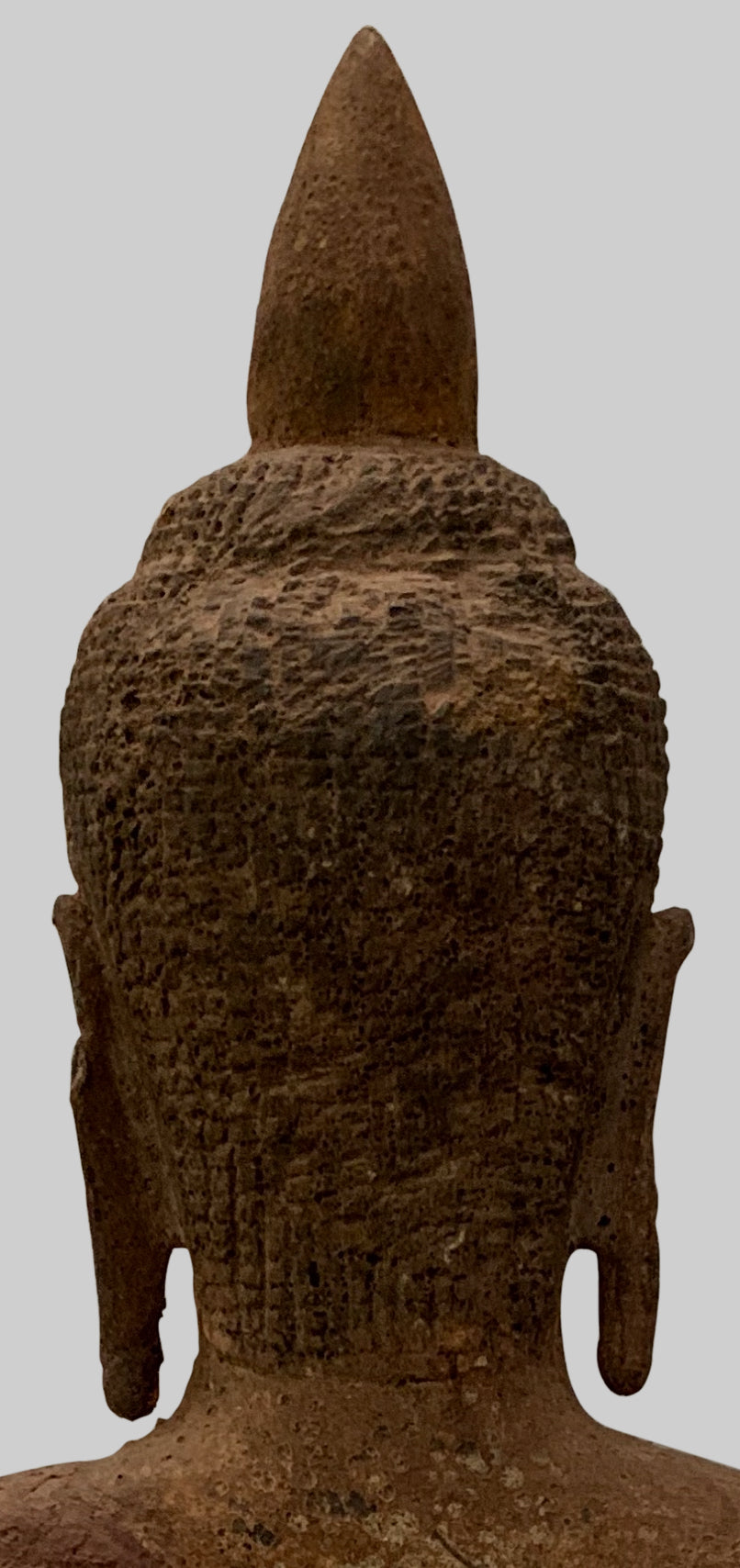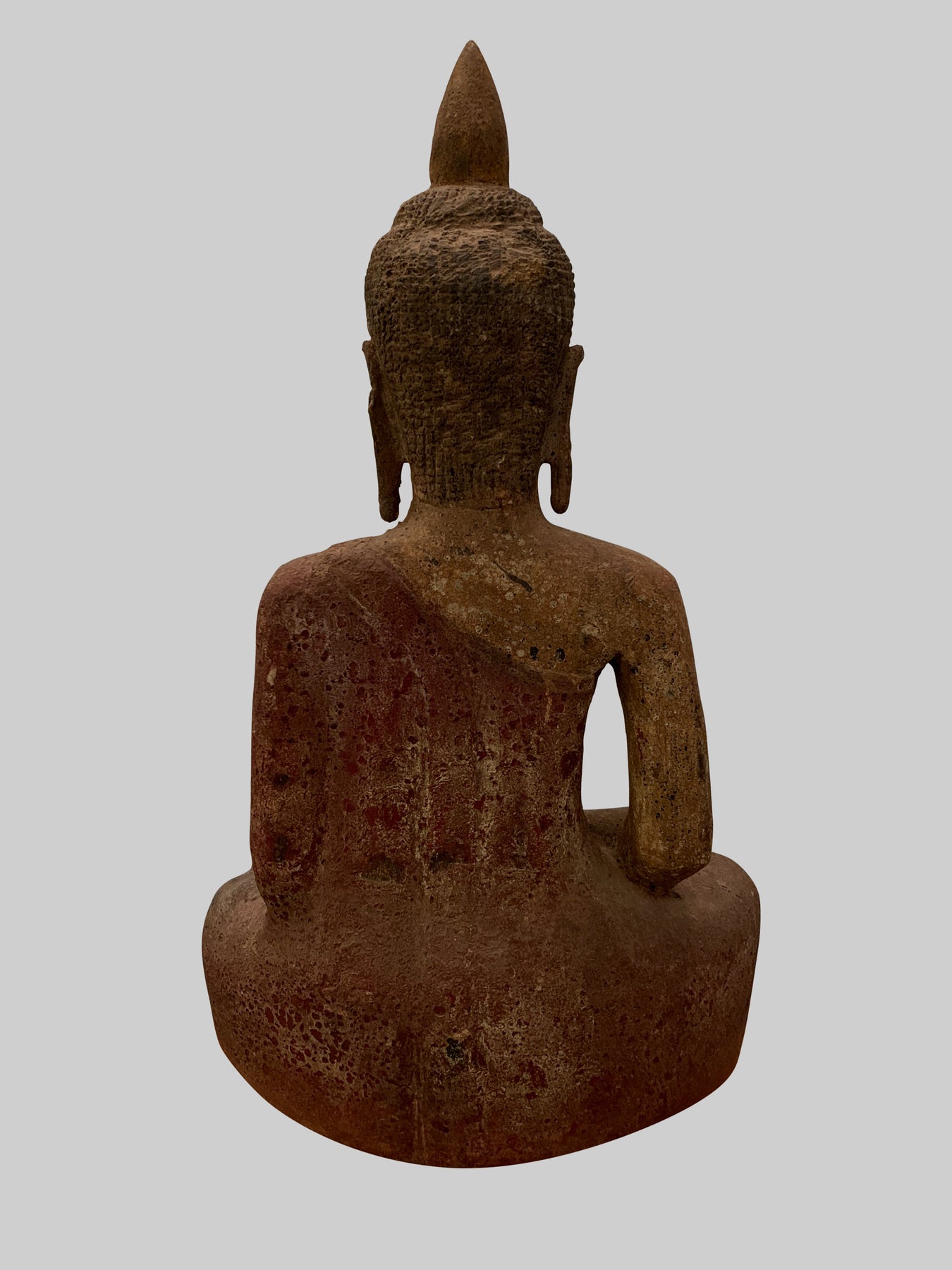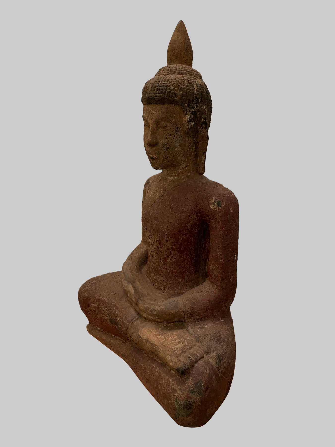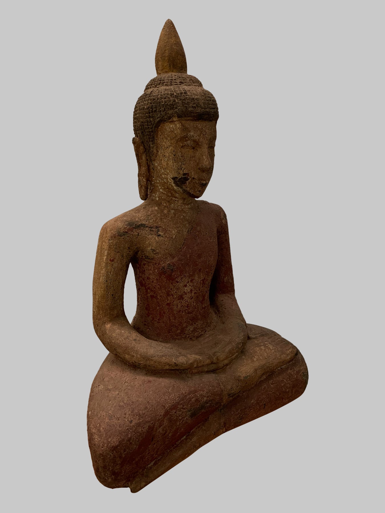 Er sitzt im halben Lotussitz und hat auf seinem Kopf eine große Ushnisha-Ausstülpung, die sein hohes Maß an spiritueller Entwicklung symbolisiert. Der Buddha hat ein friedliches Gesicht mit gesenktem, nachdenklichem Blick und einer festen Stirn. Seine Ohrläppchen sind langgestreckt, weil er als Prinz schwere goldene Ohrringe trug.