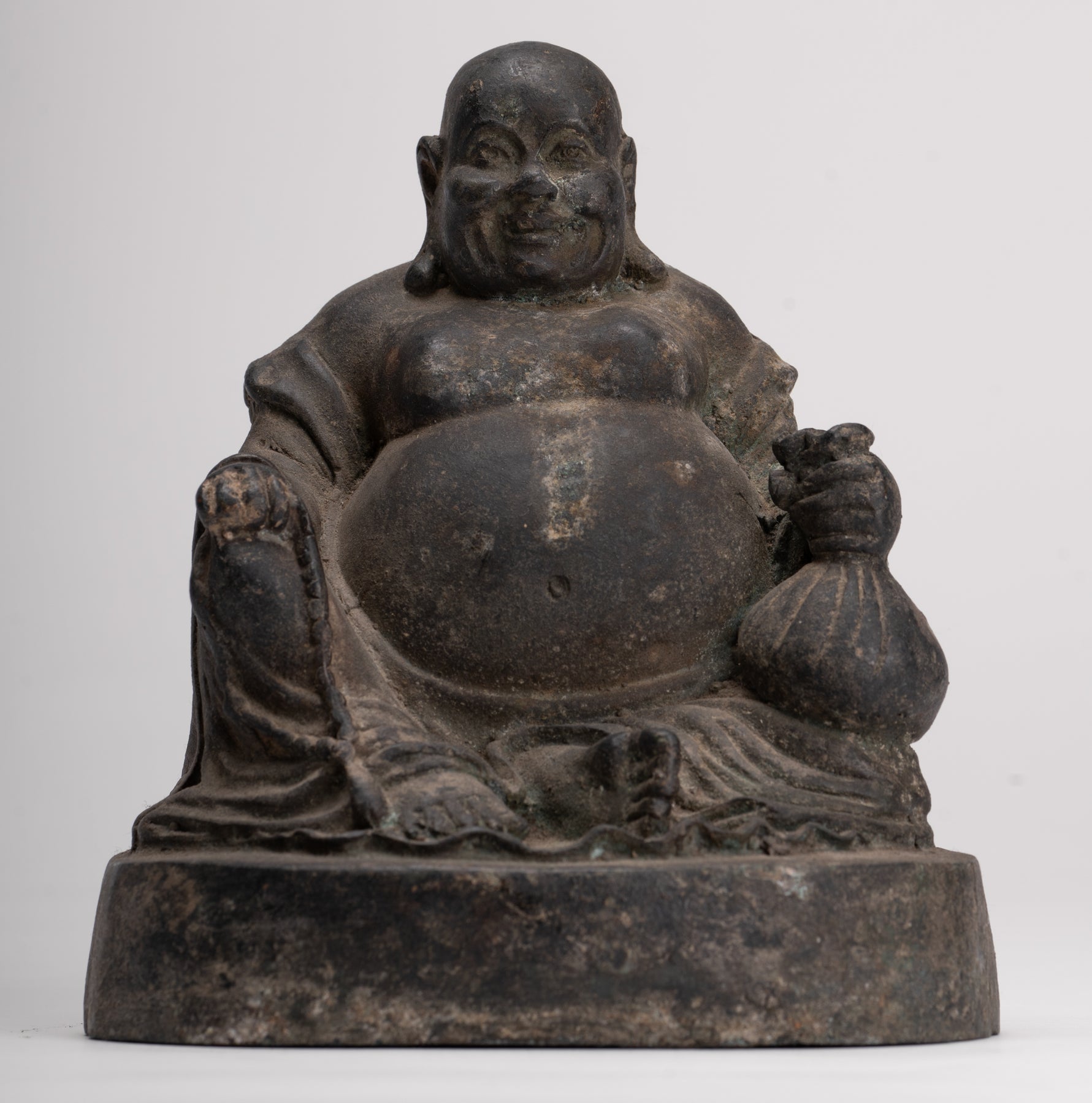 Ein antiker lachender Buddha oder Budai aus Bronze im chinesischen Stil. Der Buddha hat ein friedliches Gesicht mit gesenktem, nachdenklichem Blick und einer festen Stirn. Seine Ohrläppchen sind langgestreckt, weil er als Prinz schwere goldene Ohrringe trug.