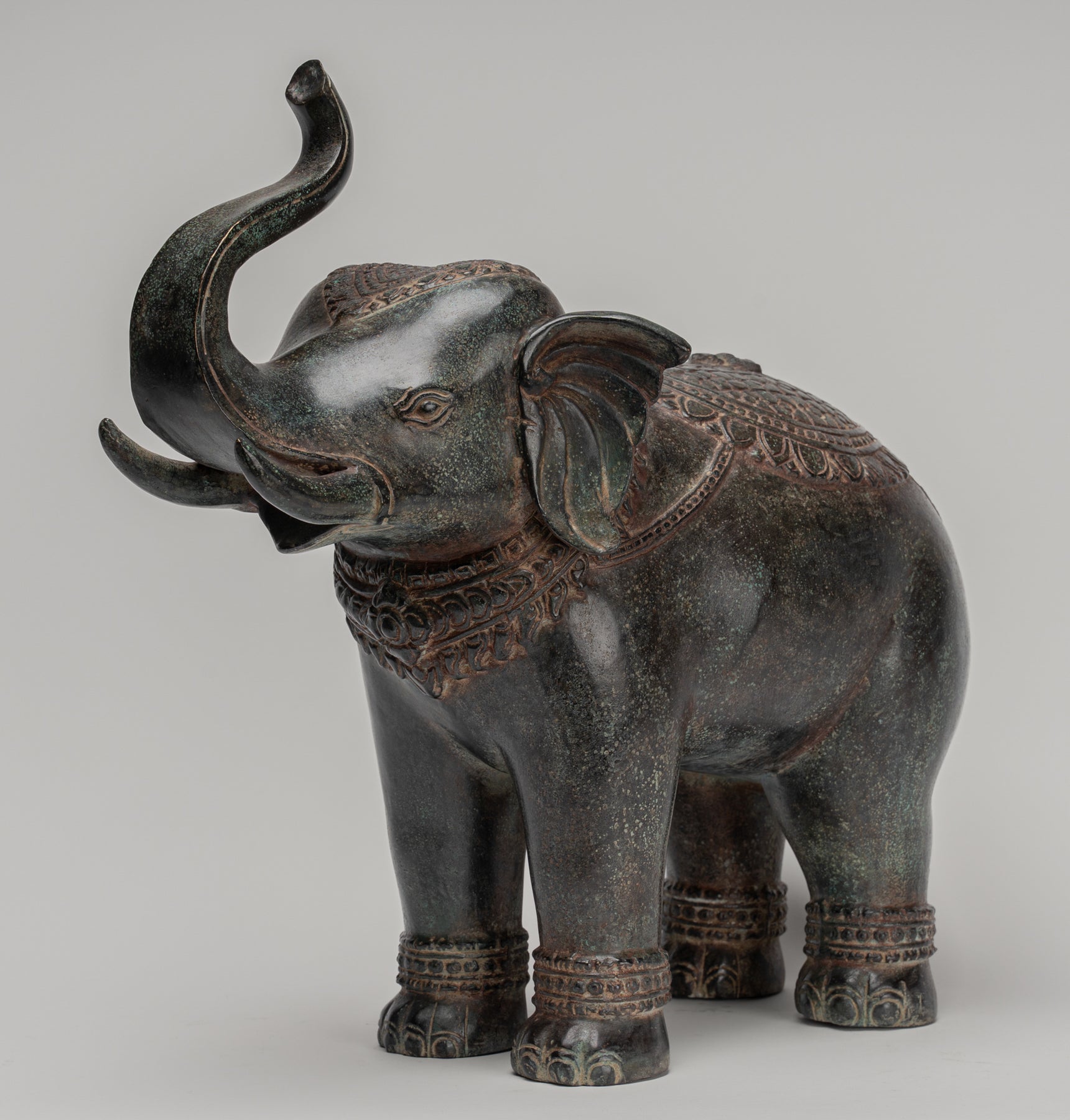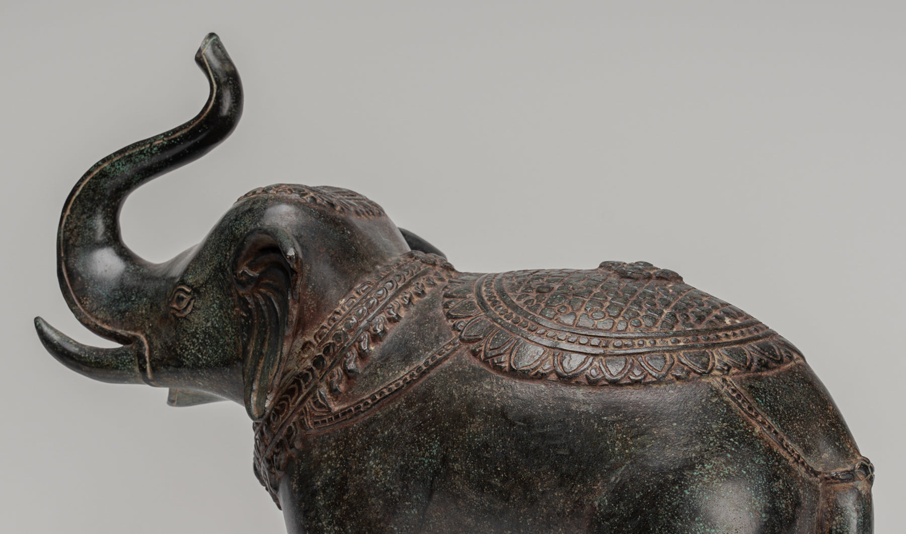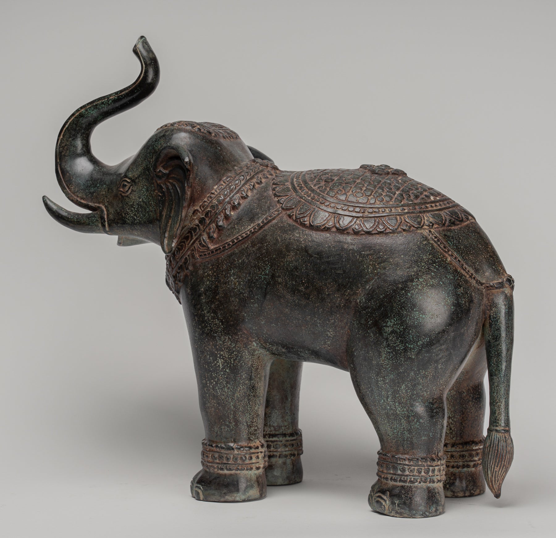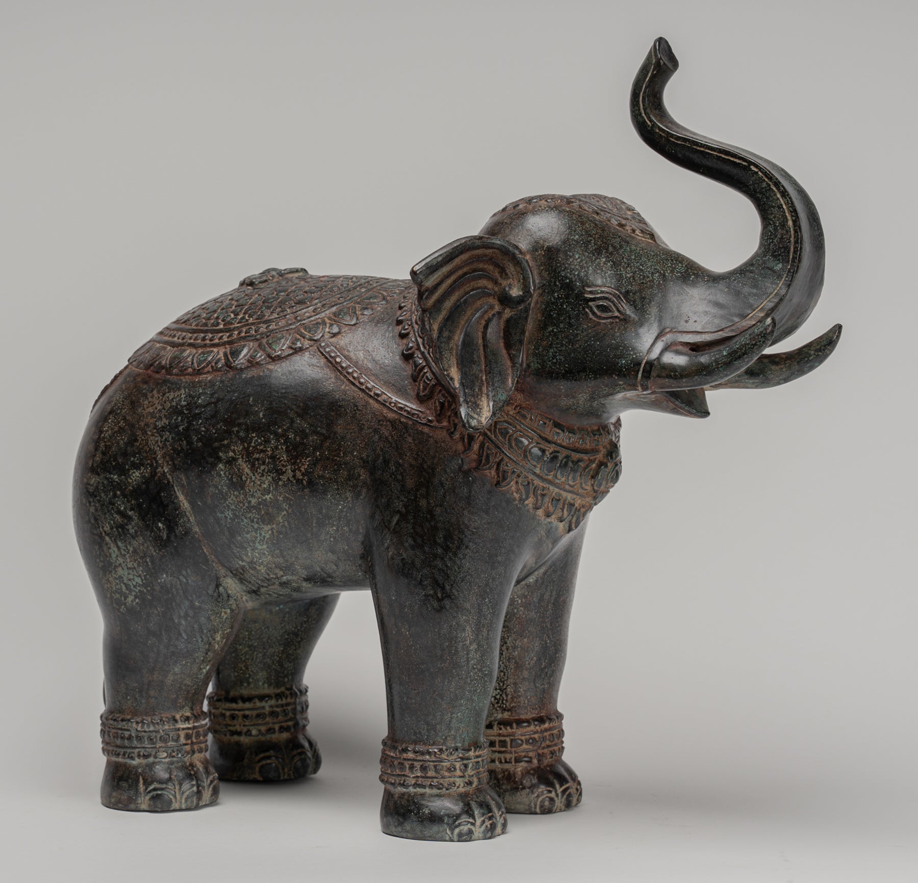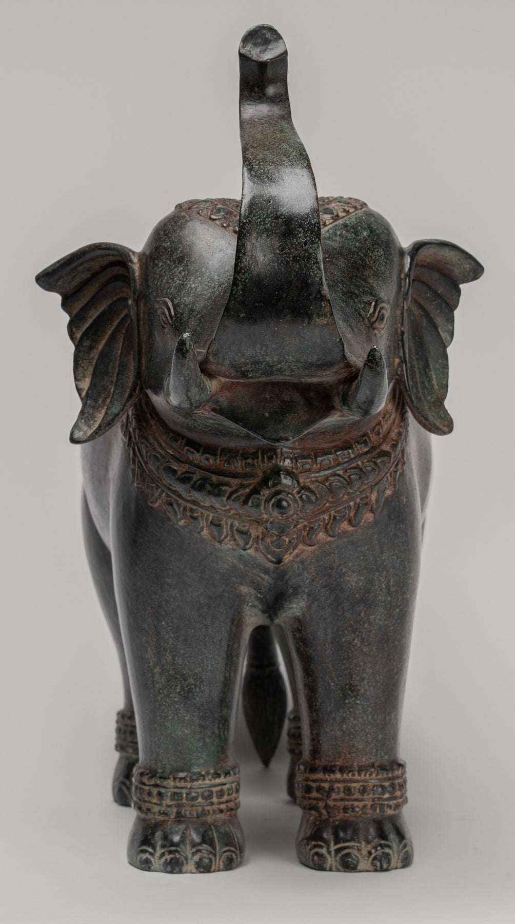 Eine antike Bronze -Elefantenstatue im Khmer -Stil. Der Elefant ist mit seinem Kofferraum in einer Geste des Goodwills gestanden.