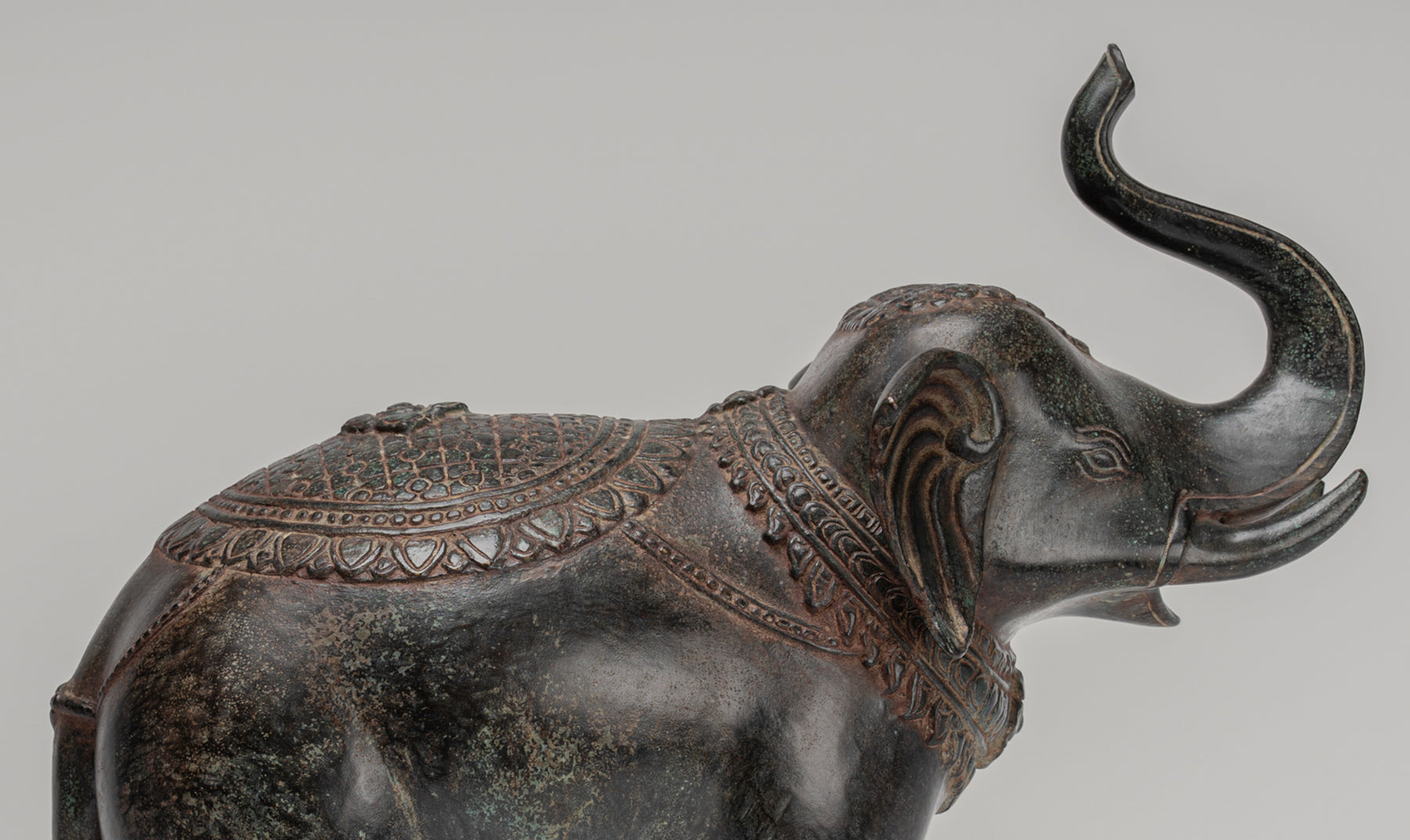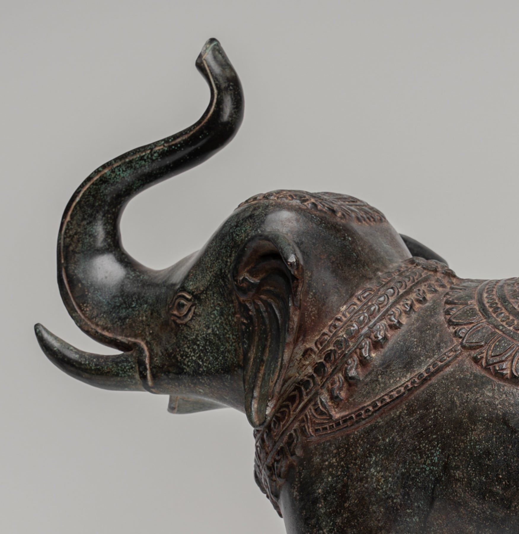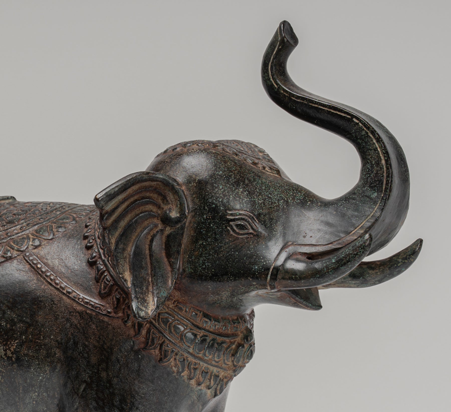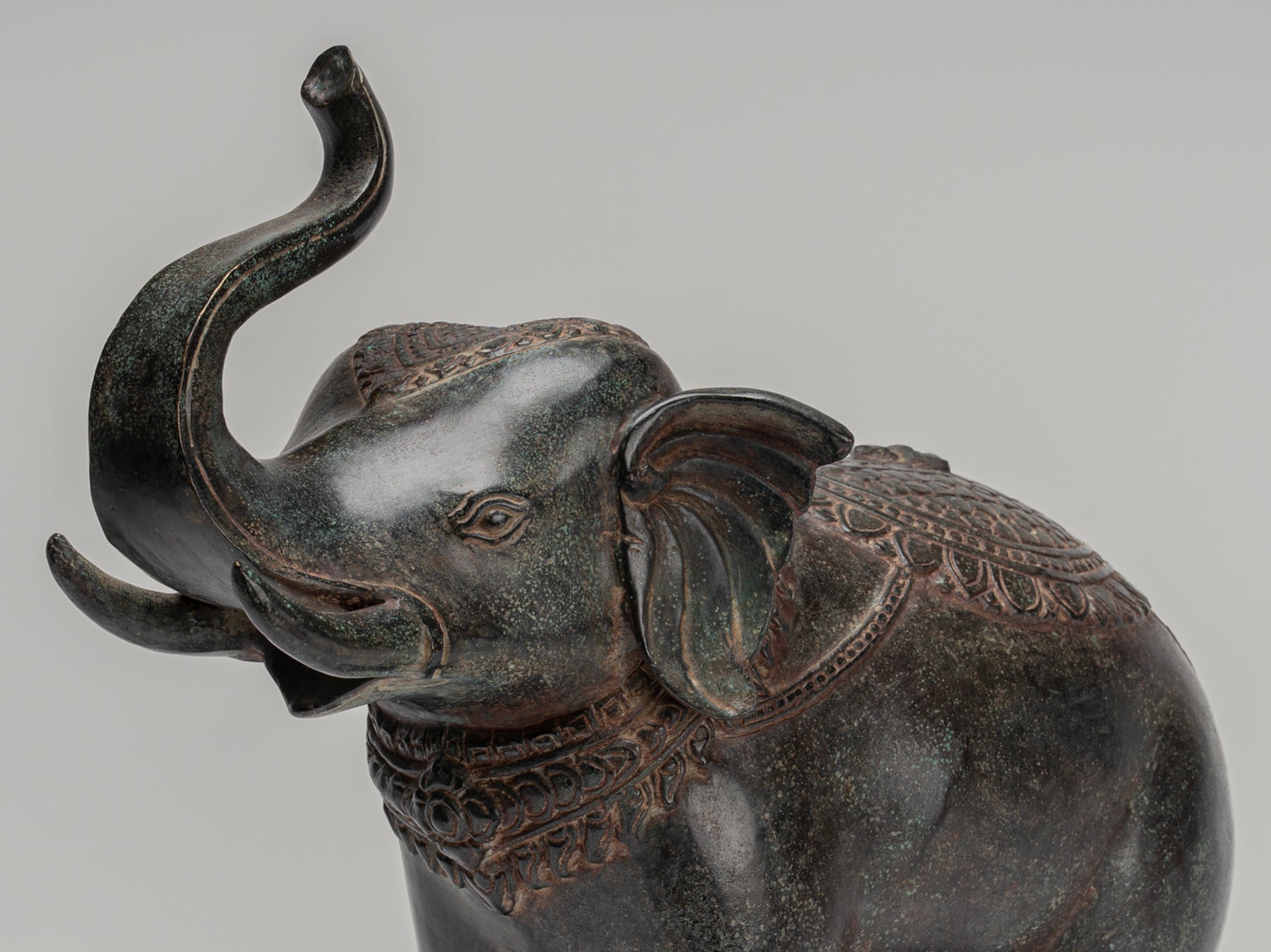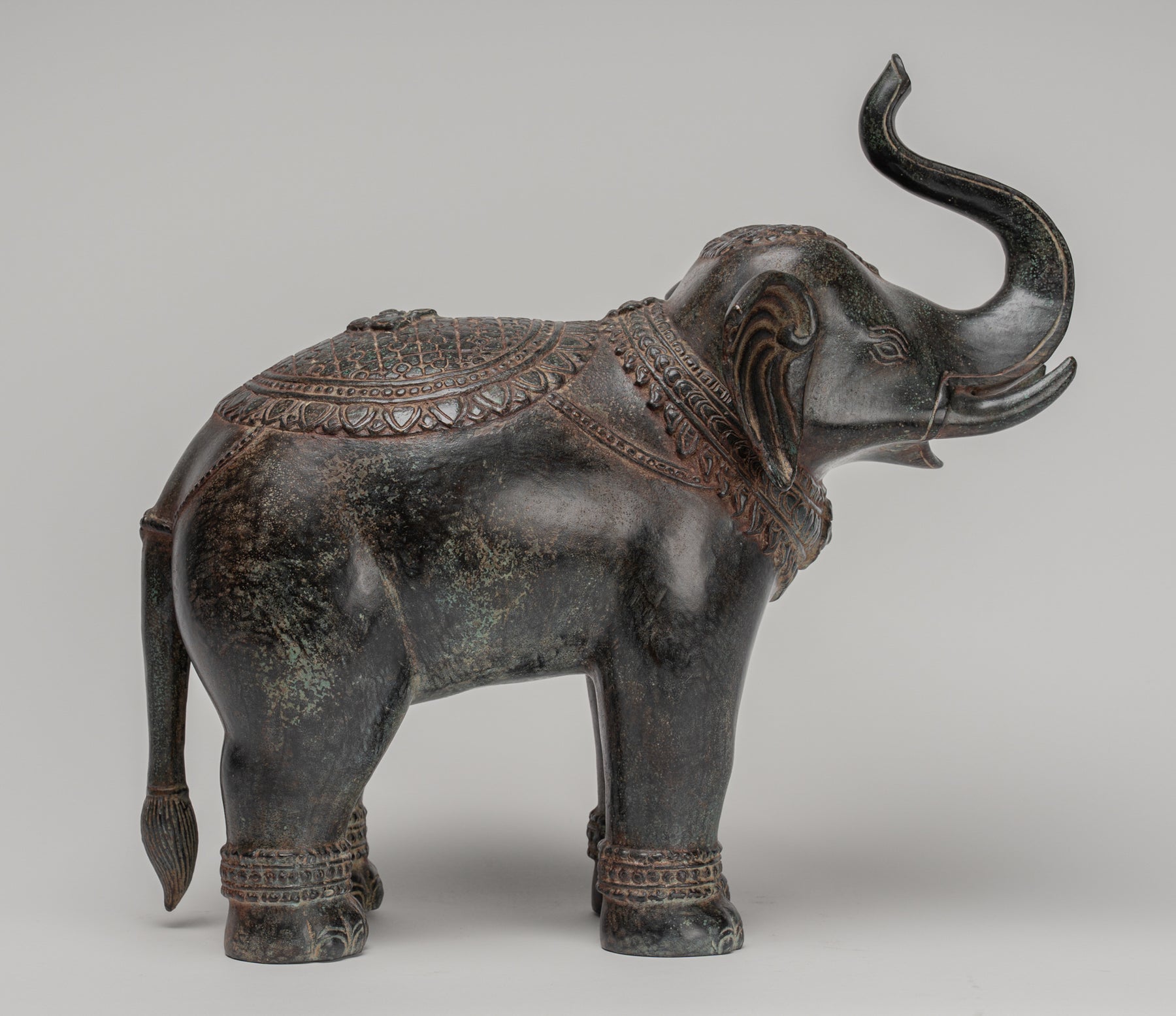 Eine antike Bronze -Elefantenstatue im Khmer -Stil. Der Elefant ist mit seinem Kofferraum in einer Geste des Goodwills gestanden.