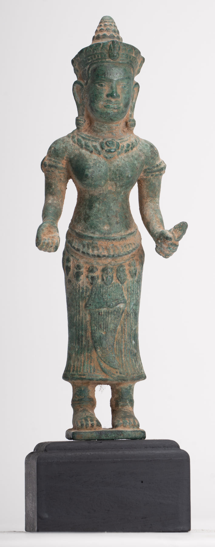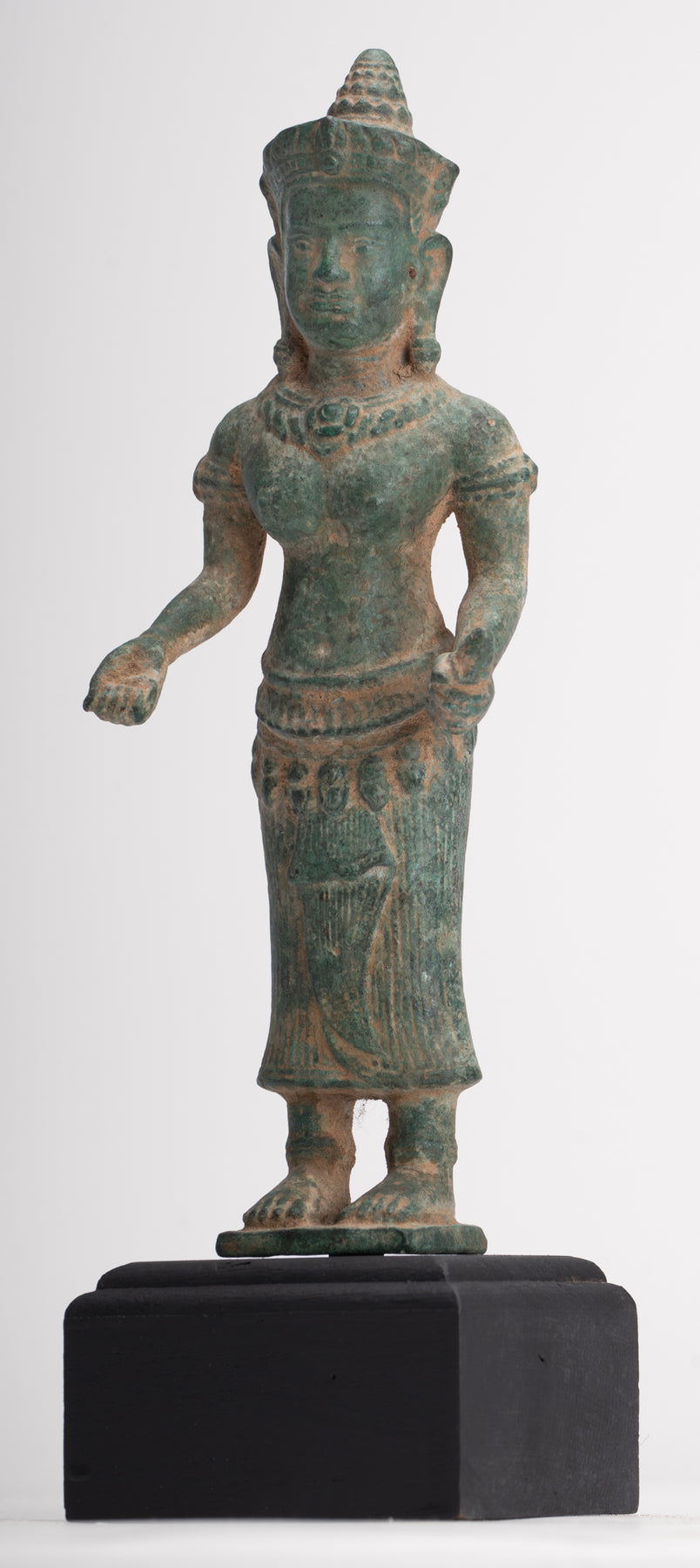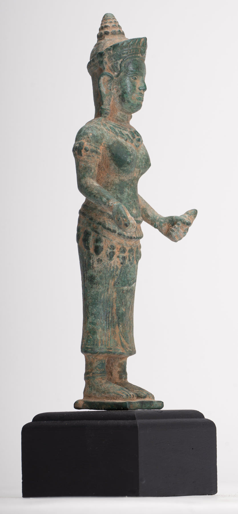 - Antike Bayon-Lakshmi-Statue im Khmer-Stil / Devi-Gemahlin von Vishnu – 37 cm/15 Zoll Maße: (Höhe) 37 cm Antike Lakshmi-, Devi- oder Göttinnenstatue im Khmer-Stil im Bayon-Stil des späten 12. und frühen 13. Jahrhunderts. Lakshmi steht auf einem einfachen rechteckigen Sockel. Sie ist mit einem langen, plissierten Sampot und einem Lotusblumengürtel bekleidet. Das Haar wird mit einem Perlenband zu einem runden Dutt zusammengebunden. Sie steht mit ihren Händen im Abhaya oder Schutz-Mudra und im Dharmachakra oder Lehr-Mudra. Lakshmi ist die hinduistische Göttin des Reichtums, des Wohlstands (sowohl materiell als auch spirituell), des Lichts, der Weisheit, des Glücks, der Fruchtbarkeit, der Großzügigkeit und des Mutes. Die Verkörperung von Schönheit, Anmut und Charme. Sie wird auch Mahalakshmi genannt und soll Glück bringen und ihre Anhänger vor allen Arten von Elend und Geldsorgen schützen. Besonders ansprechend sind die azurblaue Patina und die Details dieses Stücks. Dieses traditionell aussehende Stück verleiht jedem Raum Ihres Zuhauses oder Arbeitsplatzes mit Sicherheit eine einzigartige Note. Diese Darstellung der Gemahlin von Vishnu ist eine der bekanntesten asiatischen Gottheiten und wird Ihr Zuhause mit unendlich zeitlosem Stil erhellen. ZUFRIEDENHEITSGARANTIE – Wir bieten seit vielen Jahren asiatische Kunst über unsere Website und eBay an und sind stolz auf den Ruf, den wir für faire und ehrliche Angebote erworben haben. Sollten Sie jedoch aus irgendeinem Grund mit Ihrem Kauf unzufrieden sein, teilen Sie uns dies bitte einfach mit und wir erstatten Ihnen den vollen Kaufpreis. Wir möchten, dass Sie mit Ihrem Kauf 100 % zufrieden sind. Dieses traditionell aussehende Stück bringt mit Sicherheit Ruhe in Ihr Zuhause, Ihr Büro oder Ihren heiligen Ort. Wir haben weitere antike asiatische Statuen im Angebot. Bitte schauen Sie sich unsere anderen Angebote an, wo wir weitere schöne asiatische Stücke zur Verfügung haben. Für noch schönere asiatische Kunst – www.hdasianart.com Gerne weltweit versenden. Bitte senden Sie eine E-Mail für bestätigte internationale Kurierpreise in Ihr Land. Bei Mehrfachkäufen gelten Portorabatte. Bitte senden Sie uns bei Fragen eine E-Mail. Bitte senden Sie eine E-Mail mit Handelsanfragen. Danke für Ihr Interesse. HD Asian Art SCBR2790