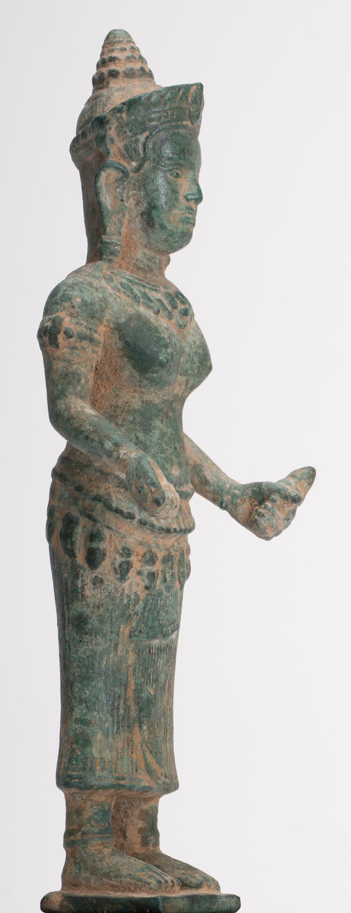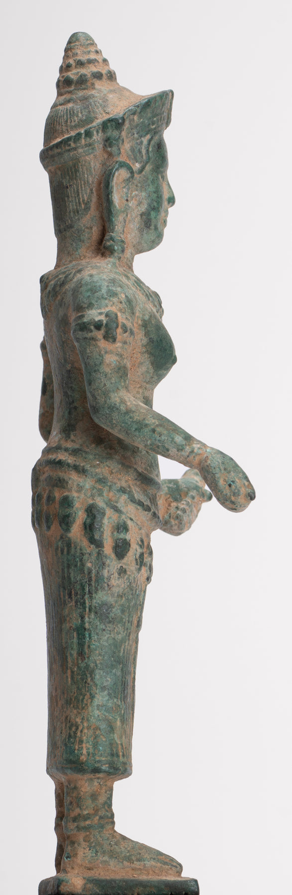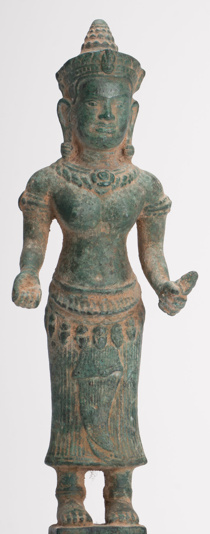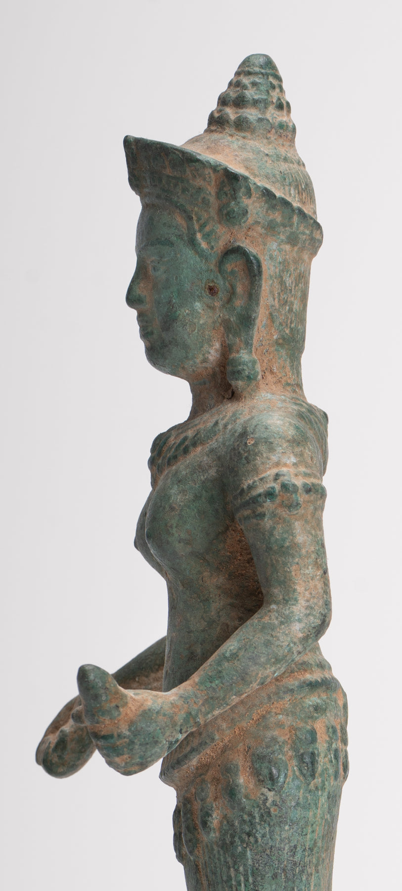 - Antike Bayon-Lakshmi-Statue im Khmer-Stil / Devi-Gemahlin von Vishnu – 37 cm/15 Zoll Maße: (Höhe) 37 cm Antike Lakshmi-, Devi- oder Göttinnenstatue im Khmer-Stil im Bayon-Stil des späten 12. und frühen 13. Jahrhunderts. Lakshmi steht auf einem einfachen rechteckigen Sockel. Sie ist mit einem langen, plissierten Sampot und einem Lotusblumengürtel bekleidet. Das Haar wird mit einem Perlenband zu einem runden Dutt zusammengebunden. Sie steht mit ihren Händen im Abhaya oder Schutz-Mudra und im Dharmachakra oder Lehr-Mudra. Lakshmi ist die hinduistische Göttin des Reichtums, des Wohlstands (sowohl materiell als auch spirituell), des Lichts, der Weisheit, des Glücks, der Fruchtbarkeit, der Großzügigkeit und des Mutes. Die Verkörperung von Schönheit, Anmut und Charme. Sie wird auch Mahalakshmi genannt und soll Glück bringen und ihre Anhänger vor allen Arten von Elend und Geldsorgen schützen. Besonders ansprechend sind die azurblaue Patina und die Details dieses Stücks. Dieses traditionell aussehende Stück verleiht jedem Raum Ihres Zuhauses oder Arbeitsplatzes mit Sicherheit eine einzigartige Note. Diese Darstellung der Gemahlin von Vishnu ist eine der bekanntesten asiatischen Gottheiten und wird Ihr Zuhause mit unendlich zeitlosem Stil erhellen. ZUFRIEDENHEITSGARANTIE – Wir bieten seit vielen Jahren asiatische Kunst über unsere Website und eBay an und sind stolz auf den Ruf, den wir für faire und ehrliche Angebote erworben haben. Sollten Sie jedoch aus irgendeinem Grund mit Ihrem Kauf unzufrieden sein, teilen Sie uns dies bitte einfach mit und wir erstatten Ihnen den vollen Kaufpreis. Wir möchten, dass Sie mit Ihrem Kauf 100 % zufrieden sind. Dieses traditionell aussehende Stück bringt mit Sicherheit Ruhe in Ihr Zuhause, Ihr Büro oder Ihren heiligen Ort. Wir haben weitere antike asiatische Statuen im Angebot. Bitte schauen Sie sich unsere anderen Angebote an, wo wir weitere schöne asiatische Stücke zur Verfügung haben. Für noch schönere asiatische Kunst – www.hdasianart.com Gerne weltweit versenden. Bitte senden Sie eine E-Mail für bestätigte internationale Kurierpreise in Ihr Land. Bei Mehrfachkäufen gelten Portorabatte. Bitte senden Sie uns bei Fragen eine E-Mail. Bitte senden Sie eine E-Mail mit Handelsanfragen. Danke für Ihr Interesse. HD Asian Art SCBR2790