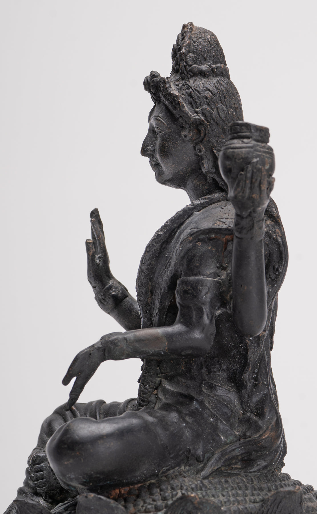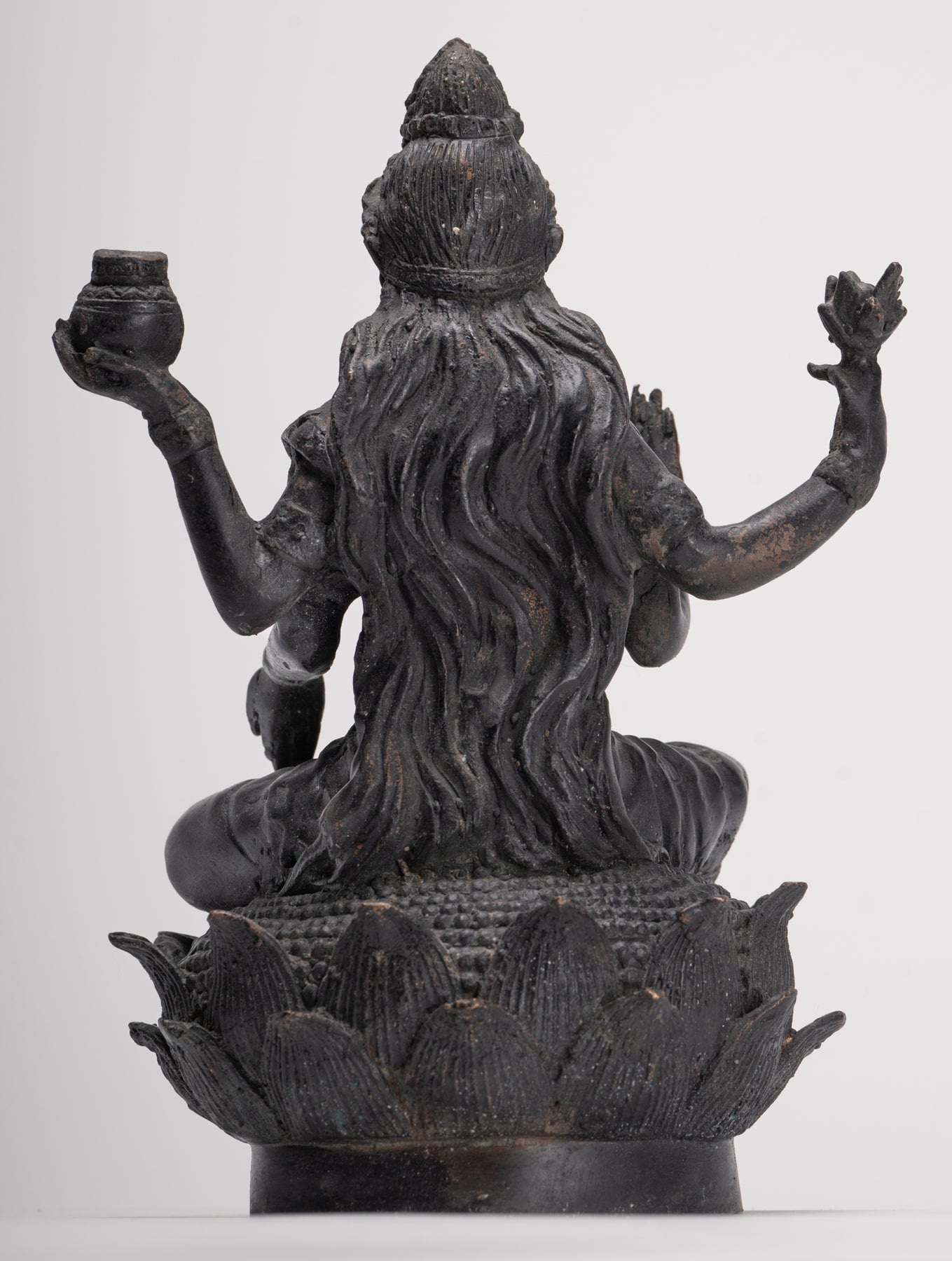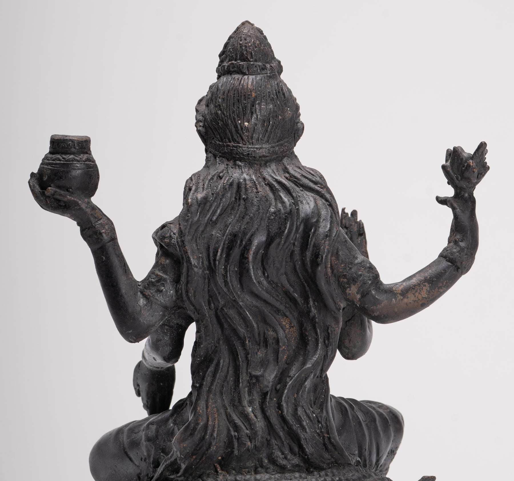 Ein sitzender Shiva im antiken indischen Stil. Shiva sitzt auf einem Lotusblütensockel, sein Fuß ruht auf einer Lotusblüte. Die Lotusblume steht für Reinheit, Mitgefühl und das Schenken großer Freude an alle.