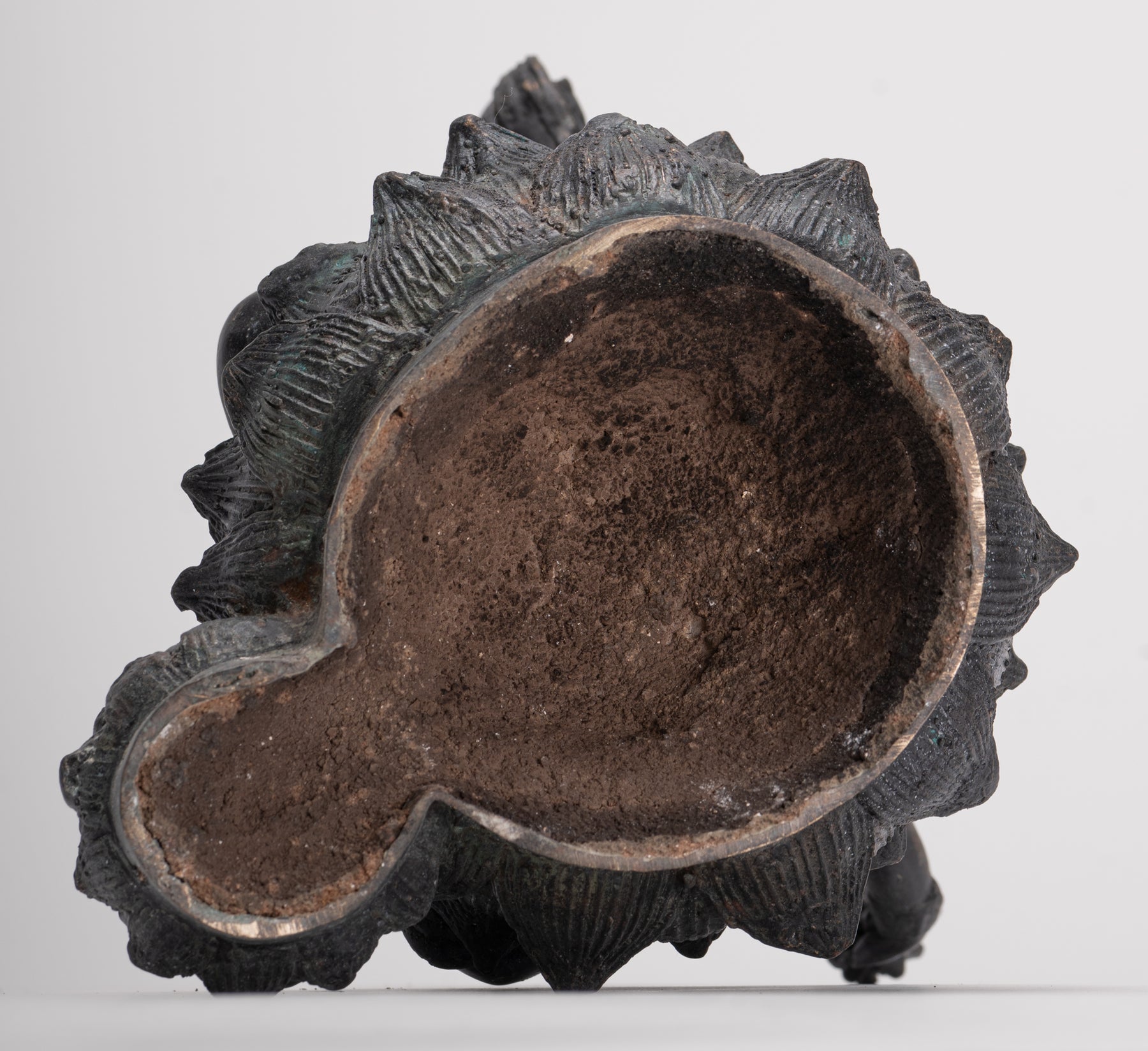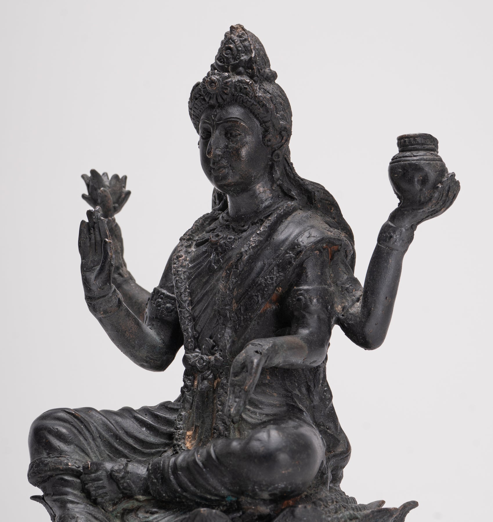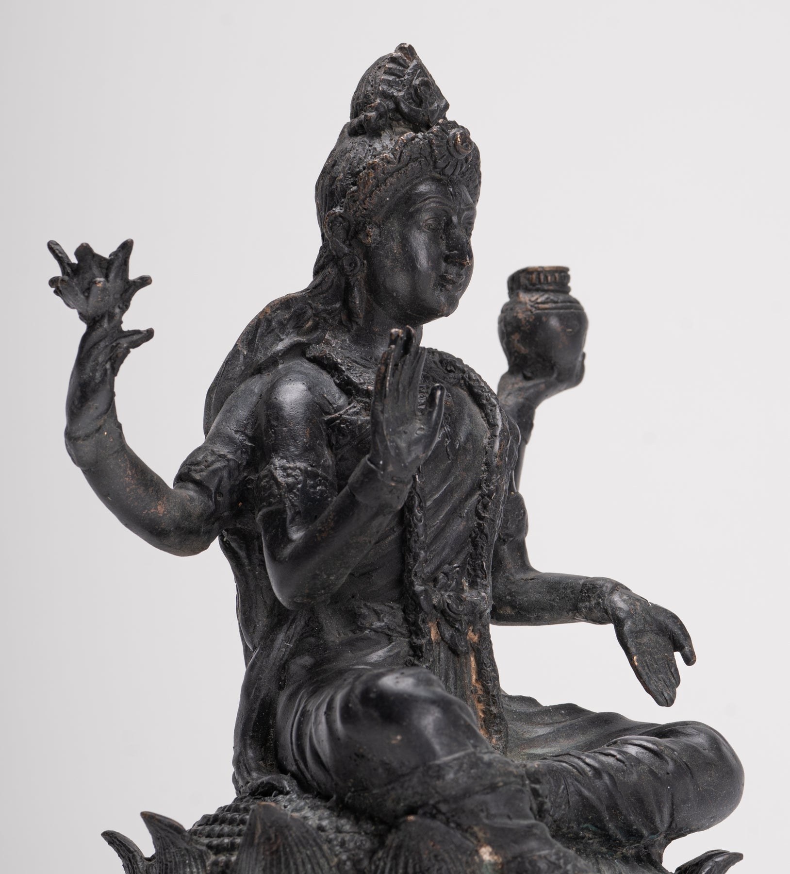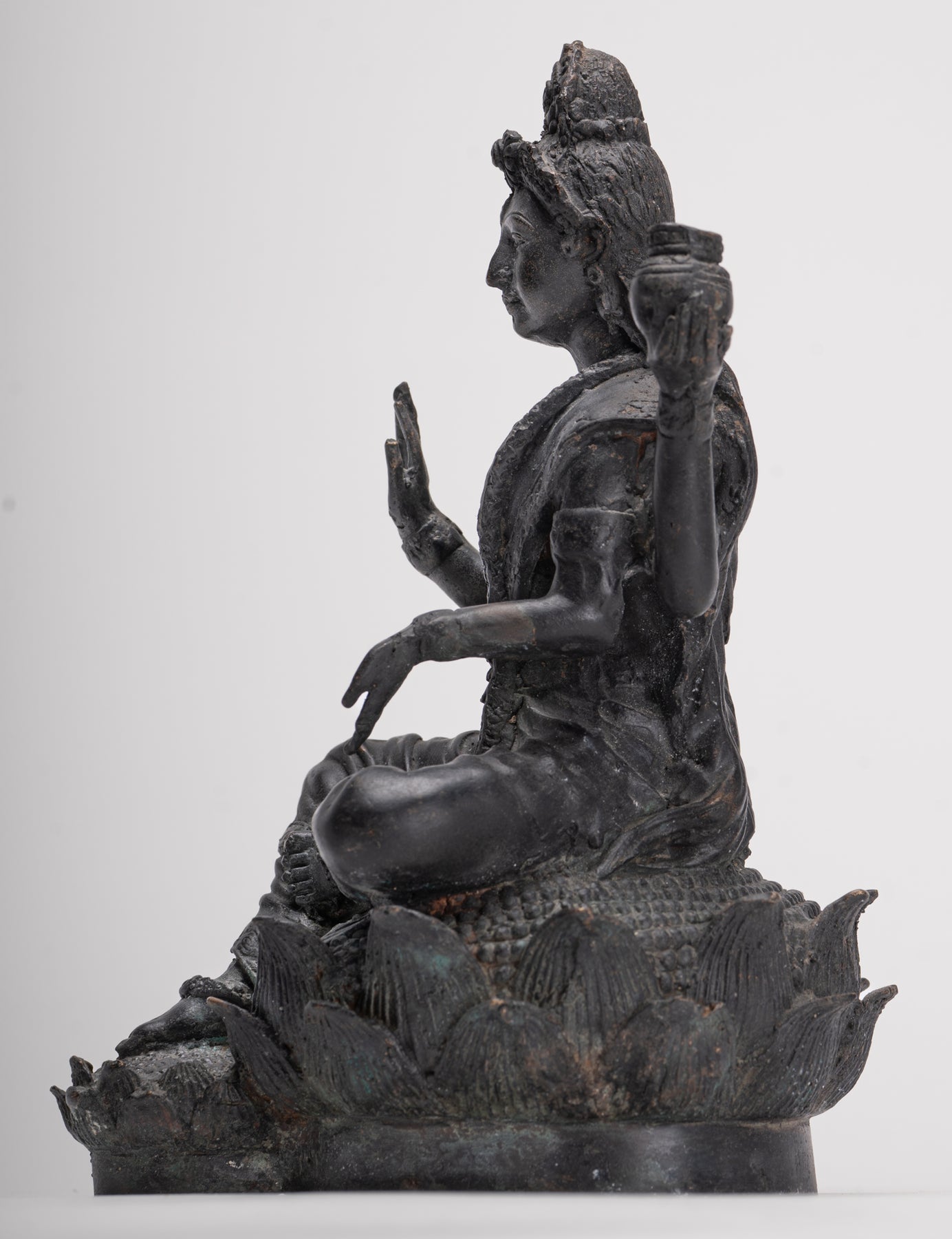 Ein sitzender Shiva im antiken indischen Stil. Shiva sitzt auf einem Lotusblütensockel, sein Fuß ruht auf einer Lotusblüte. Die Lotusblume steht für Reinheit, Mitgefühl und das Schenken großer Freude an alle.