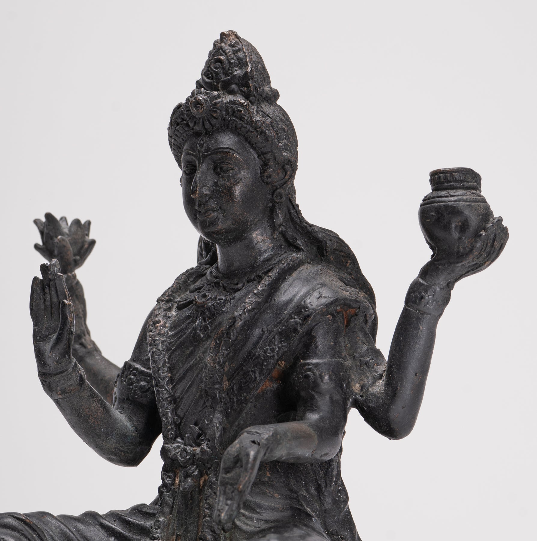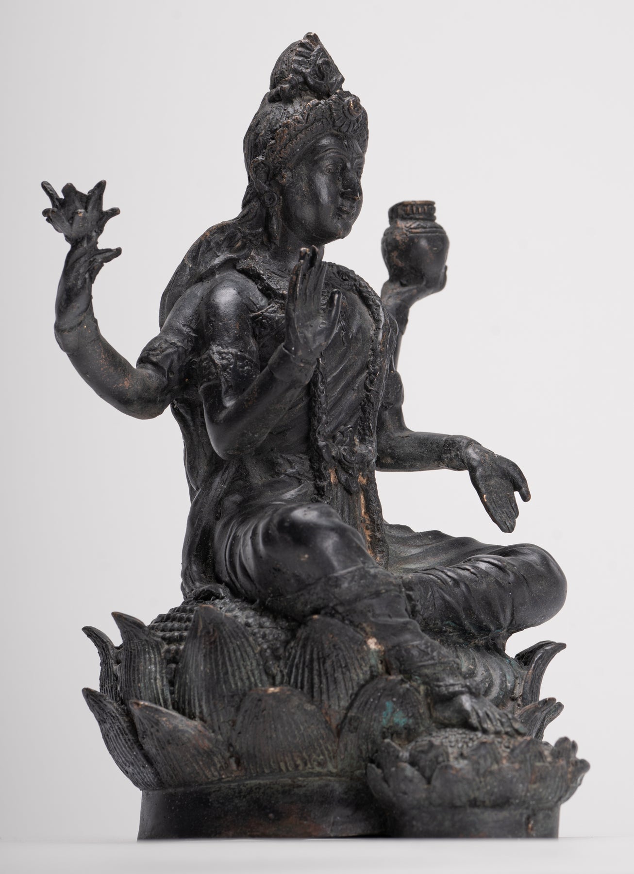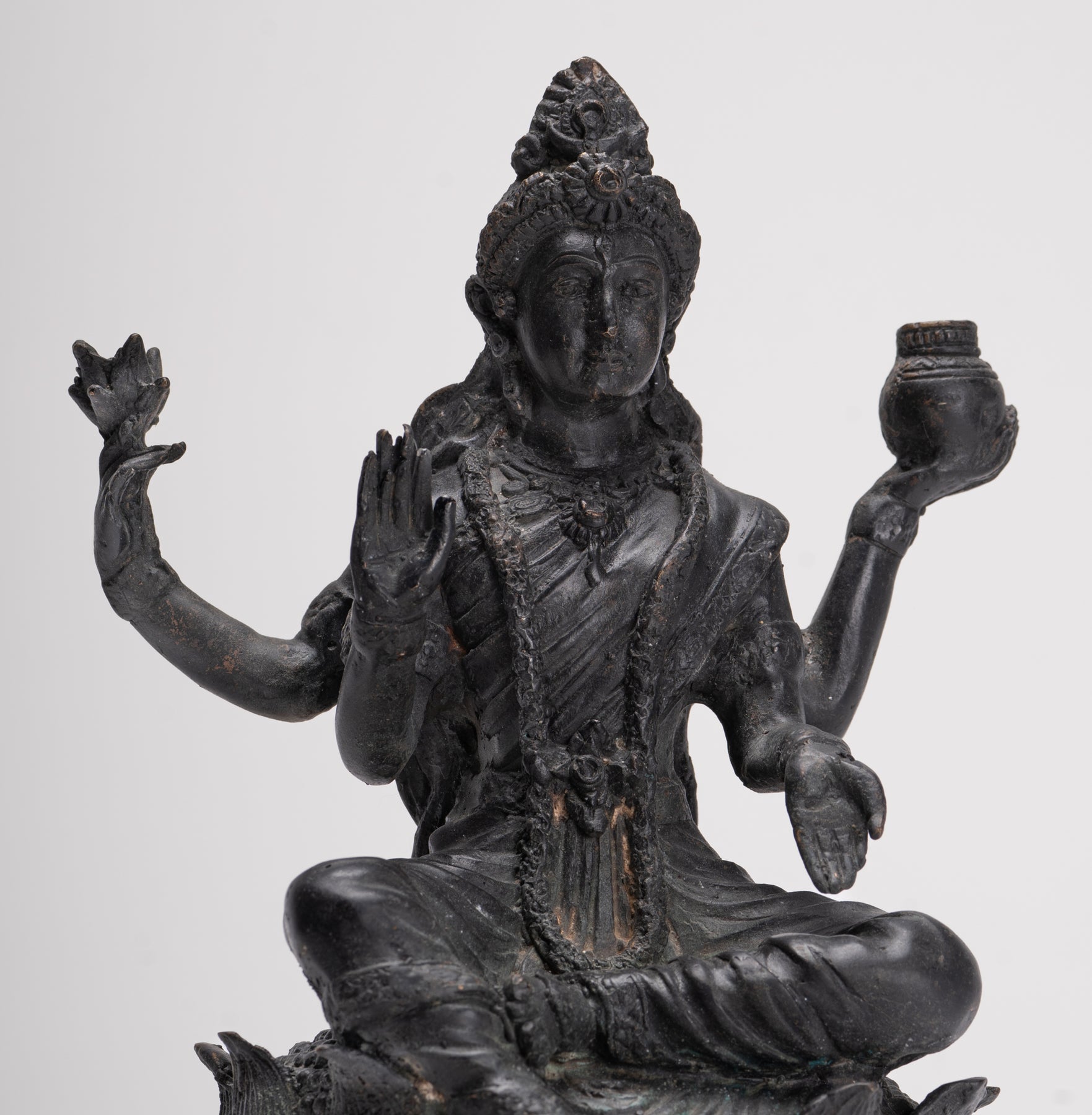 Hier hat er zwei Arme, die seinen Fliegenwedel und seine Kalasha halten. Seine dritte Hand wird in einer Geste des Lehrens gehalten. Der vierte in einer Geste der Gewährung von Segen.