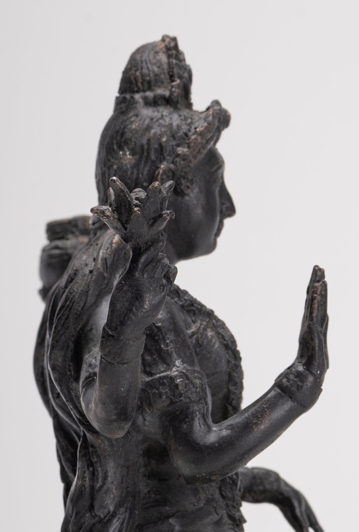 Shiva ist in ein reich verziertes Gewand gekleidet, hat eine Schärpe um die Taille gebunden und trägt eine Reihe kunstvoller Schmuckstücke, darunter eine Krone und Ohrringe. Als Zerstörer gilt Shiva als grenzenlos, transzendent und unveränderlich. Shiva gilt auch als Schutzgott des Yoga, der Meditation und der Künste.