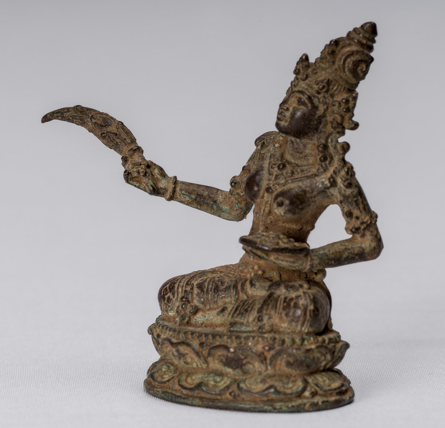 Eine antike sitzende Bronze-Devi-Skulptur von Tara im Java-Stil, Zhengyi Mithubma,im Majapahit-Stil des 13. Jahrhunderts.
