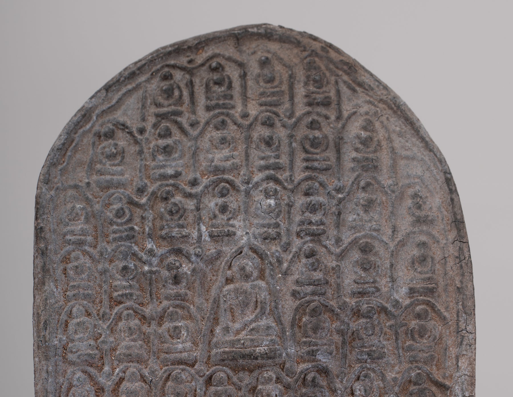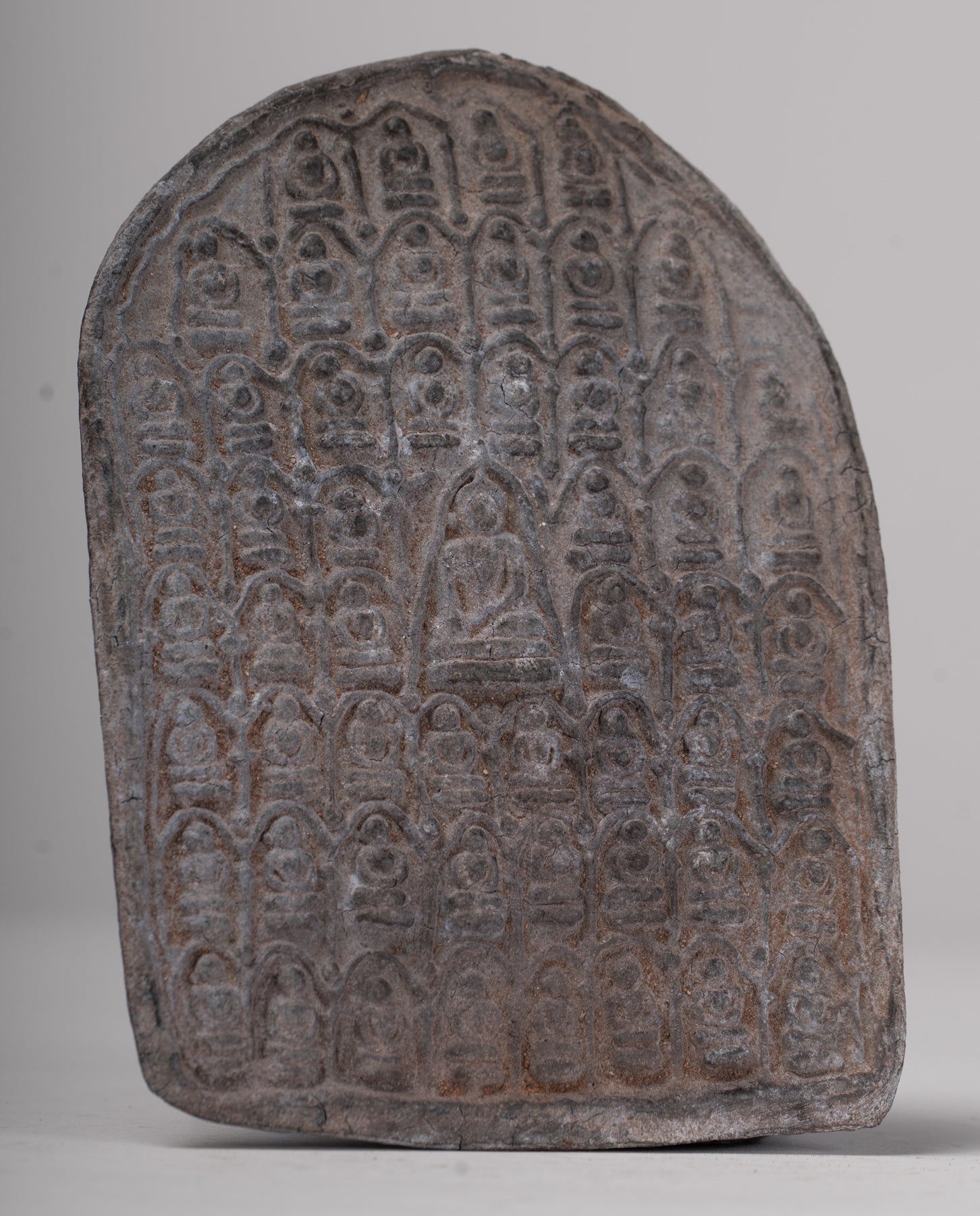Eine wunderschöne antike Votivtafel im thailändischen Stil, die Erleuchtungs- und Meditations-Buddha-Statuen im Stil des 17. Jahrhunderts zeigt.