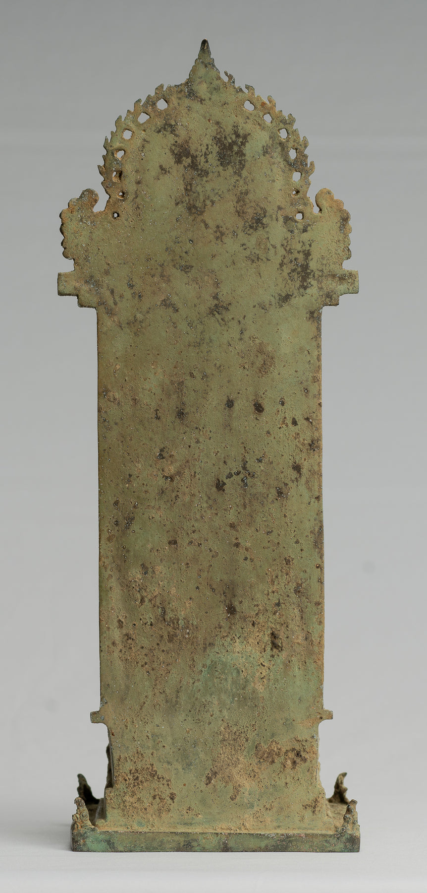 El Buda está de pie Samabhanga en una base redonda de pétalos de loto que se encuentra en un pedestal decorado. Se pueden ver dos devi en la base del pedestal, en pose de adoración.
