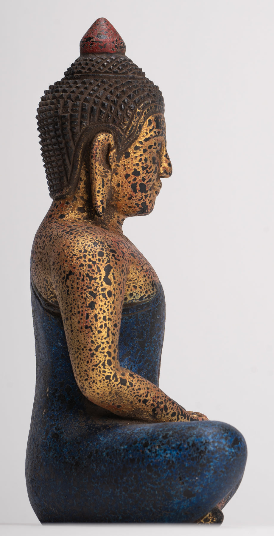 Como es tradicional, el Buda de la Meditación está representado aquí en postura sentada, con ambas piernas cruzadas en posición de medio loto. Las manos se colocan en el Dhyana Mudra, donde la mano derecha descansa sobre la mano izquierda, con los pulgares tocándose suavemente, formando un sutil triángulo o círculo. La espalda del Buda está recta y la mirada baja, lo que significa profunda concentración y reflexión interior.