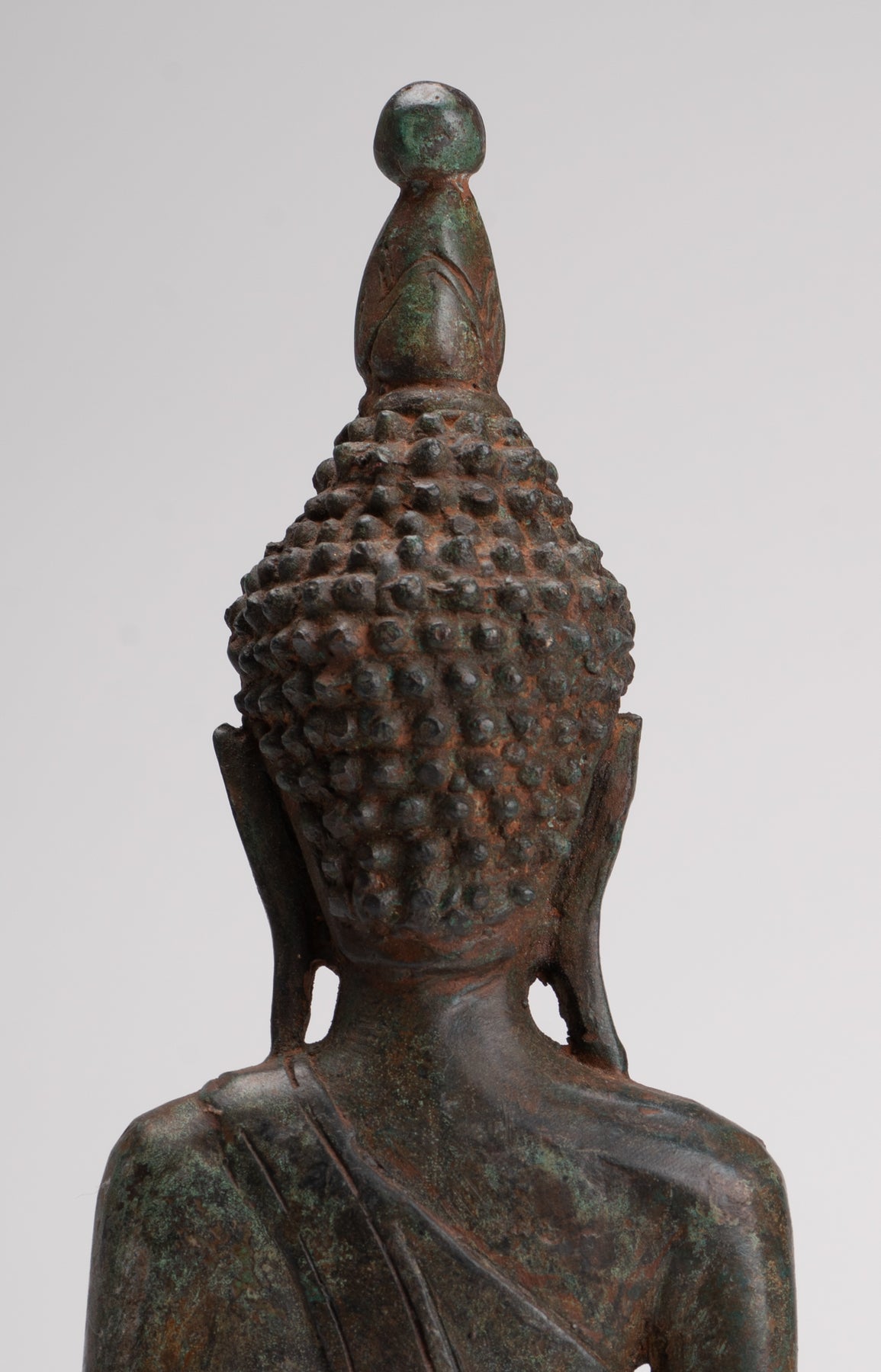 Las manos de Buda están en el Bhumisparsa o mudra de la iluminación. El rostro del Buda es sereno, con una expresión naturalista y cálida; su cabeza está rematada por un ushnisha de capullo de loto, al estilo de Laos.