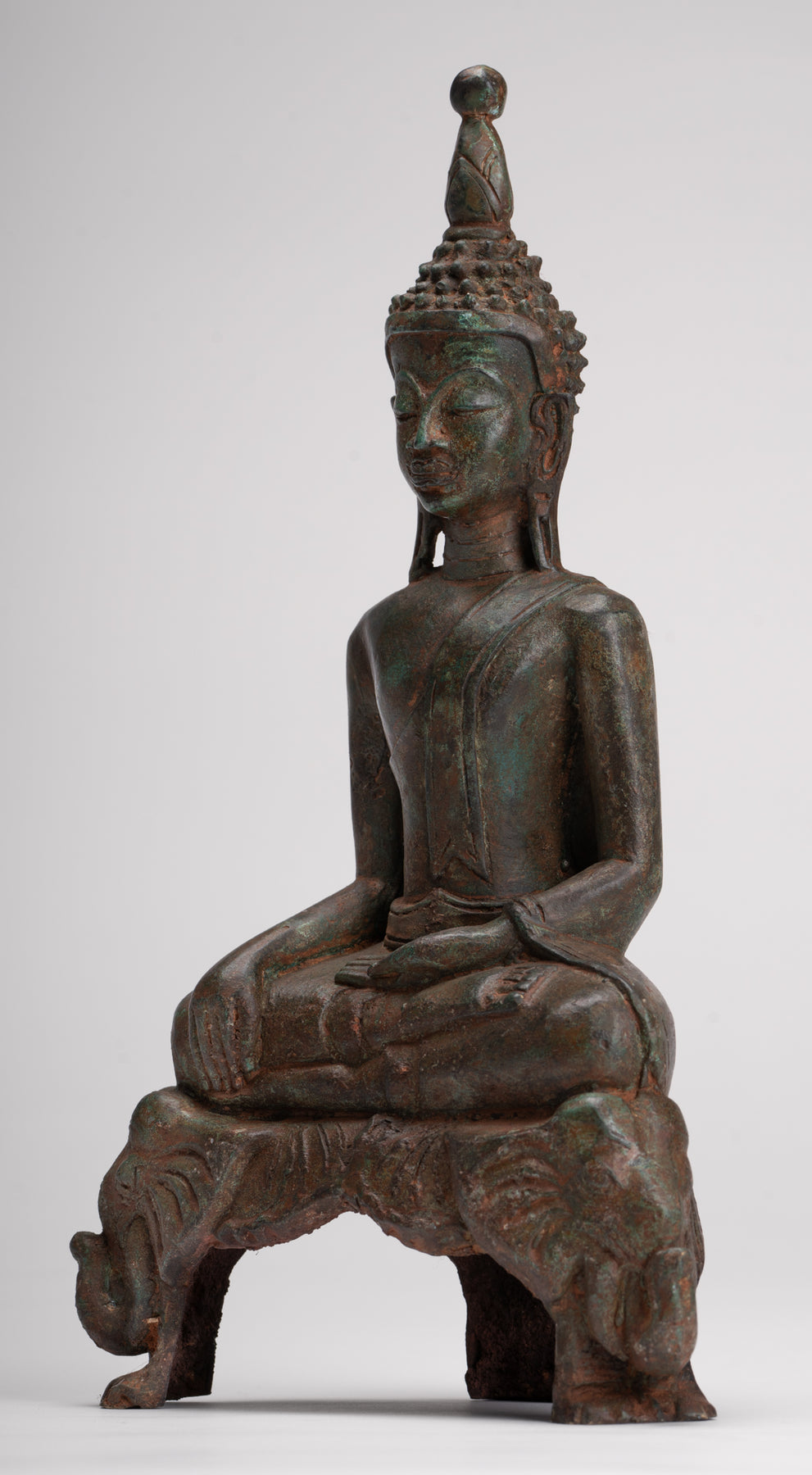 Un Buda de la Ilustración inusual al estilo de Laos, sentado en un trono de elefante de tres puntos.