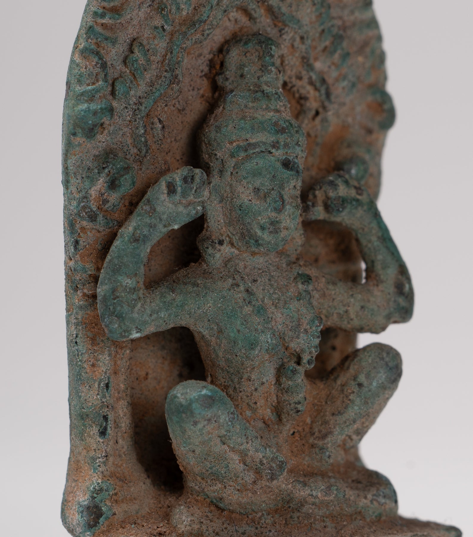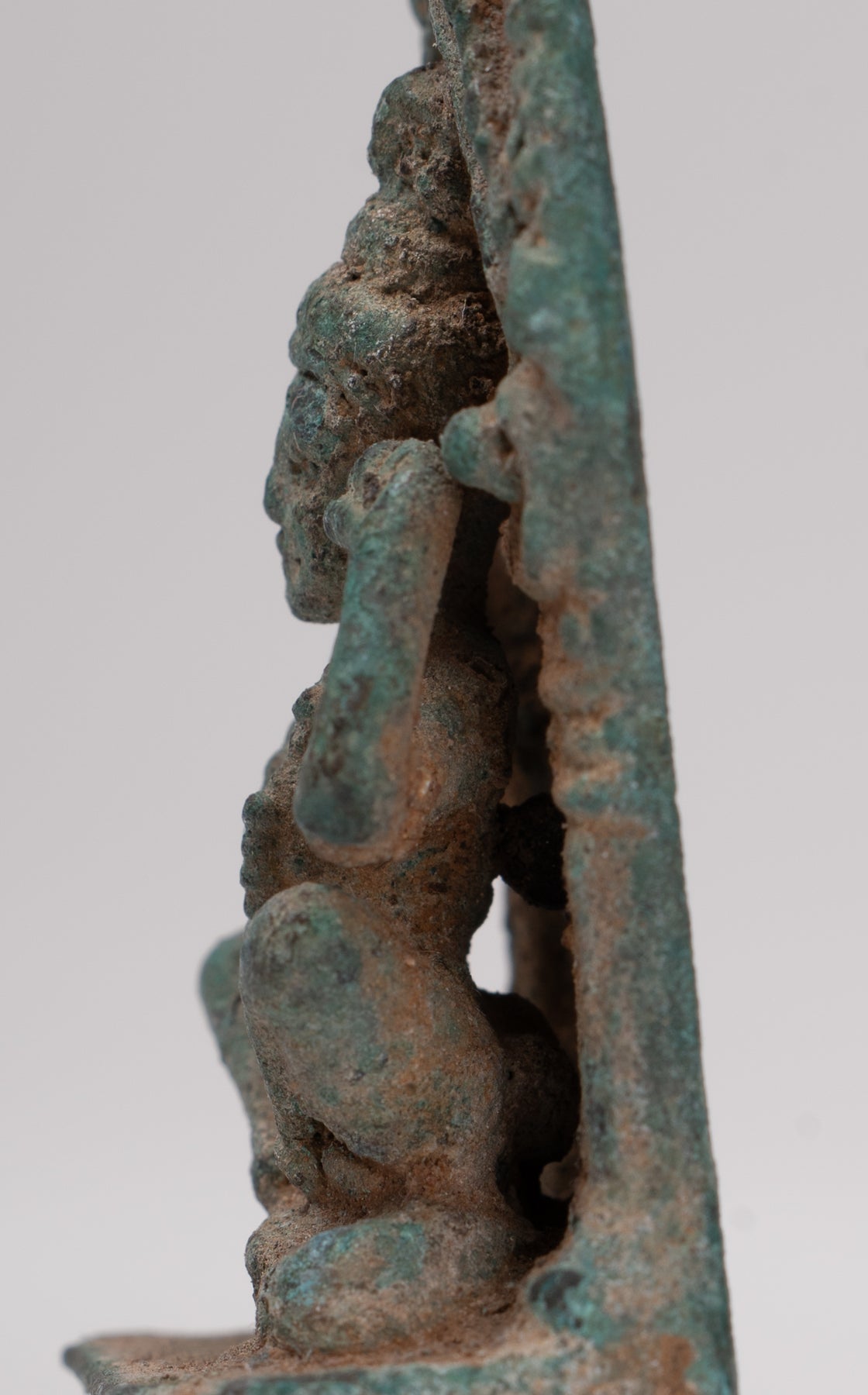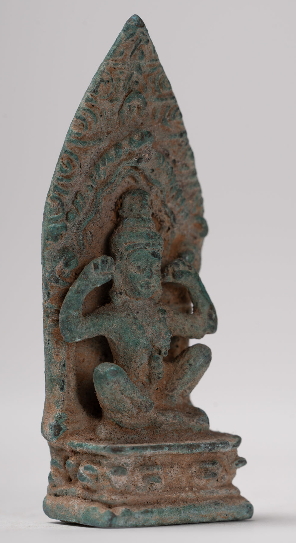 Esta encantadora escultura de bronce muestra a Vishnu sentado Panhandle. Está vestido con un sampot plisado.