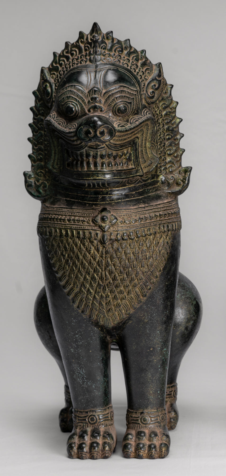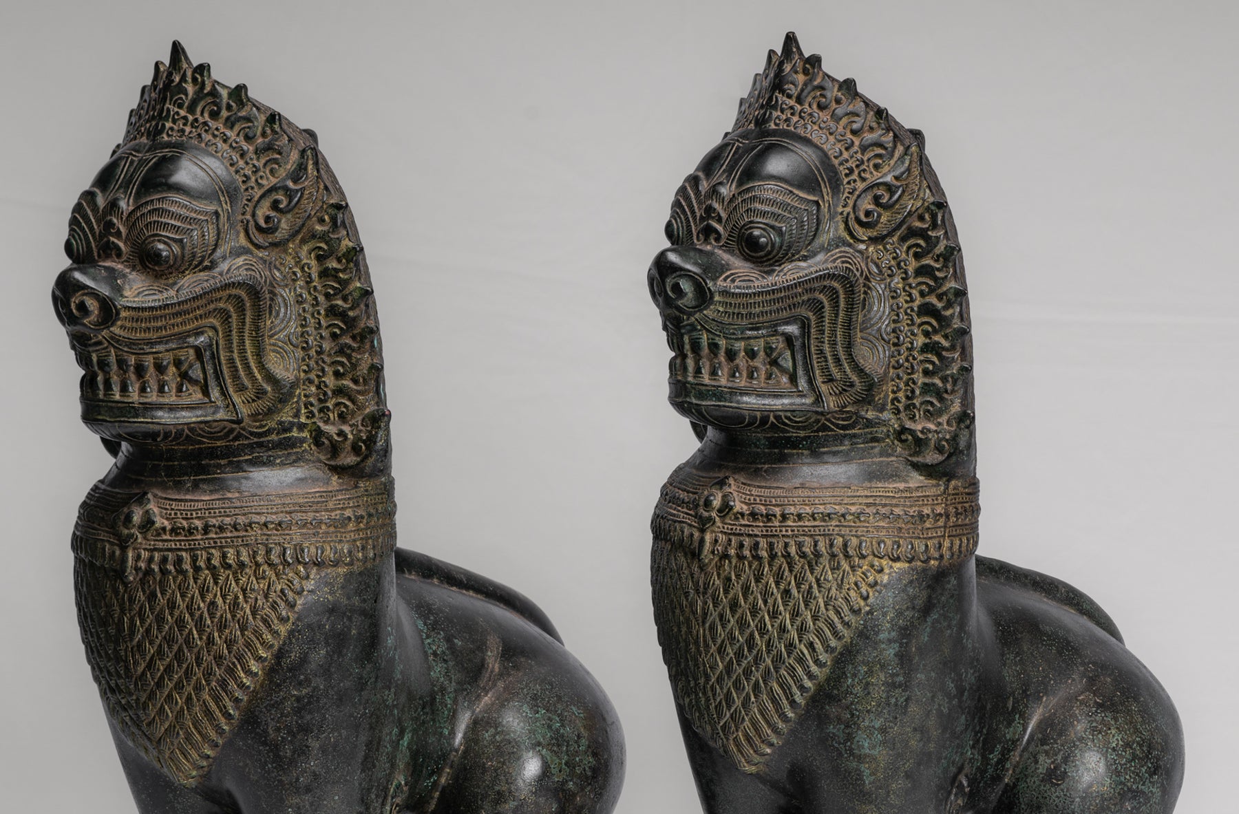 Al igual que con este imponente par de figuras de tutor de templo o león de estilo jemer, en el período Angkor, estilo del siglo X de Banteay Srei. Los 'guardianes de la puerta' se colocan alrededor del exterior de un templo para servir tanto como saludadores como defensores, tenían la intención específica de proteger las principales entradas de los templos.