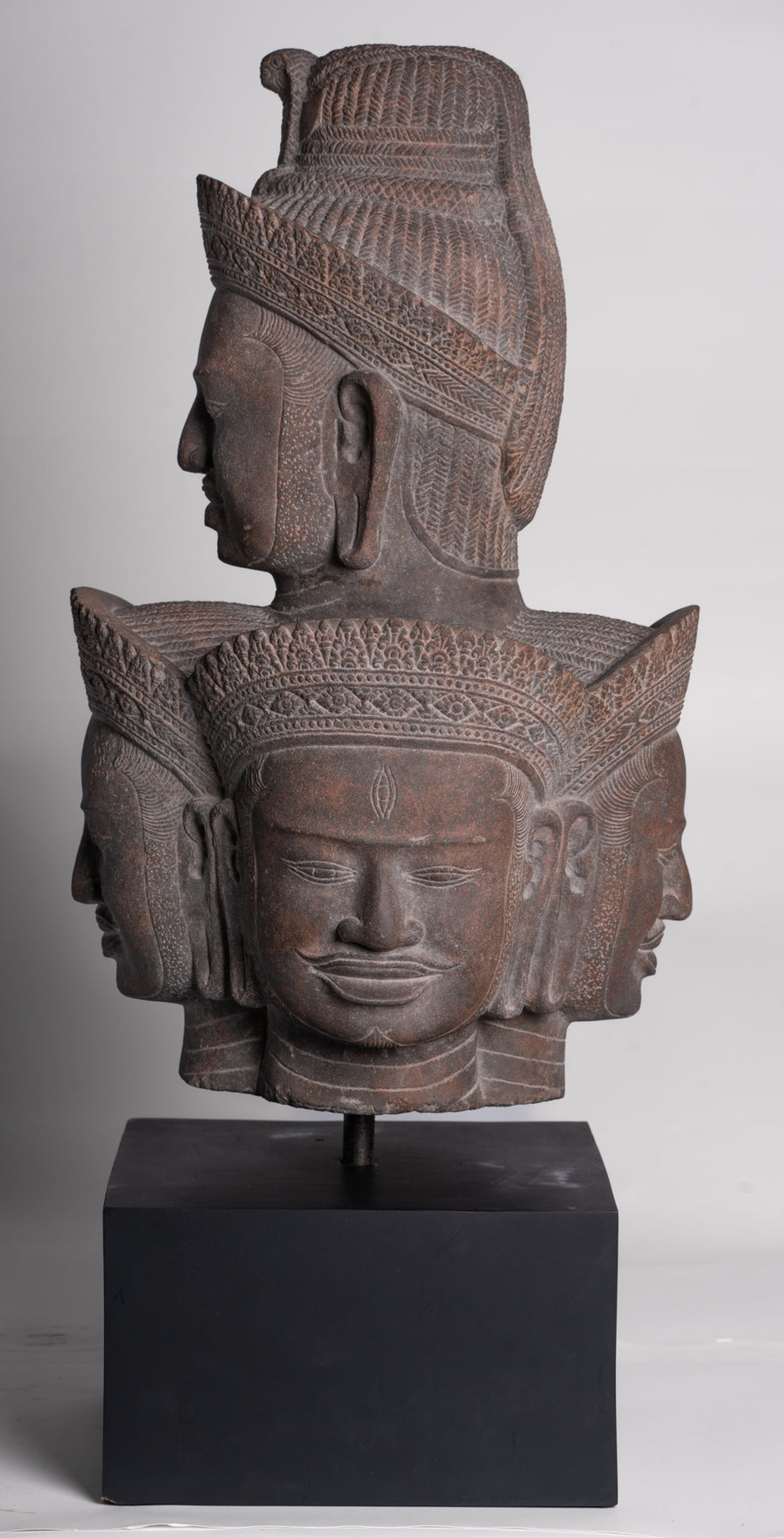 Una antigüedad del siglo XII. Pancha-Mukha Shiva camboyano estilo Angkor Wat, esta poderosa escultura ejemplifica la autoridad y el refinamiento del arte jemer en su apogeo. La presencia que emana de esta rara imagen de cinco caras captura la intensidad y profundidad espiritual características del estilo de Angkor Wat.