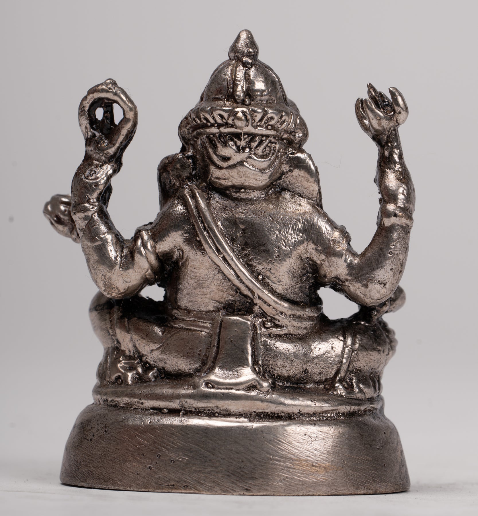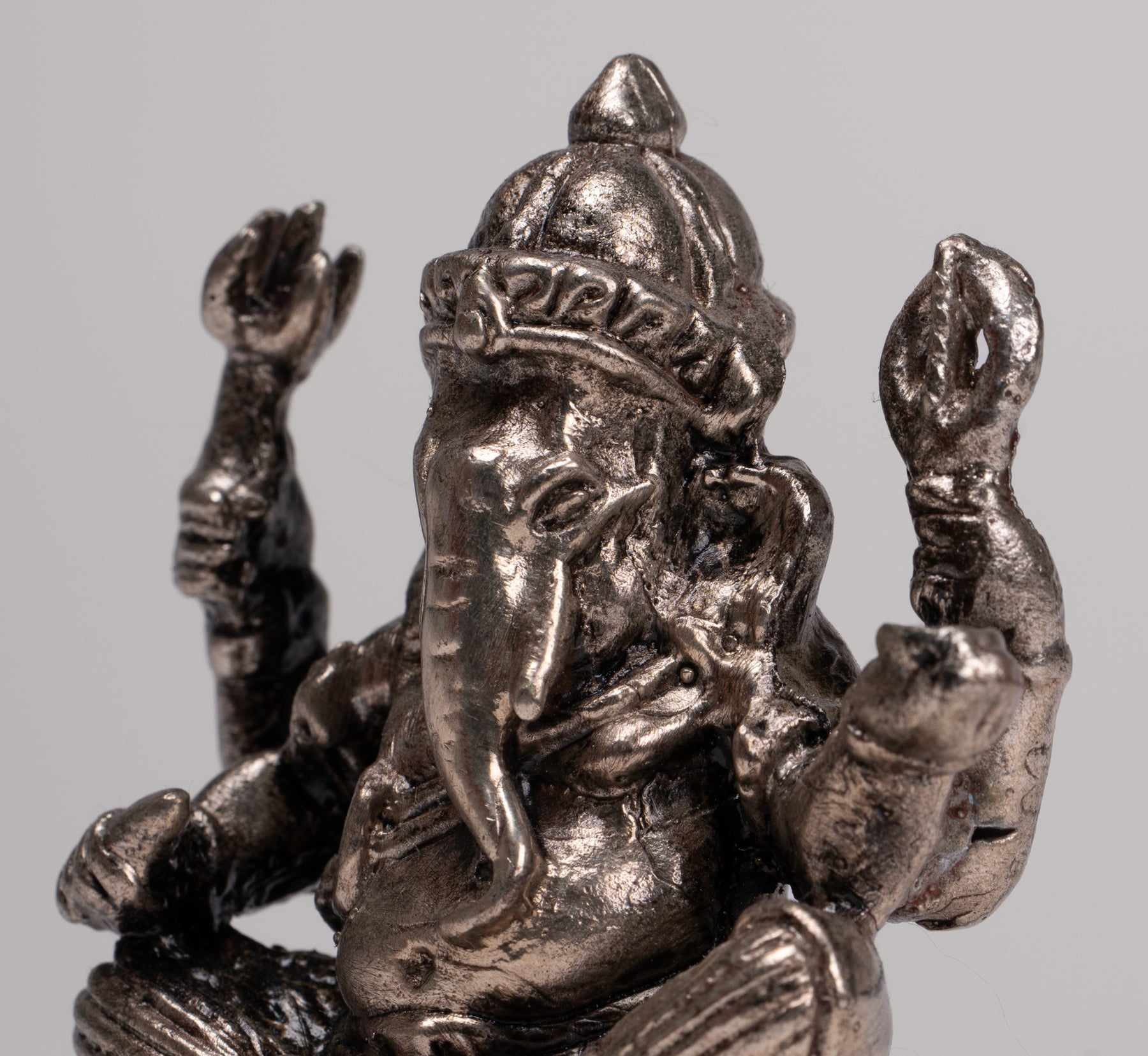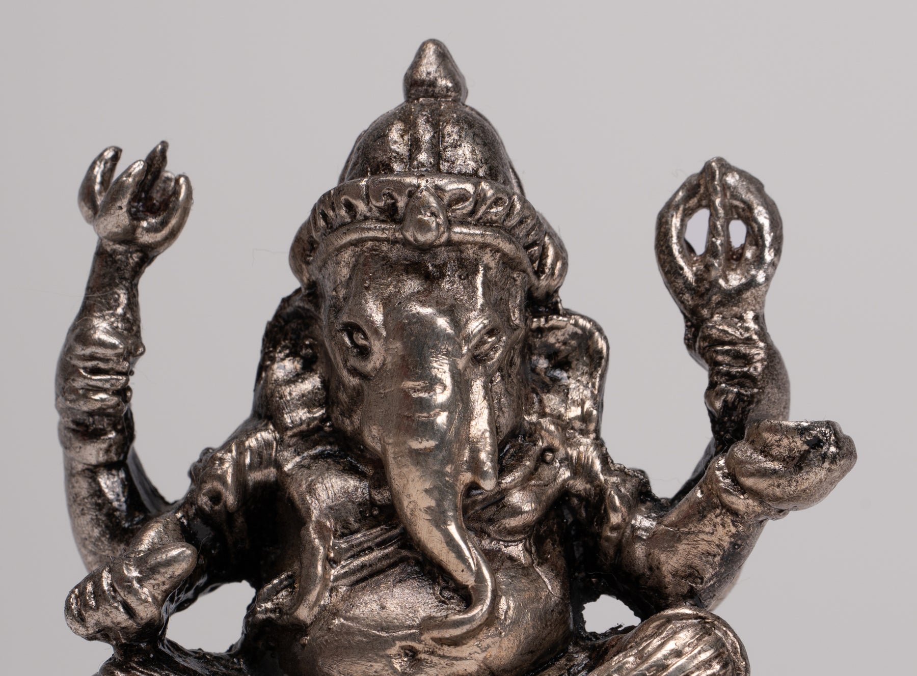 Un reparto expresivo unGanesha de 4 brazos sentado en plata de estilo tailandés antiguo. El dios con cabeza de elefante lleva un largo dhoti con tela cruzada alrededor de su corpulenta cintura. La pátina distintiva de la pieza es particularmente encantadora.