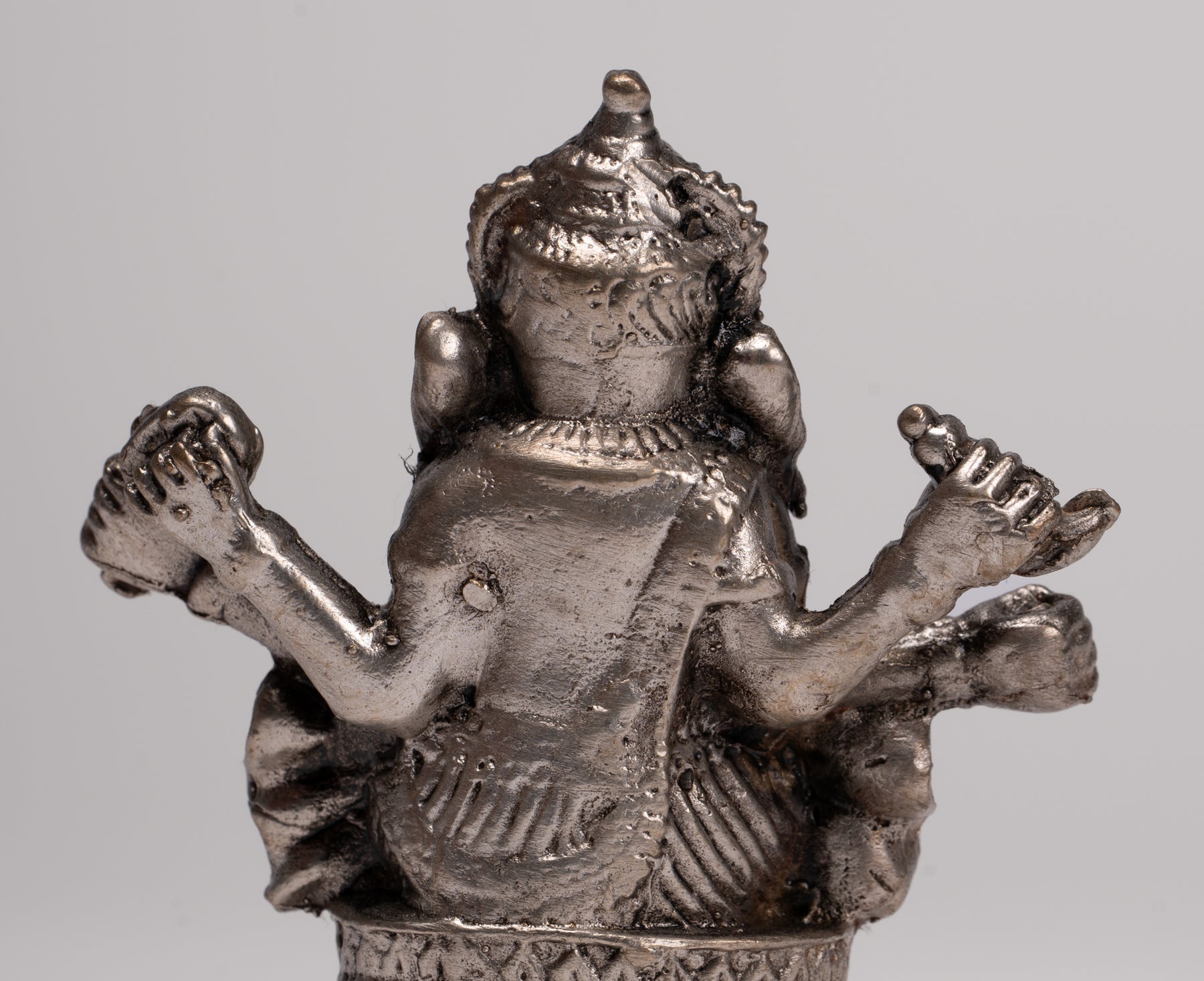 Un elenco expresivamente aNtique Thai Style Silver Sented 4-Arm Ganesha. El Dios con cabeza de elefante lleva un largo Dhoti con tela cruzada alrededor de su cintura portal. La pátina distintiva de la pieza es particularmente deliciosa.