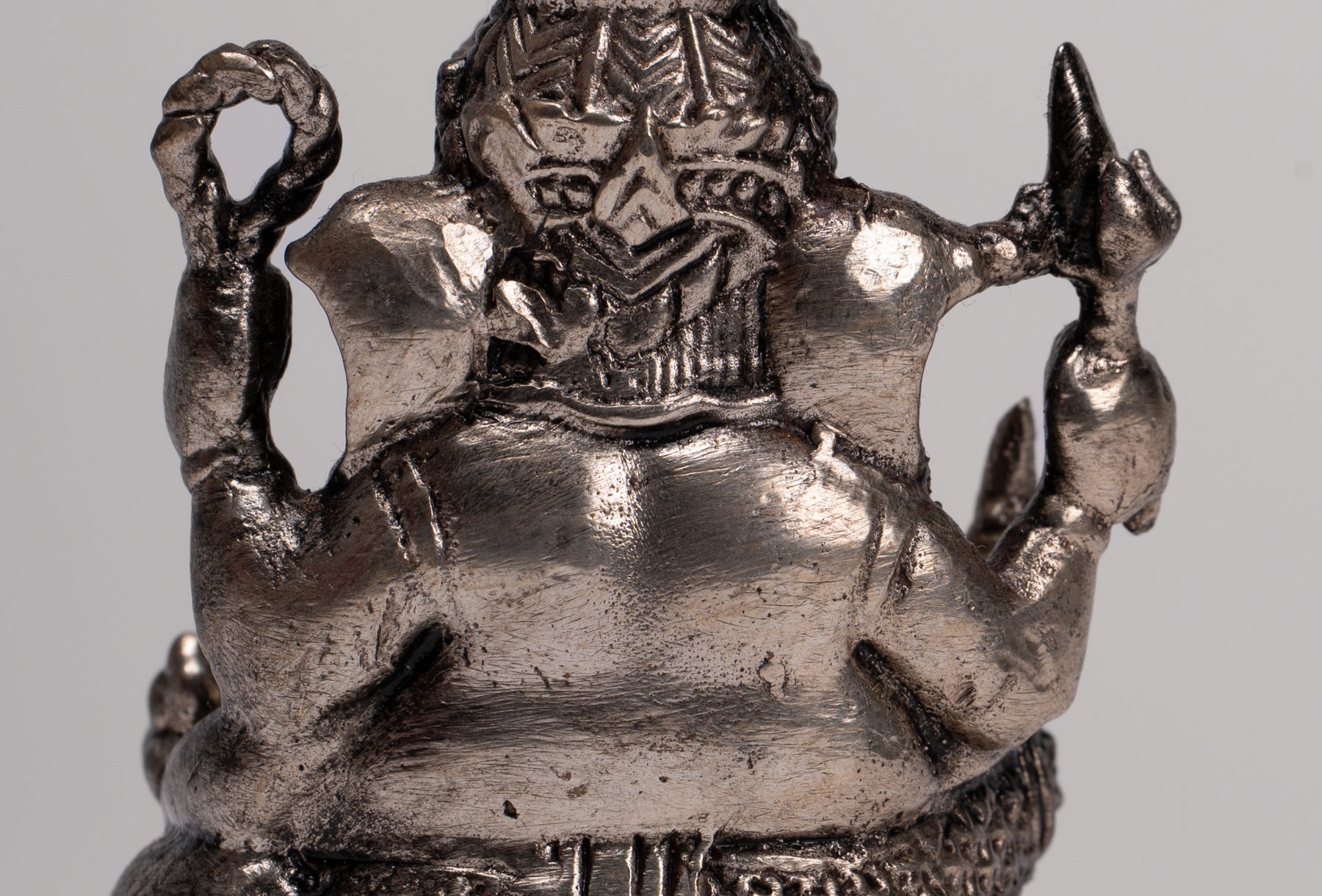 Un elenco expresivamente aNtique Thai Style Silver Sented 4-Arm Ganesha. El Dios con cabeza de elefante lleva un largo Dhoti con tela cruzada alrededor de su cintura portal. La pátina distintiva de la pieza es particularmente deliciosa.