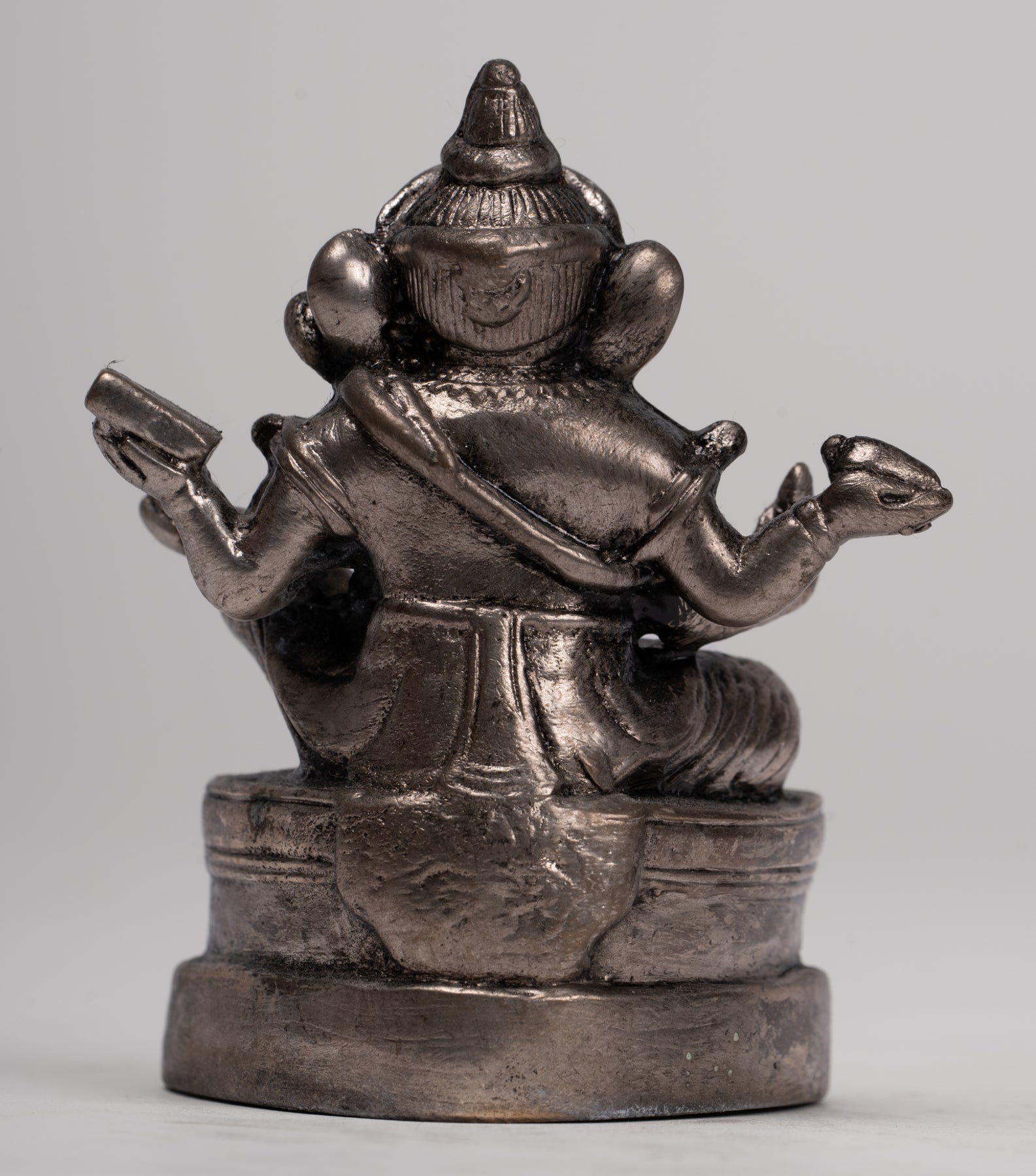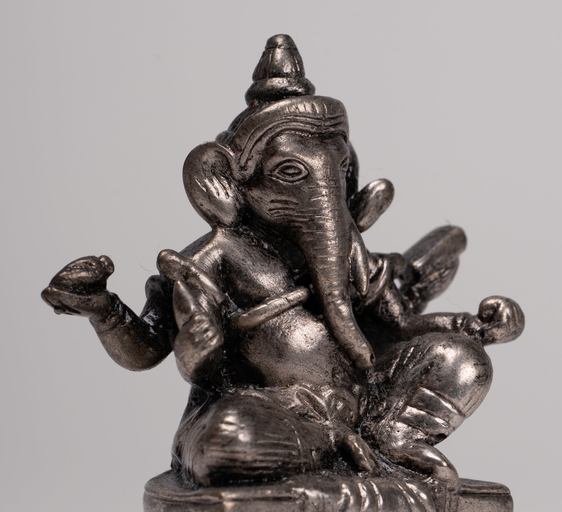 Ganesha Statue - Antique Thai Style Bronze Seated Silver Ganesha Statue - 9cm/4"