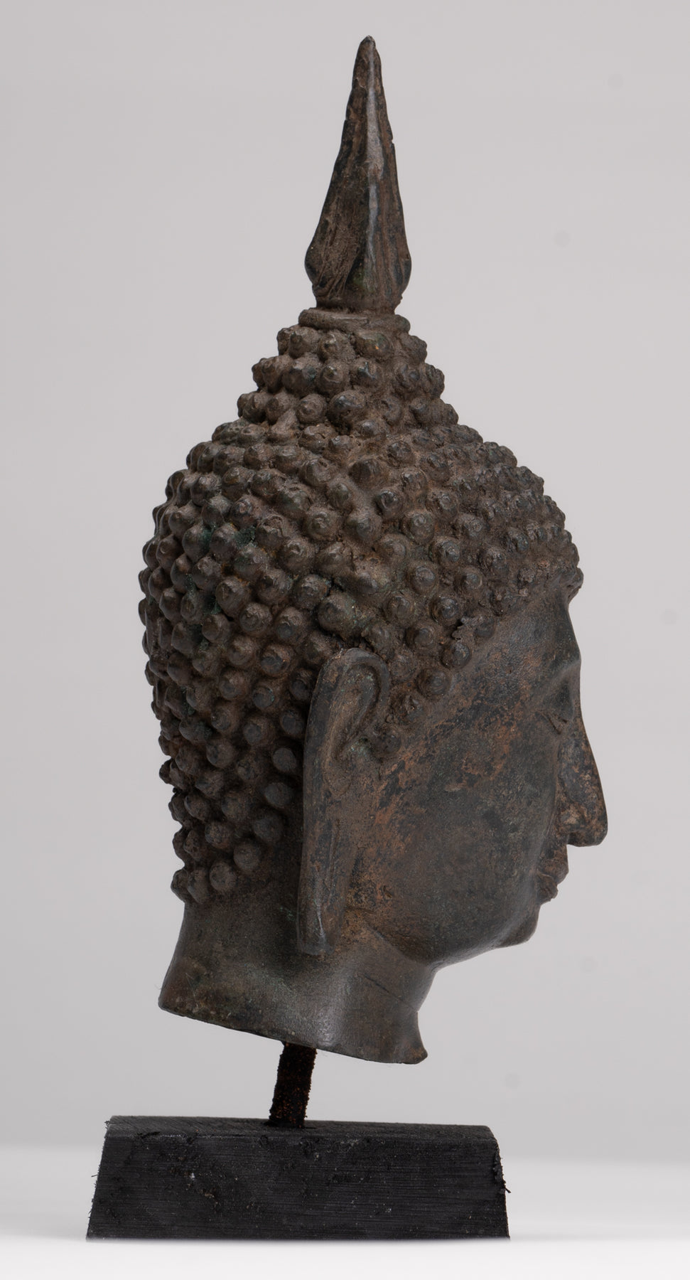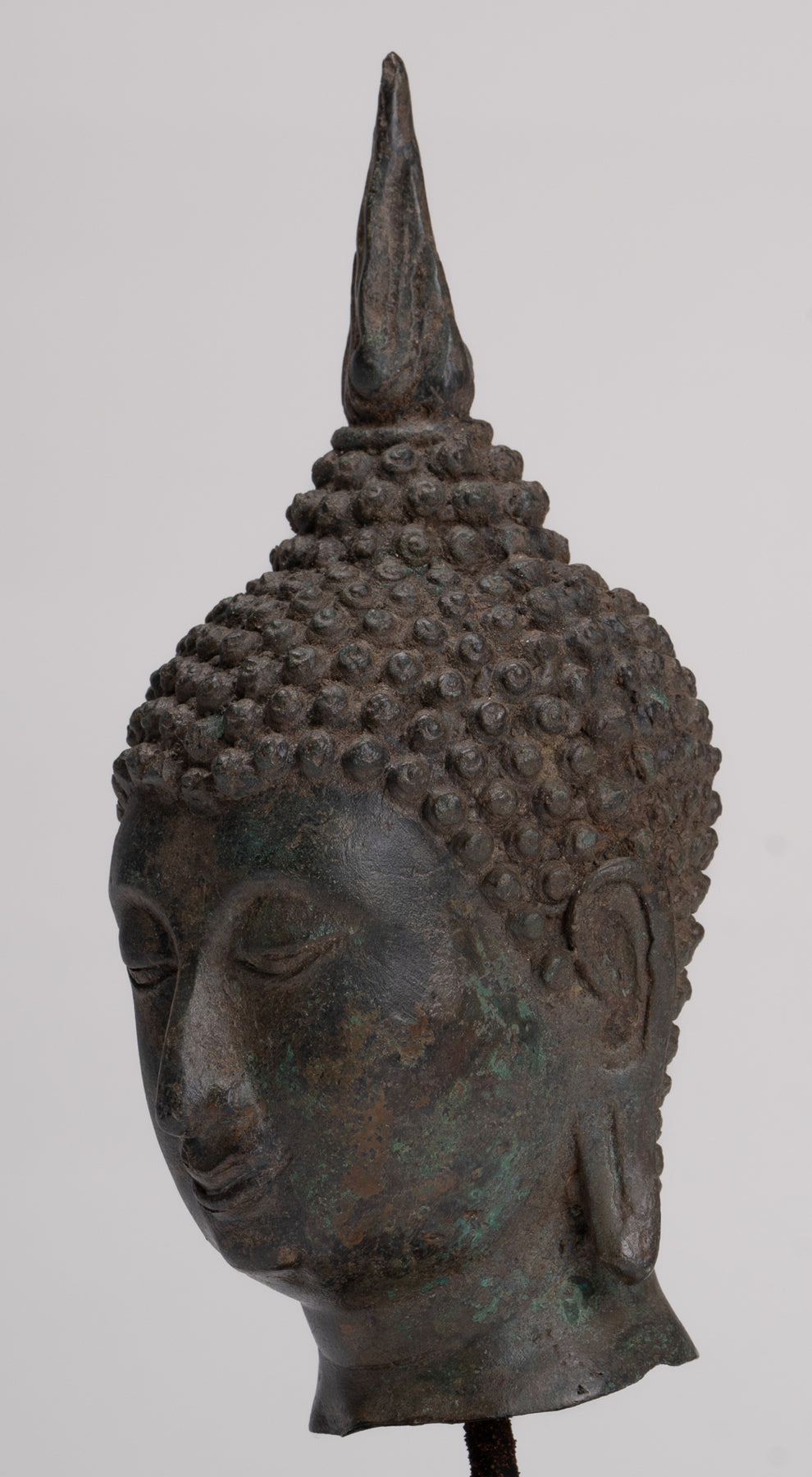 La cabeza de Buda de Sukhothai es una obra maestra de la escultura tailandesa, que encarna las sensibilidades artísticas refinadas del período Sukhothai. Hecho de bronce, la cabeza presenta una expresión serena, ojos abatidos y una sonrisa suave, una representación icónica de la compasión y la sabiduría del Buda. El tocado intrincadamente tallado, adornado con motivos similares a la llama, se suma al aura regal y divina de la escultura.