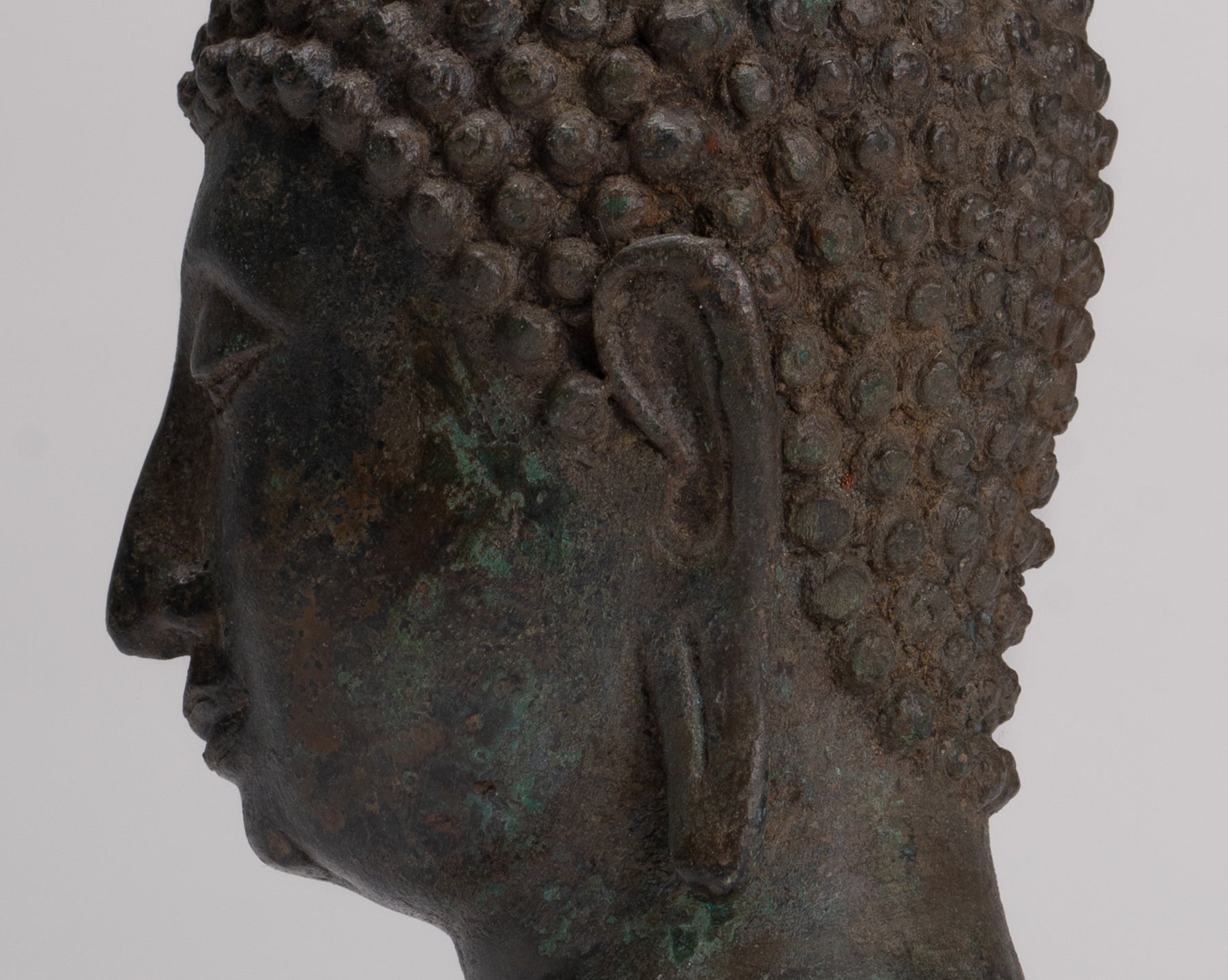 Una antigua cabeza de Buda montada en el estilo del siglo XIII al XV. Refleja el viaje espiritual hacia el despertar y la iluminación de la luz interior.