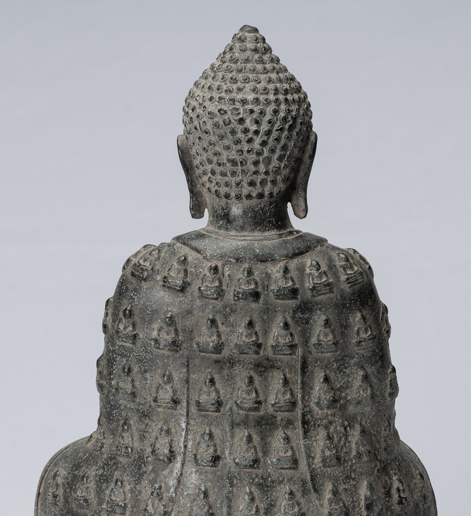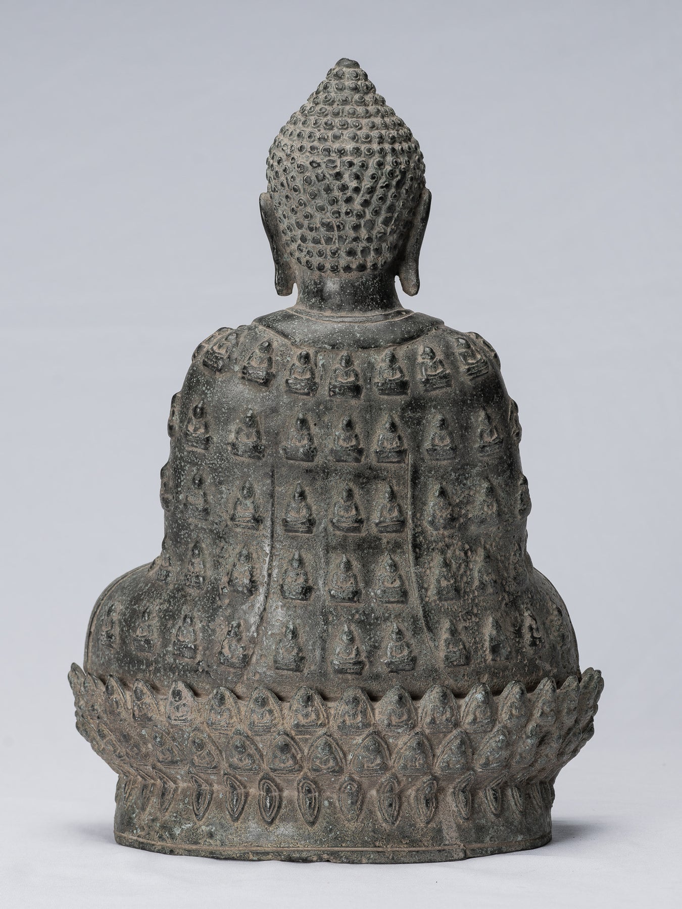 El Buda está sentado en una base de hojas de loto, decorada con muchos Buda en la pose de la Ilustración, en el yoguico de las piernas cruzadas, la postura adamantina de Vajraparyankasana, la pierna derecha sobre la izquierda, con las plantas de ambos pies hacia arriba.