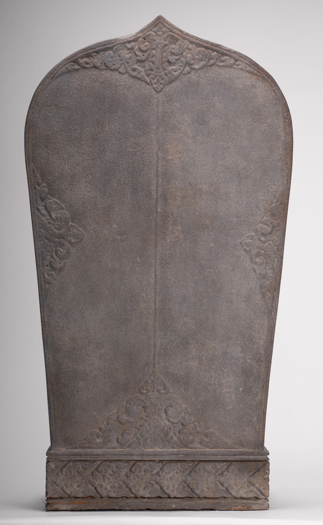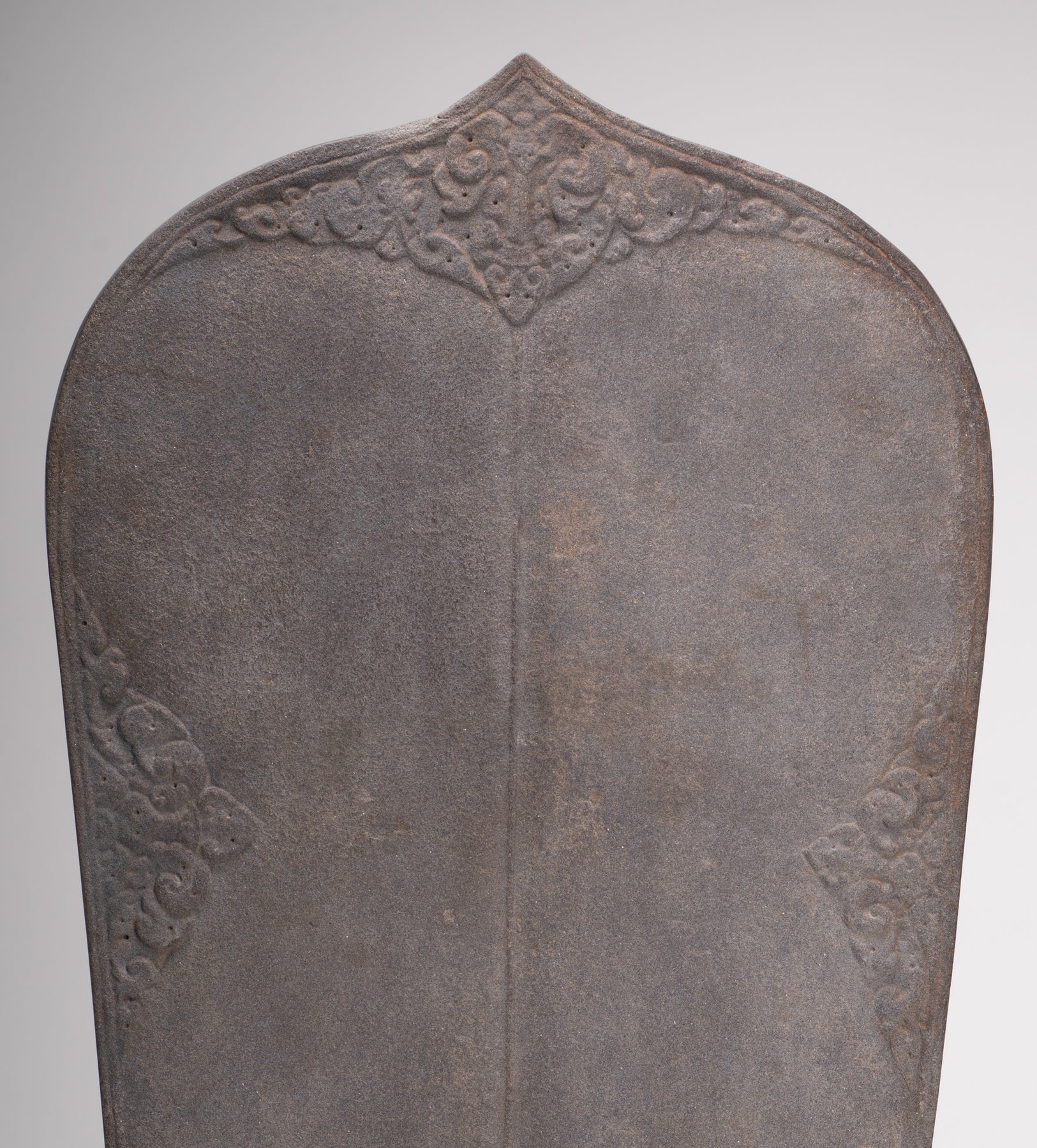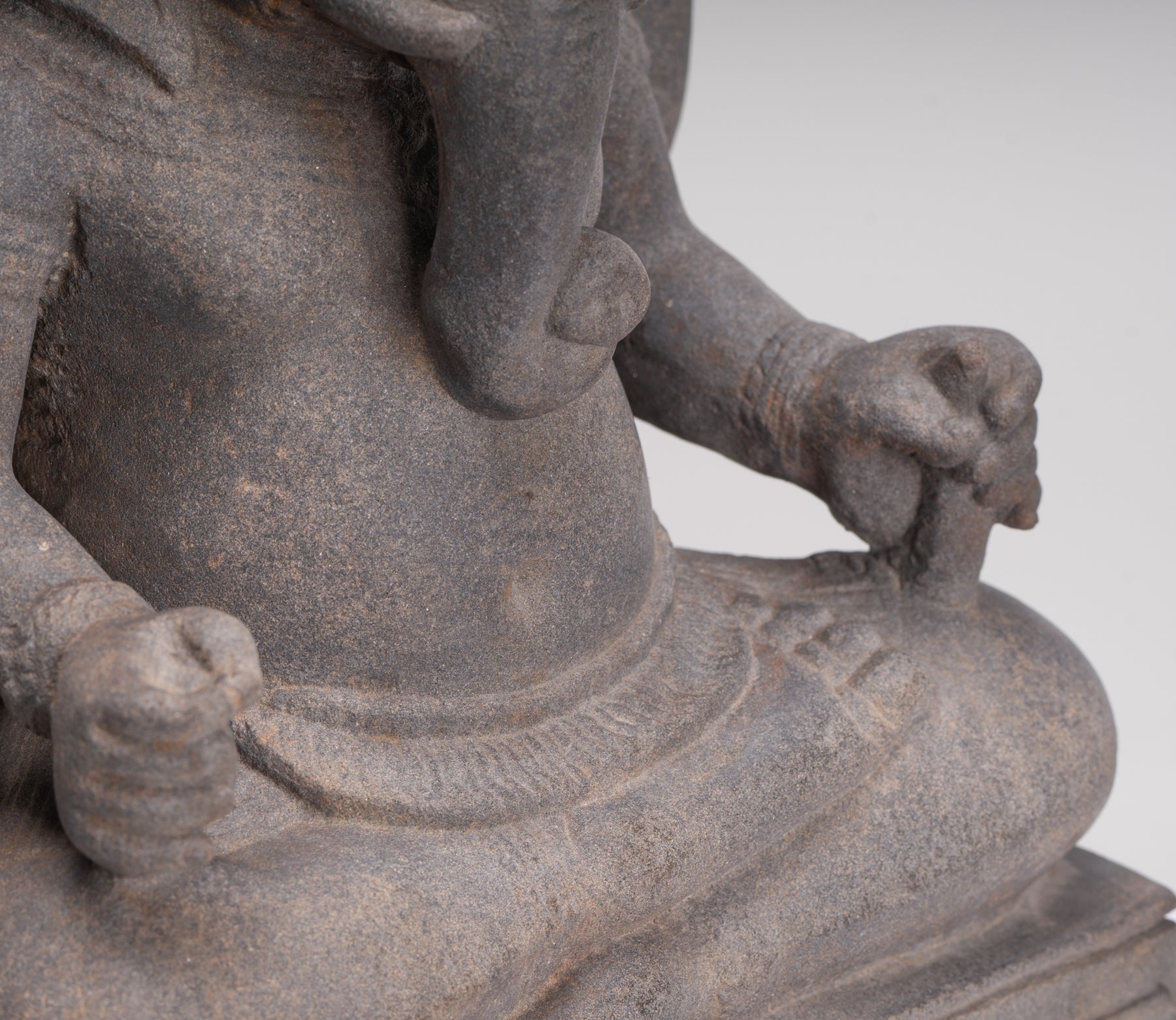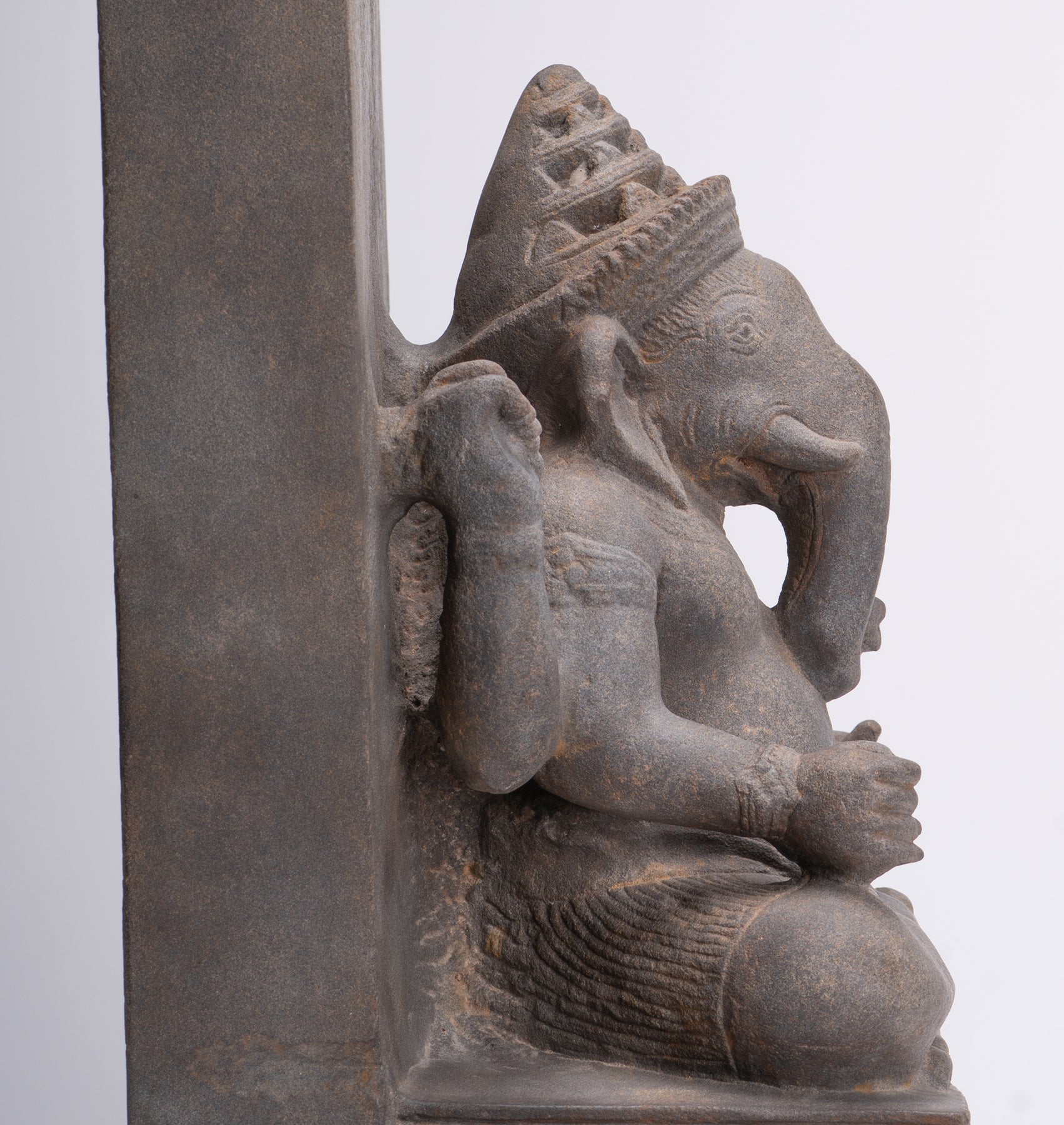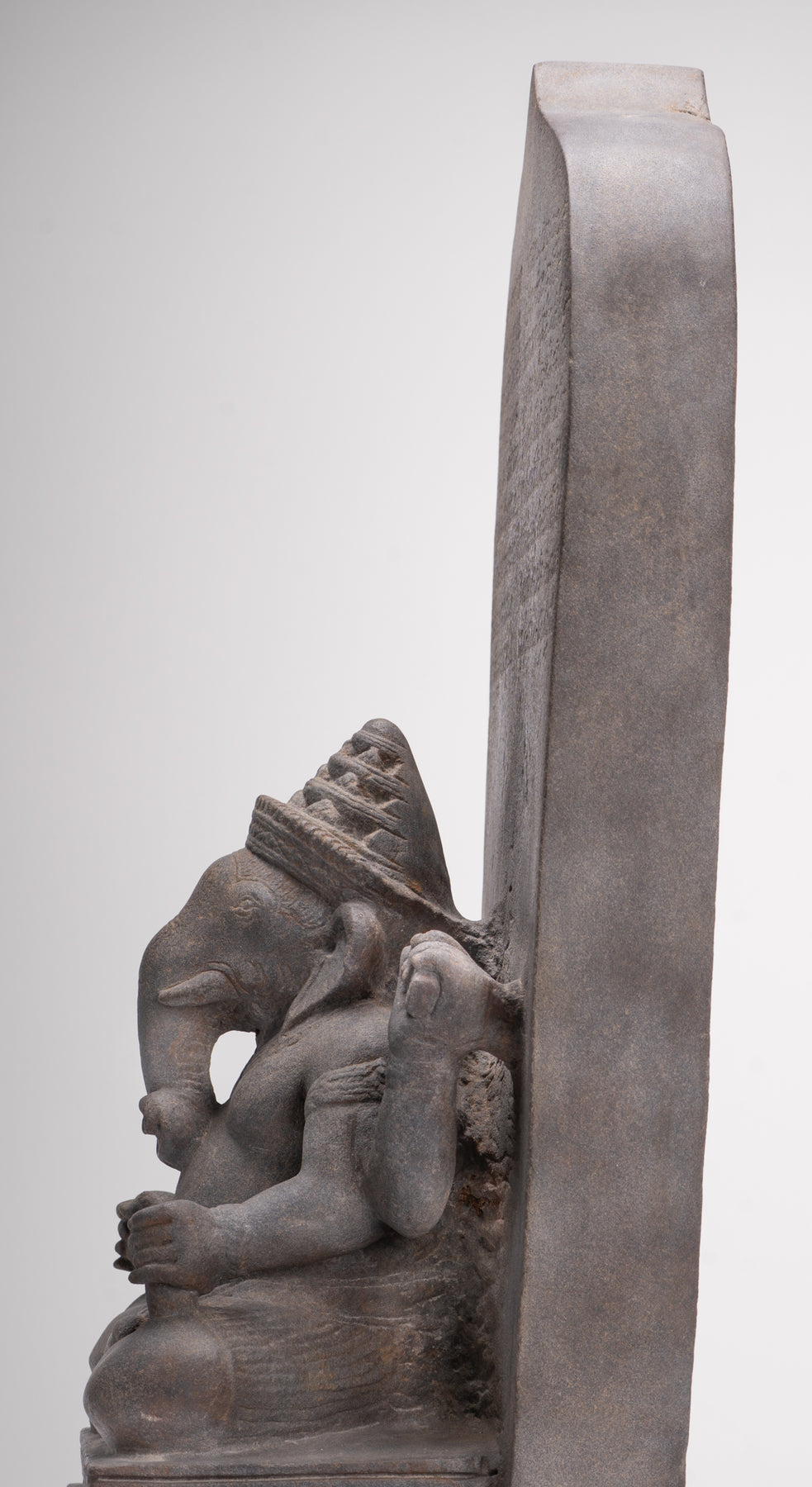 Sus rasgos de elefante están representados de manera sensible y naturalista y se mezclan perfectamente con la figura antropomórfica que se encuentra debajo. Típico, del estilo Angkor del siglo XII. Una rara y delicada escultura jemer de Ganesha.