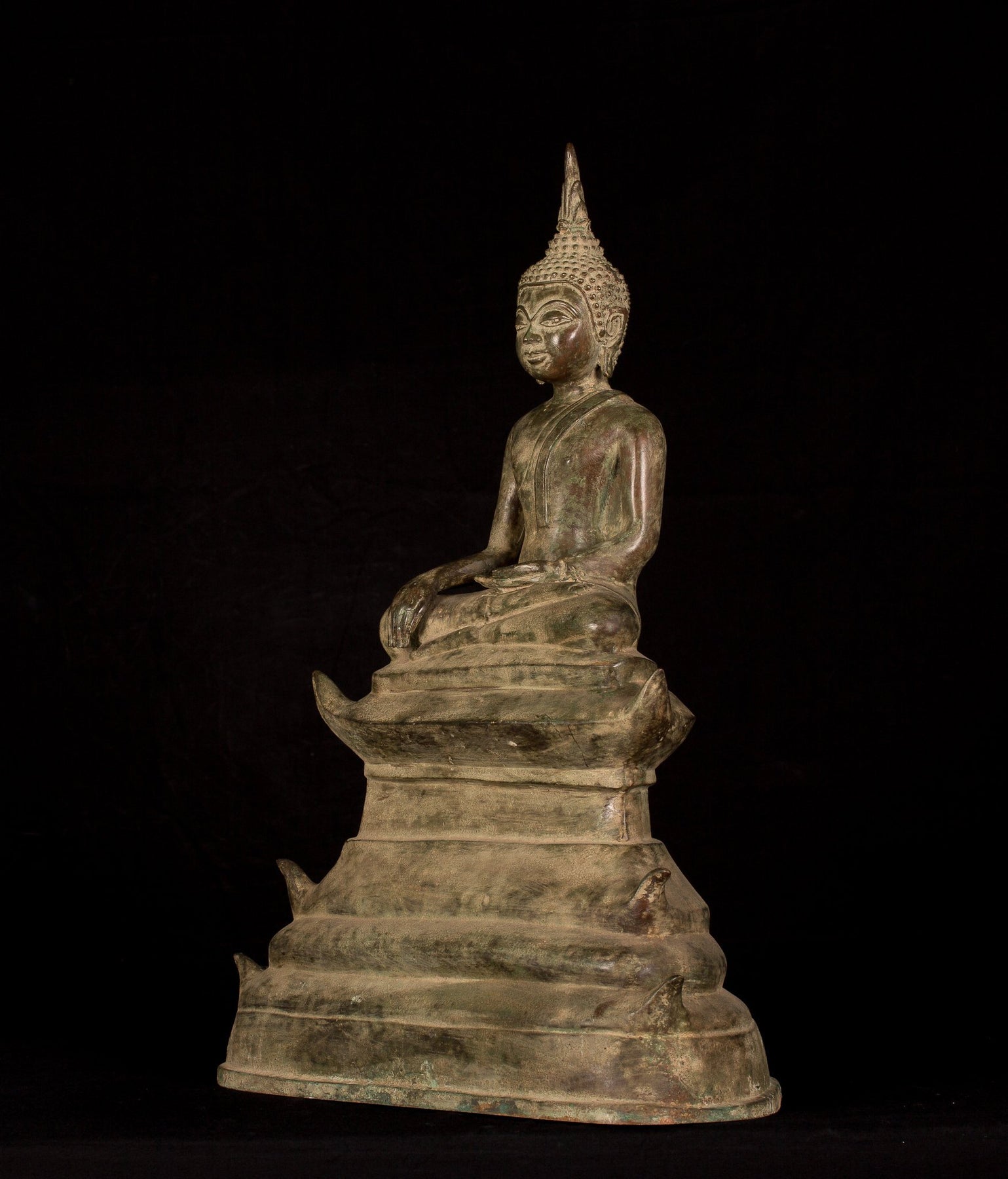 Un antiguo estilo de bronce de bronce sentado Shakyamuni de Laos. El Buda está sentado, en Virasana, símbolo de serenidad con piernas cruzadas, con ambas manos en el Bhumisparsa o 'llamando a la Tierra para presenciar' Mudr_. Con los dedos tocando ligeramente el suelo, esta posición representa el sometido de Mara (un demonio) que bombardeó a Buda con demonios, monstruos, tormentas violentas y las tres hijas seductoras. Permaneciendo firme, el Buda testificó a su pasado meritorio señalando a la tierra y llamando a la diosa de la tierra, Thorani.