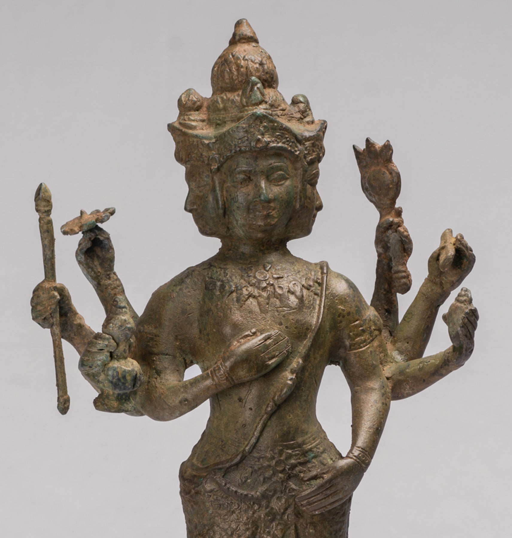 Brahma a menudo es venerado por su papel en la creación, la sabiduría y la búsqueda de la armonía cósmica. La representación tailandesa de Brahma generalmente presenta cuatro caras, cada una simbolizando diferentes aspectos del orden divino y cósmico. Las cuatro caras de Brahma miran hacia el norte, sur, este y oeste. Está de pie con ocho brazos sosteniendo una variedad de objetos, incluidos su concha, sutra, mandala, batidora de moscas y cetro. Esto simboliza su autoridad.