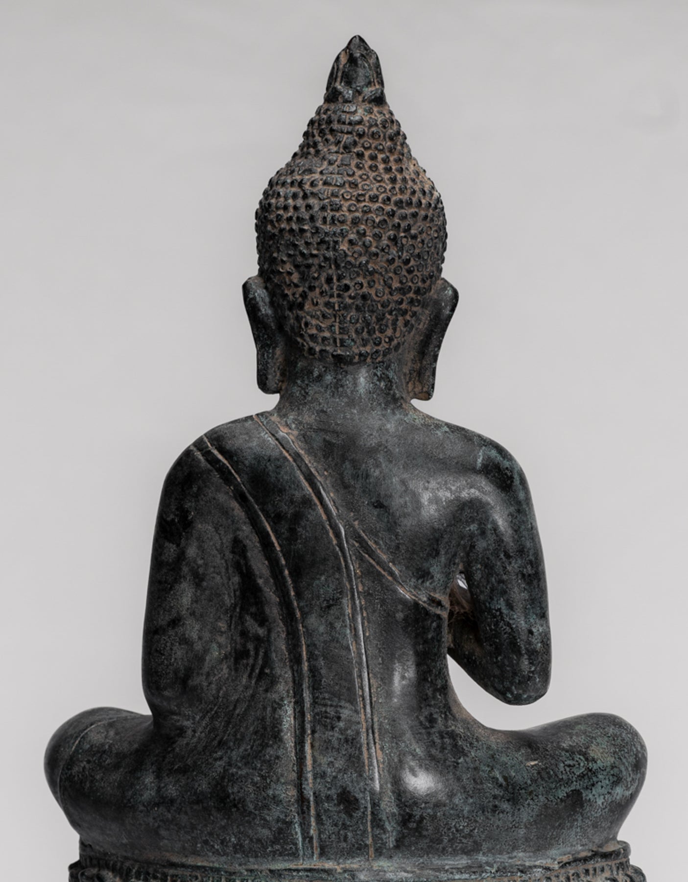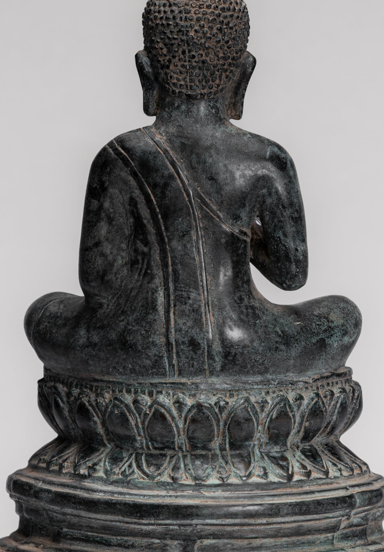 Estatua de Buda de bronce de estilo jemer antiguo. El Buda tiene un semblante pacífico con los ojos introspectivos abatidos y una ceja firme. El perfil de los cuerpos está con hombros anchos y cintura delgada, cubierta por una túnica de Sanghati usada diagonalmente sobre el hombro izquierdo, y está adornada por una aleta muy plisada cubierta del ombligo. El hombro derecho queda desnudo.