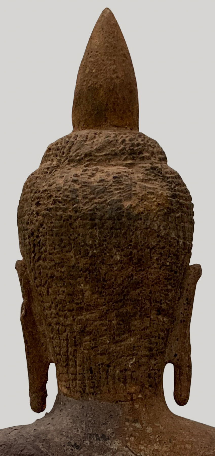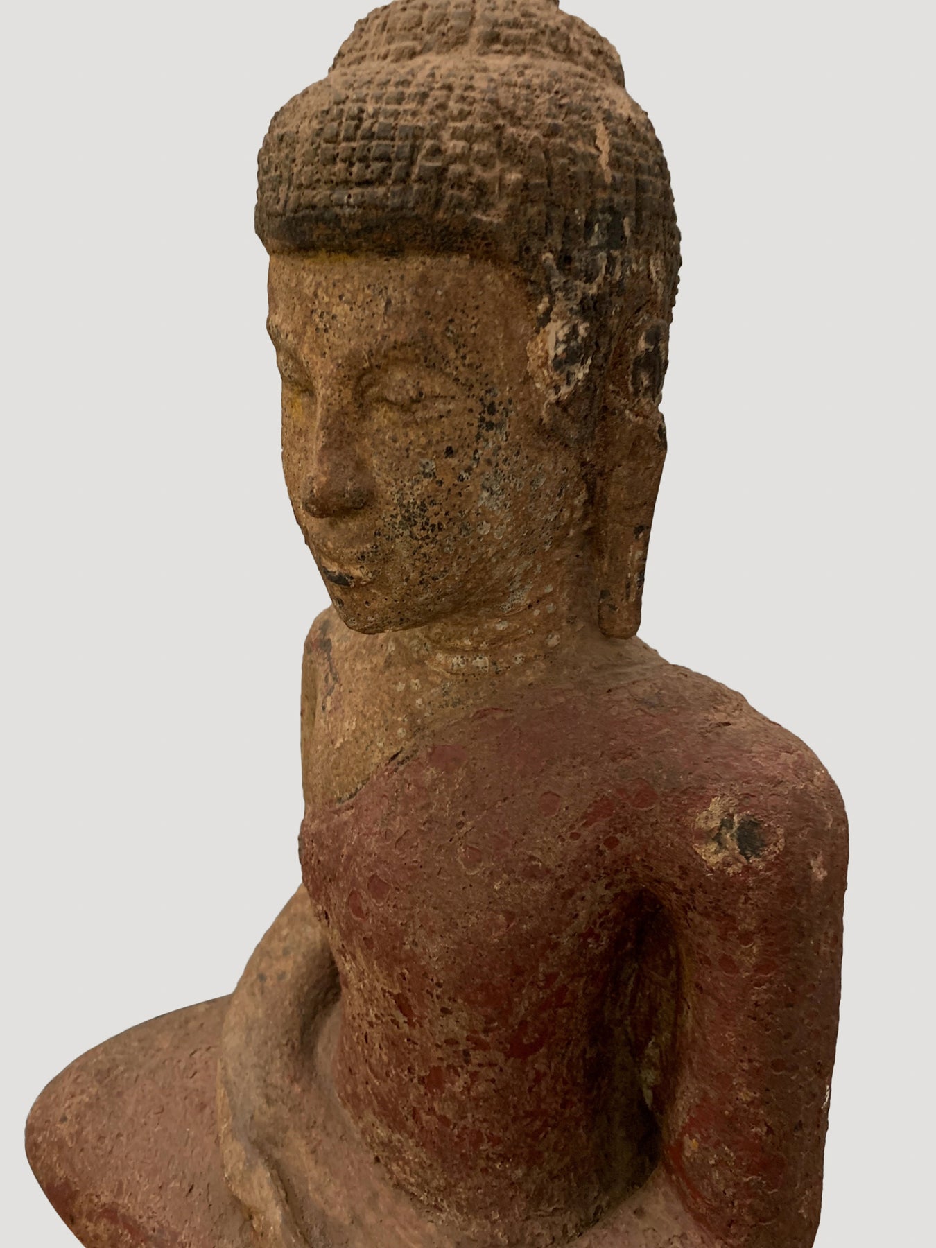 Sentado en la posición de medio loto, tiene una gran protuberancia de Ushnisha sobre su cabeza simbolizando su alto nivel de desarrollo espiritual. El Buda tiene un semblante pacífico con los ojos introspectivos abatidos y una ceja firme. Sus lóbulos de los lóbulos se estiran mucho de un joven gastado como un príncipe con aretes de oro pesados.
