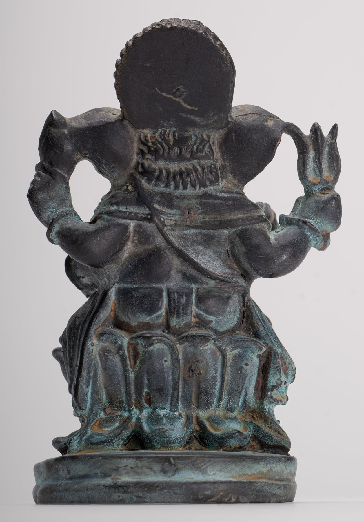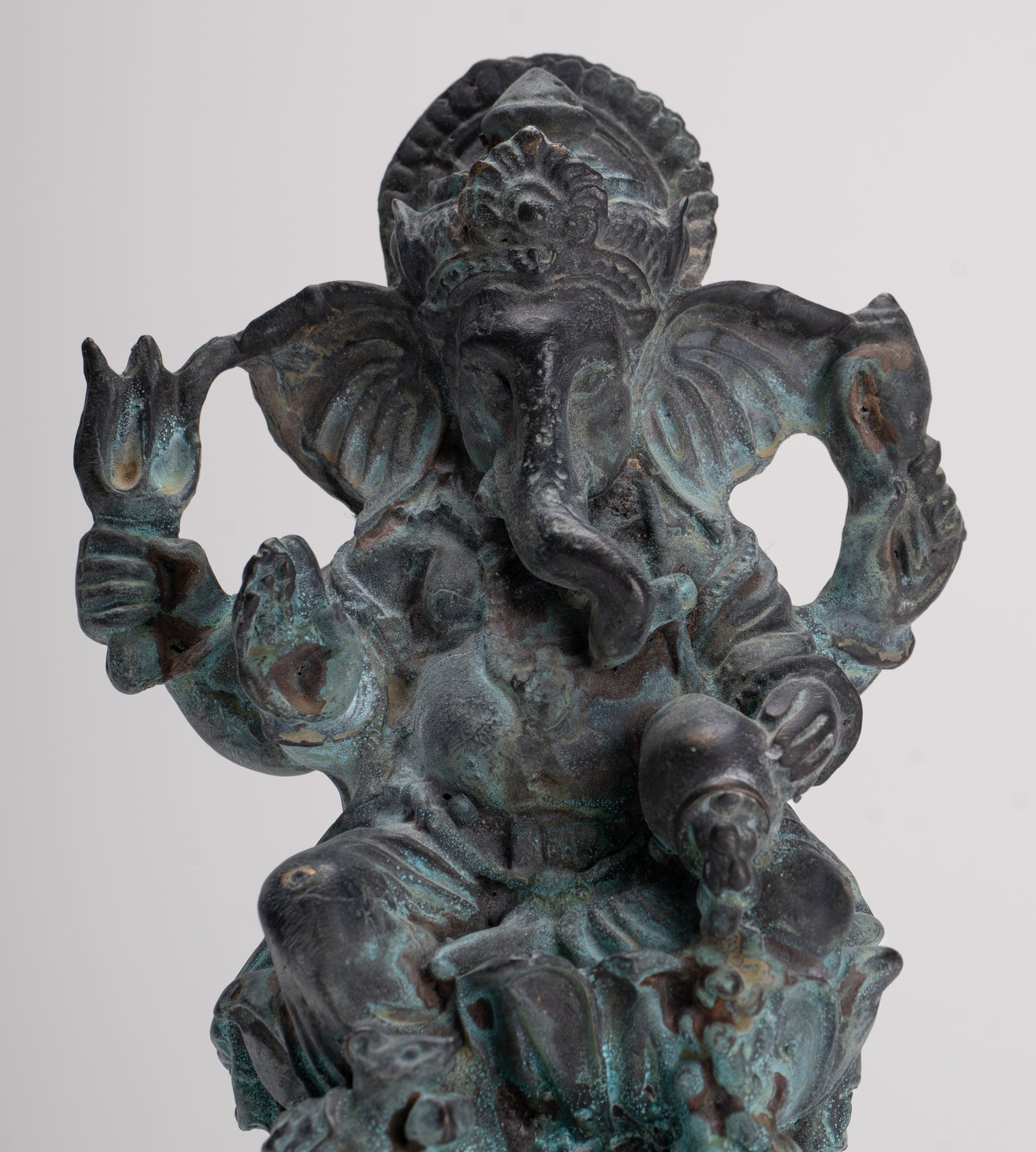 Un reparto expresivo unAntiguo estilo tailandés de bronce de 4 brazos Vara Ganapati Ganesha sentado sobre un sencillo pedestal.