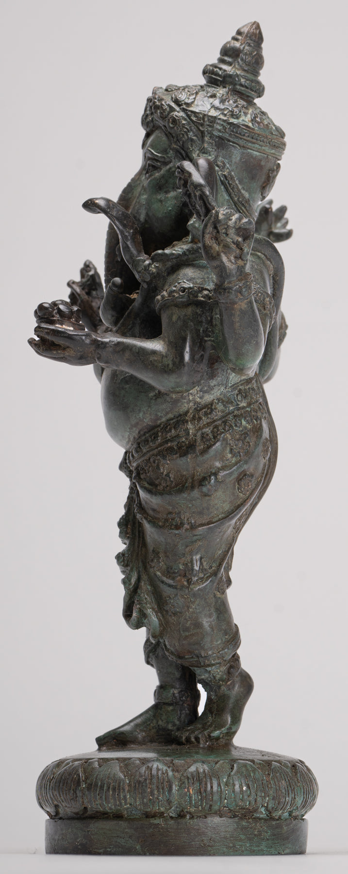 Esta escultura finamente modelada representa a Ganesha, el amado hijo de Shiva con cabeza de elefante, de pie con aplomo digno y vistiendo un largo dhoti con un paño cruzado enrollado alrededor de su corpulenta cintura. Los ricos pliegues de la prenda y su postura segura subrayan tanto su autoridad divina como su naturaleza accesible y benévola.