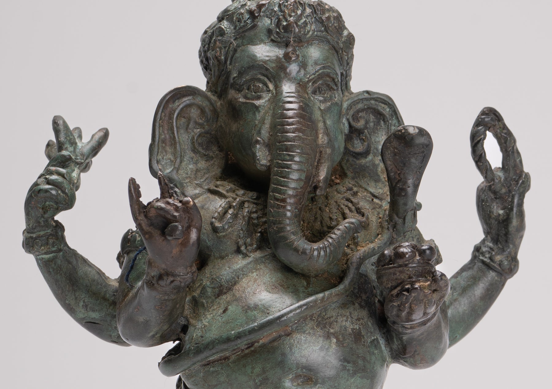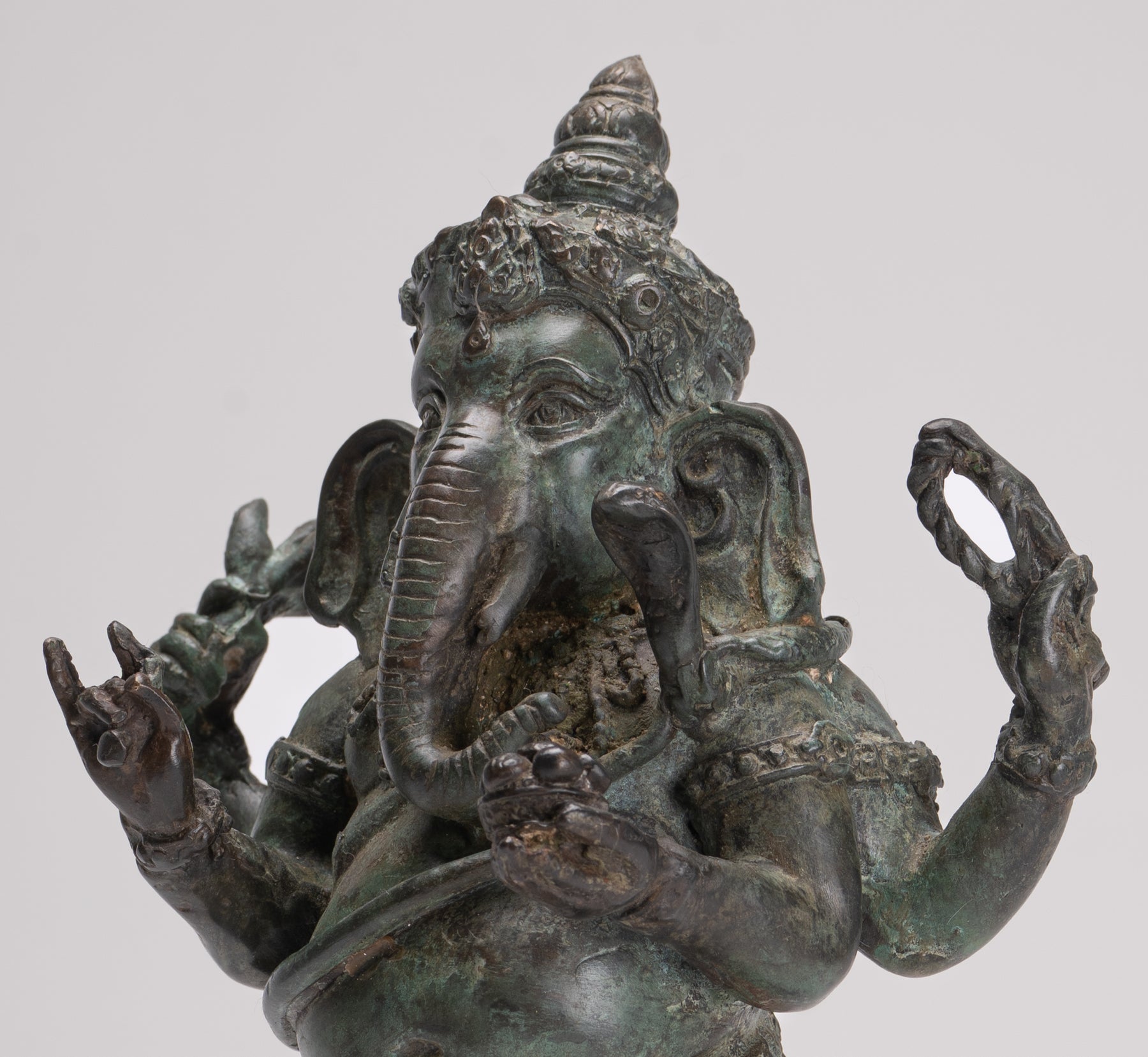 Un Ganesha de cuatro brazos de pie, de bronce antiguo de estilo tailandés, expresivamente fundido.