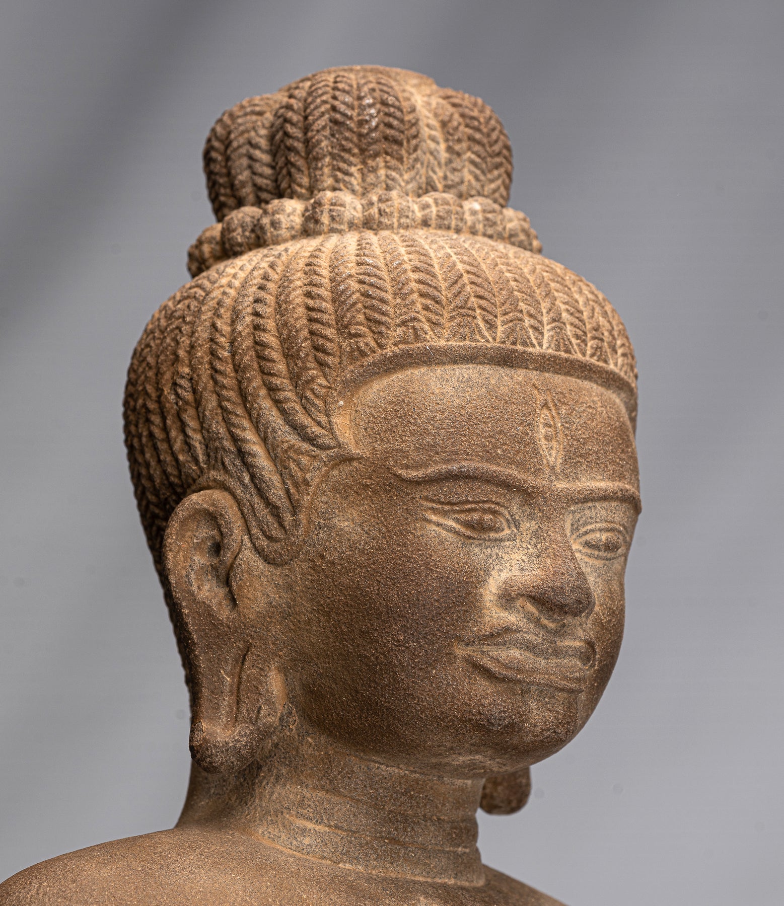 Una excelente figura de deidad de arenisca de Jhmer de estilo baphuon antiguo de Baphuon, de Lakshmi, ejecutada estilística e iconográficamente en el estilo tradicional 'Baphuon', de la mitología Khmer.