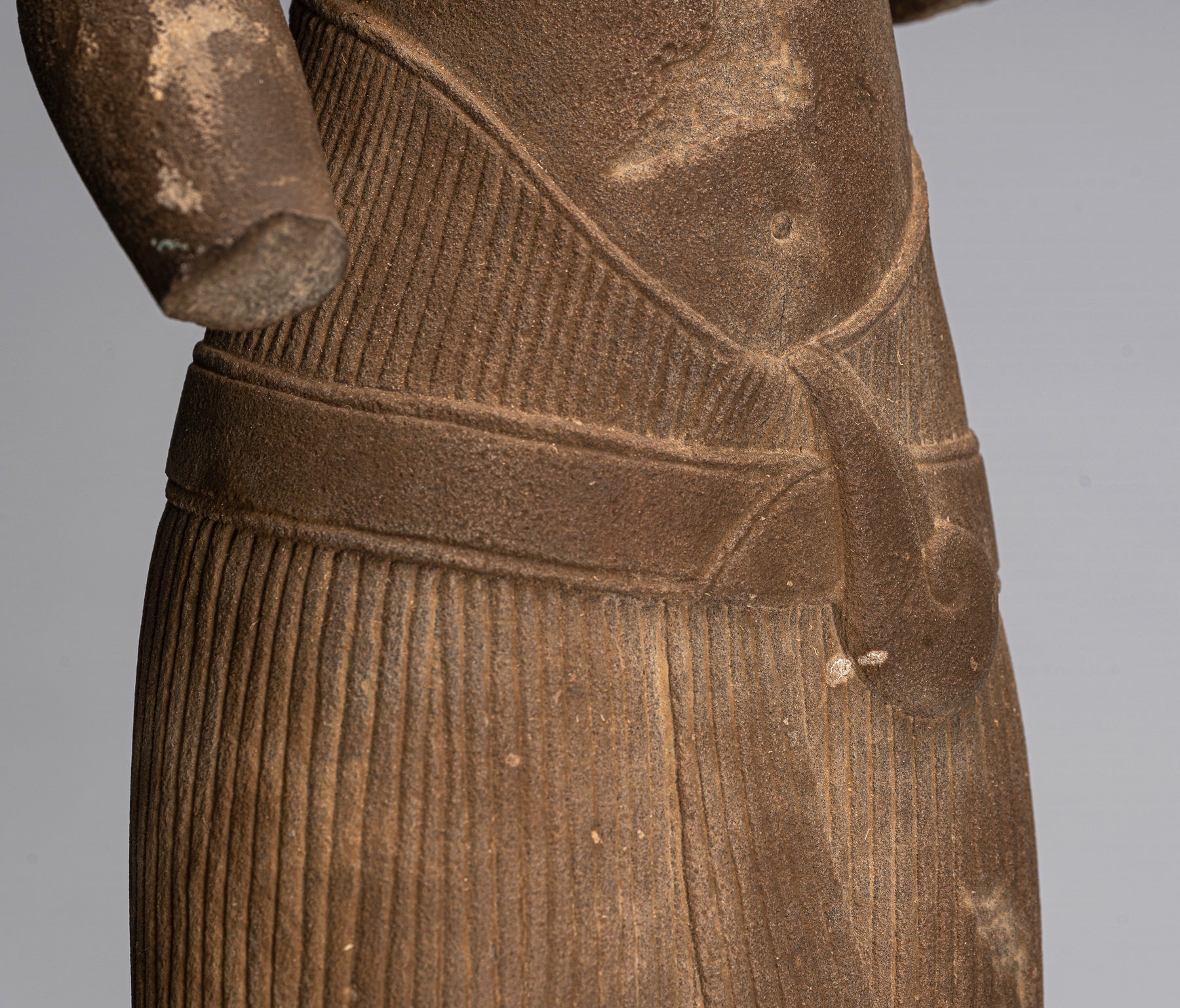 El torso tiene una cintura delgada, caderas y hombros anchos, con un sampot estriado verticalmente alto en la curva posterior en la parte delantera hasta debajo del ombligo, atado por un cinturón liso atado con el extremo colgando hacia el muslo derecho.