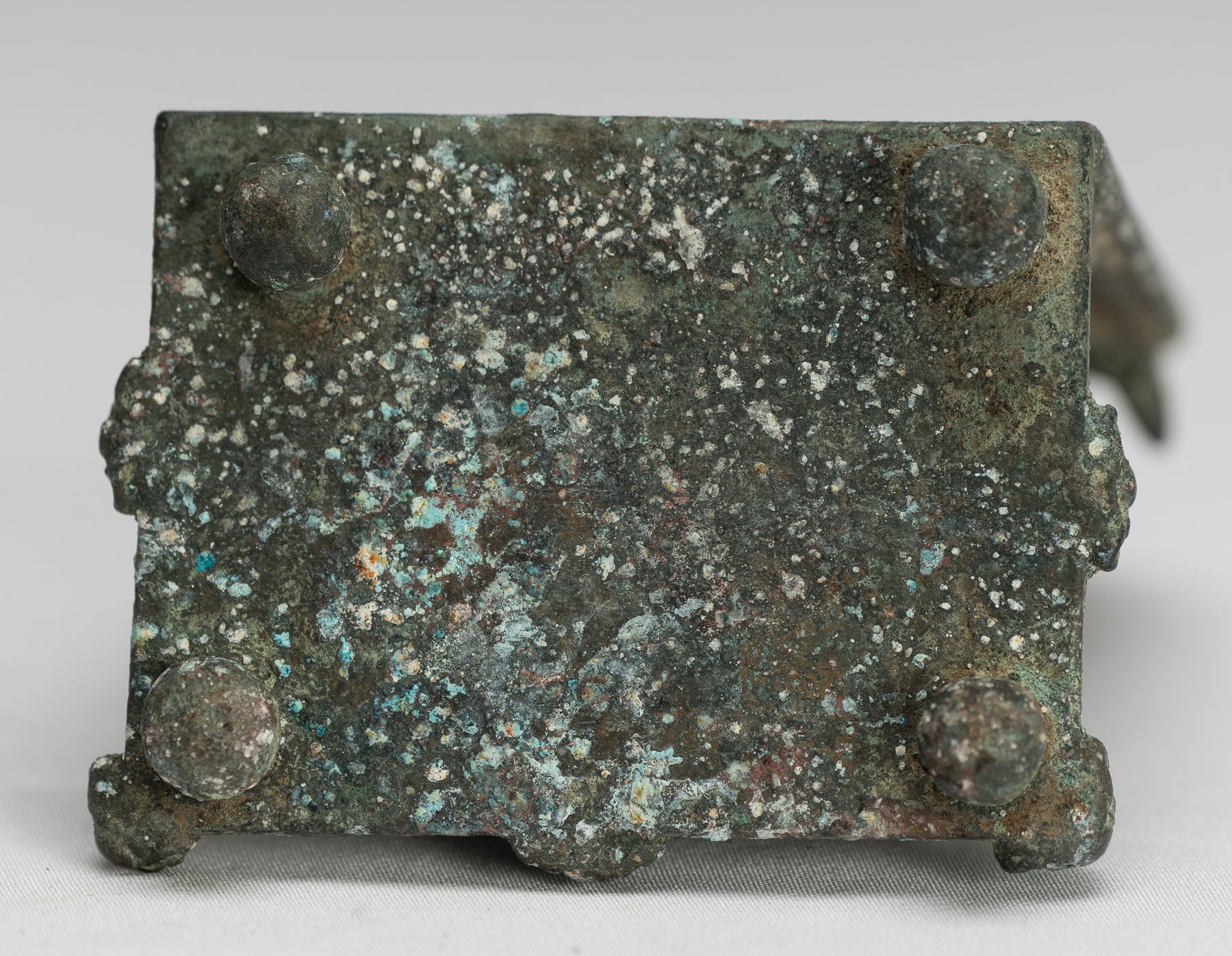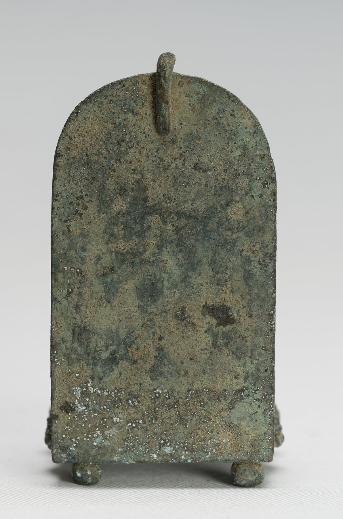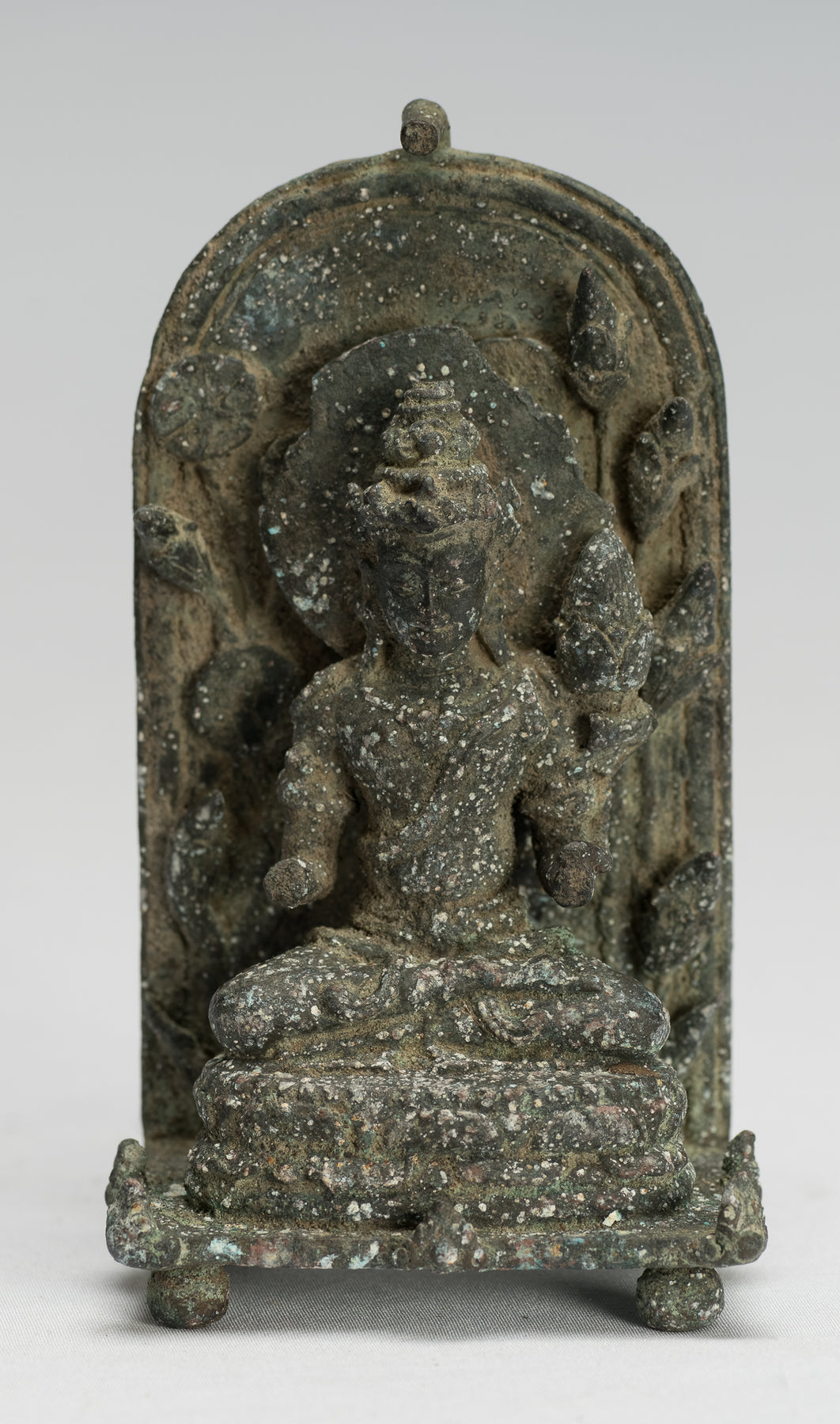 Una aureola con flores de loto se encuentra detrás de la representación de su divinidad. La escultura de pie tiene una maravillosa pátina de malaquita verde.
