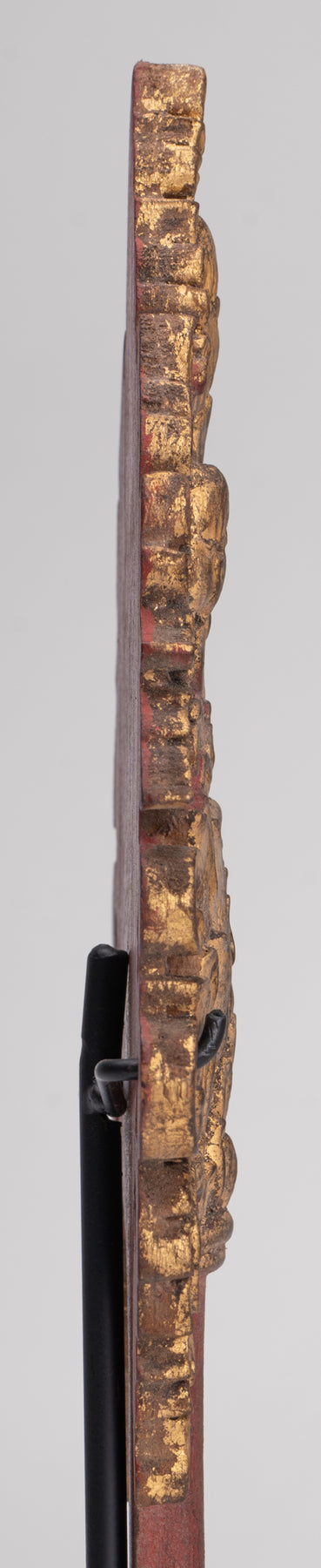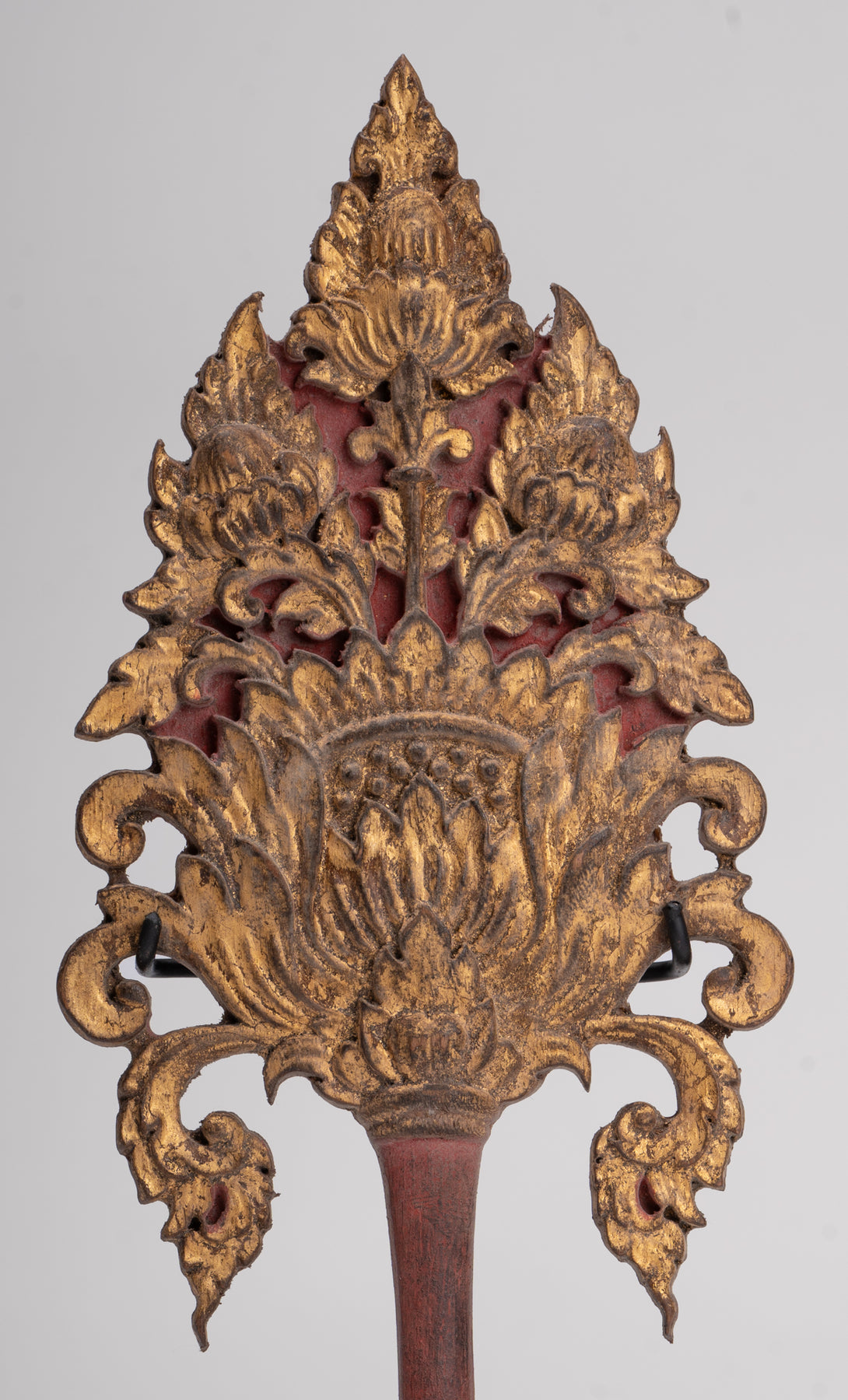 California. Fan de monje de laca del siglo XVIII. El ventilador está decorado en el estilo rojo y Shwe Zawa con devi y guardianes de arrodillado birmano tradicional. Está decorado con incrustaciones de vidrio y dorado de nuevo en estilo tradicional.