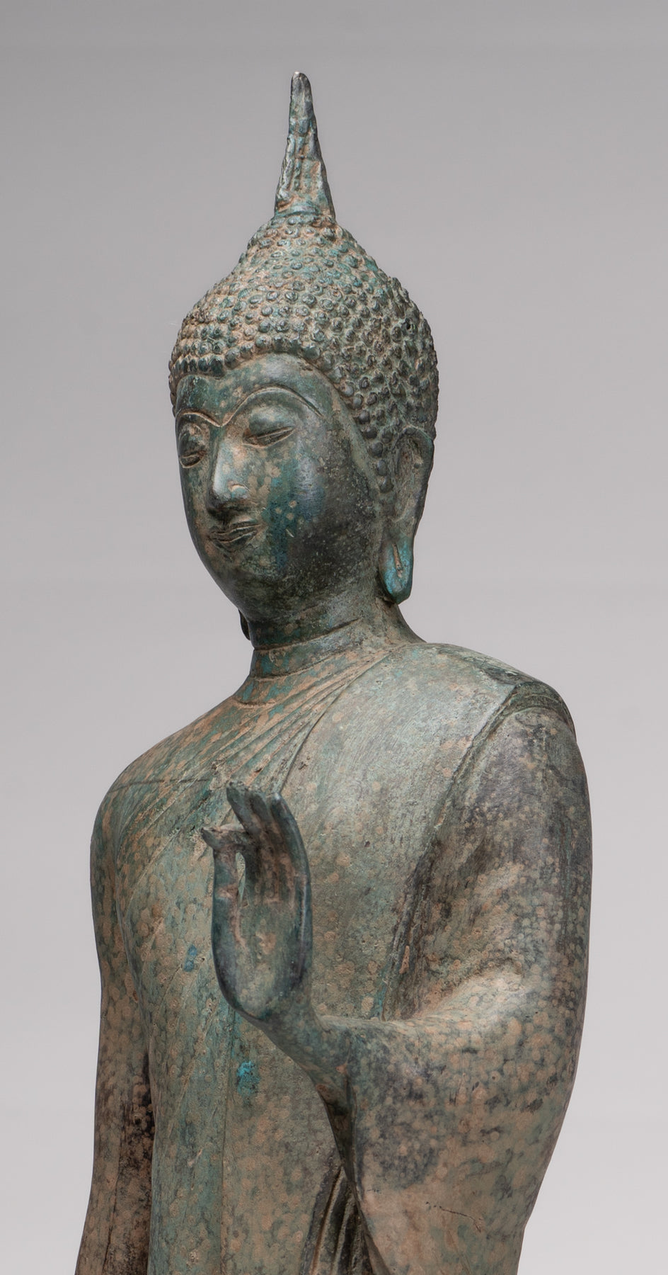 La grande protubérance ushnisha flamboyante au-dessus de sa tête, typique de la période Sukhothai, symbolise son haut niveau de développement spirituel.