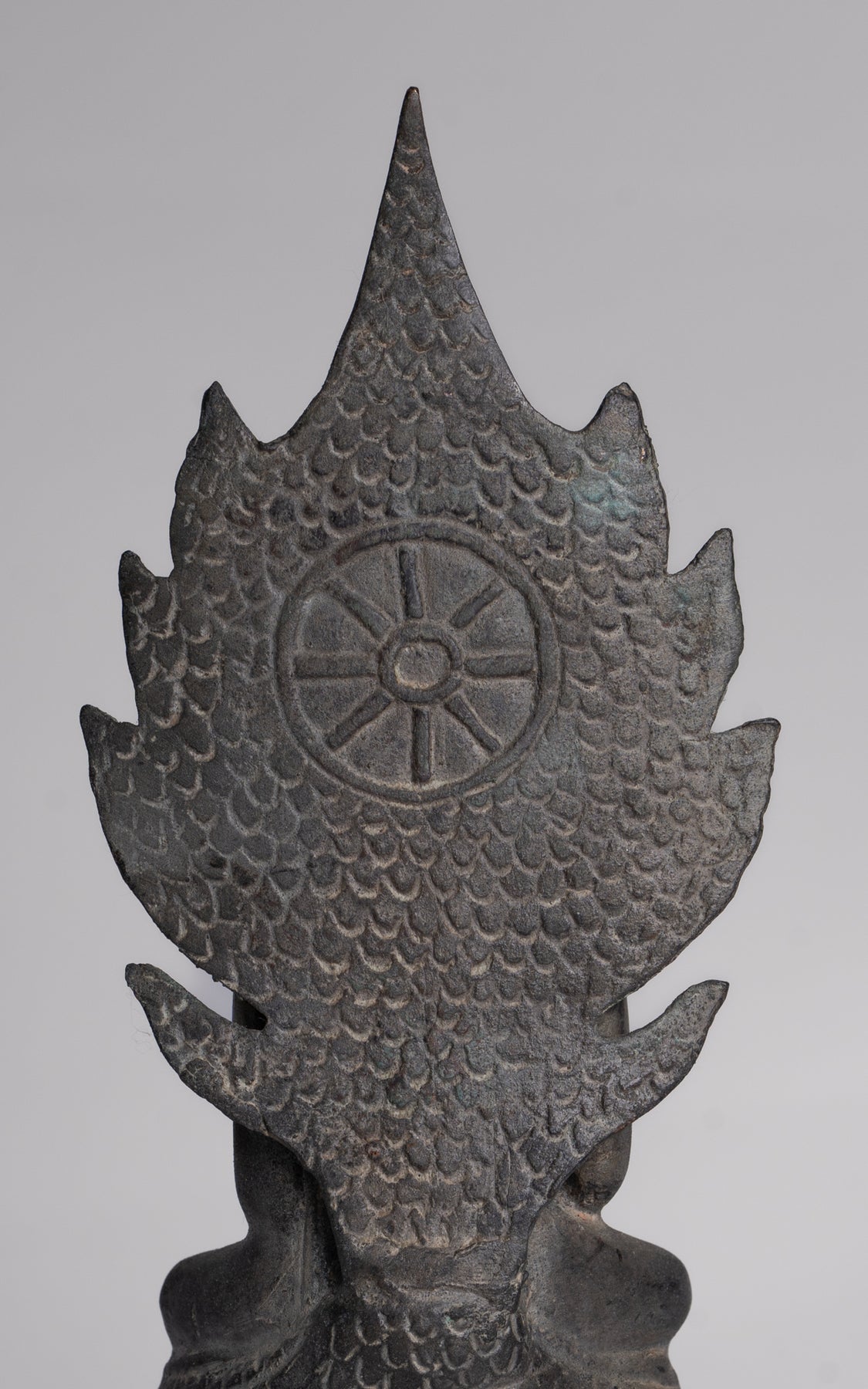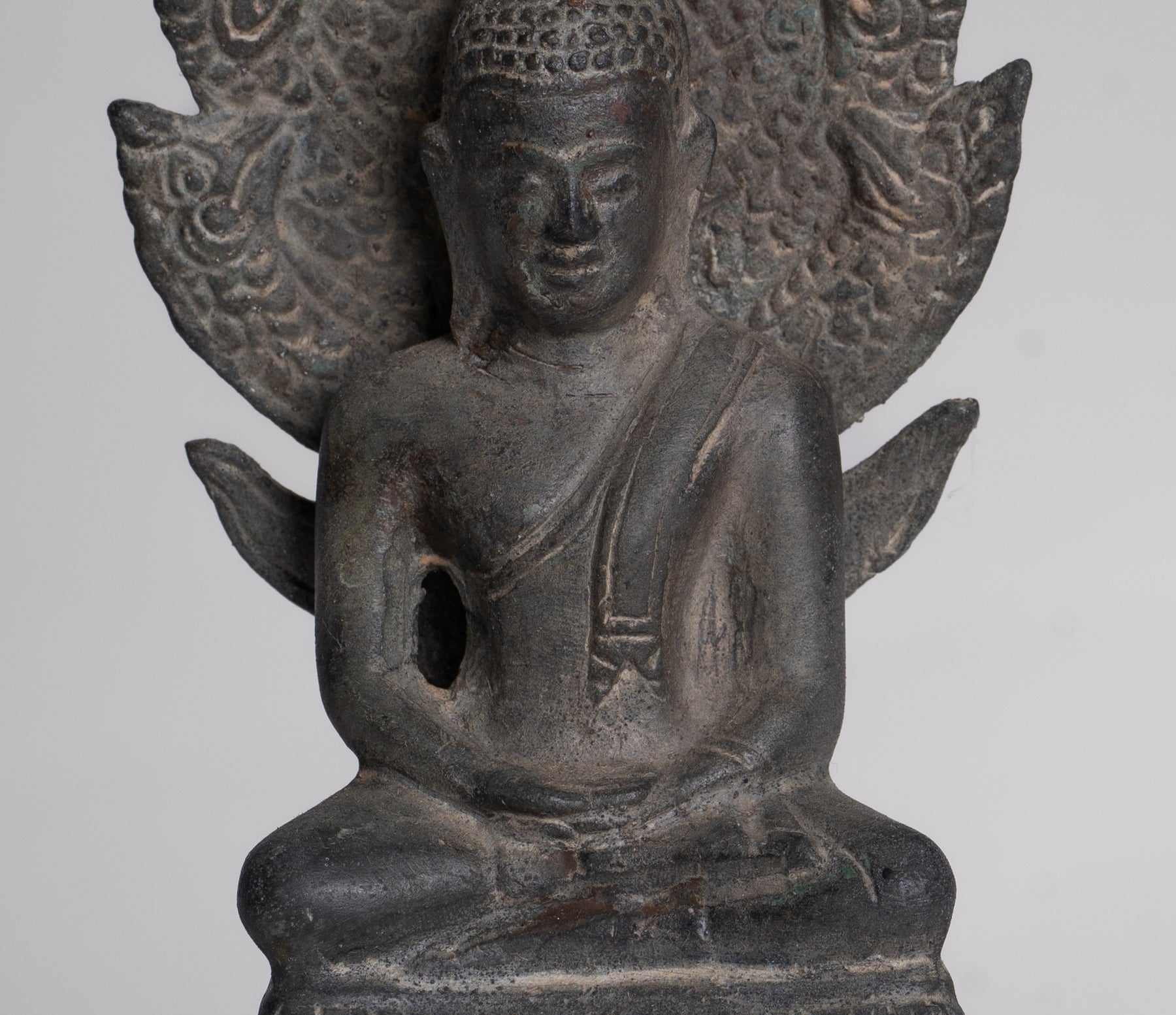 Le Le visage de Bouddha rayonne de paix et de douce introspection, avec des traits doux et naturalistes qui capturent à la fois l’humanité et la transcendance. Sa tête est couronnée d'un dessin finement détaillé Ouchnisha, caractéristique du raffiné À la manière de Sukhothaï, signifiant connaissance spirituelle et illumination. Le forme de serpent est habilement modelé, symétrique et digne, ses écailles complexes et ses têtes équilibrées incarnant à la fois la force et la dévotion.