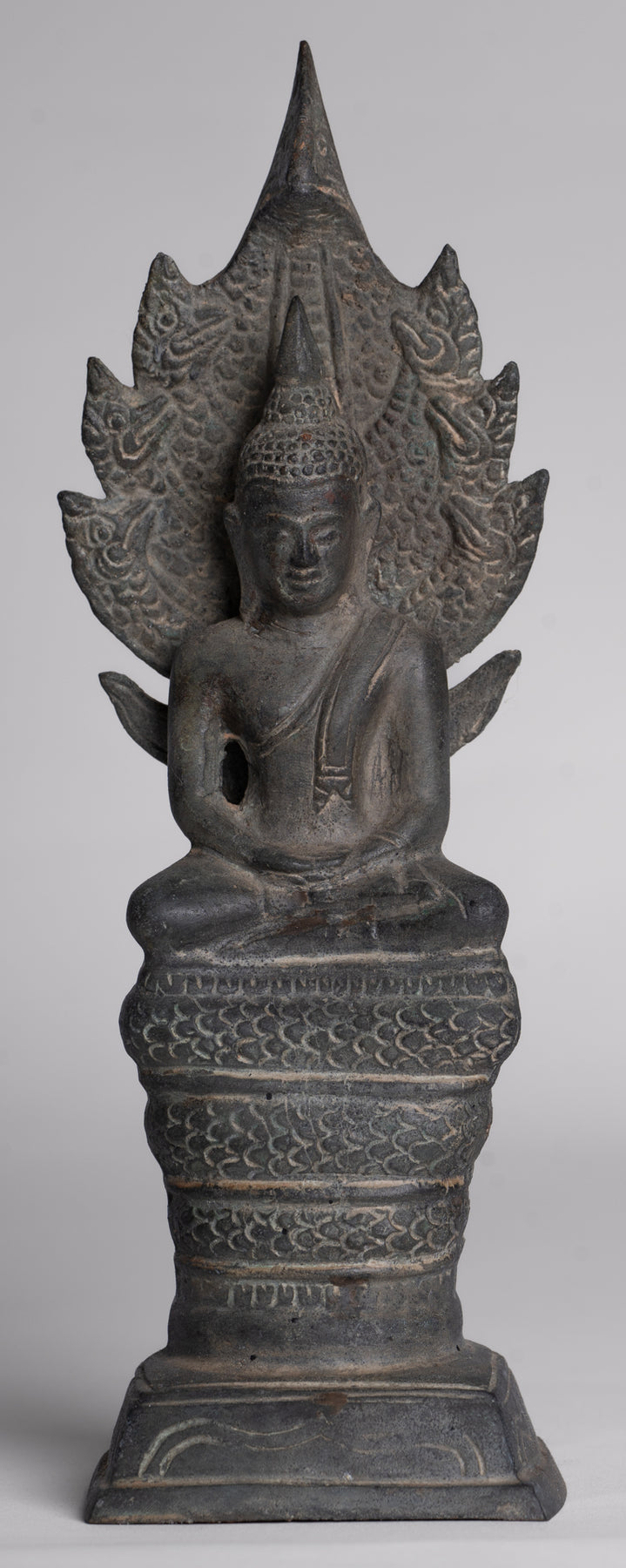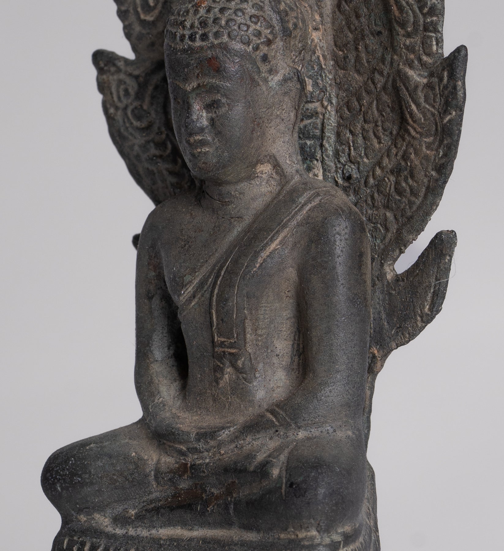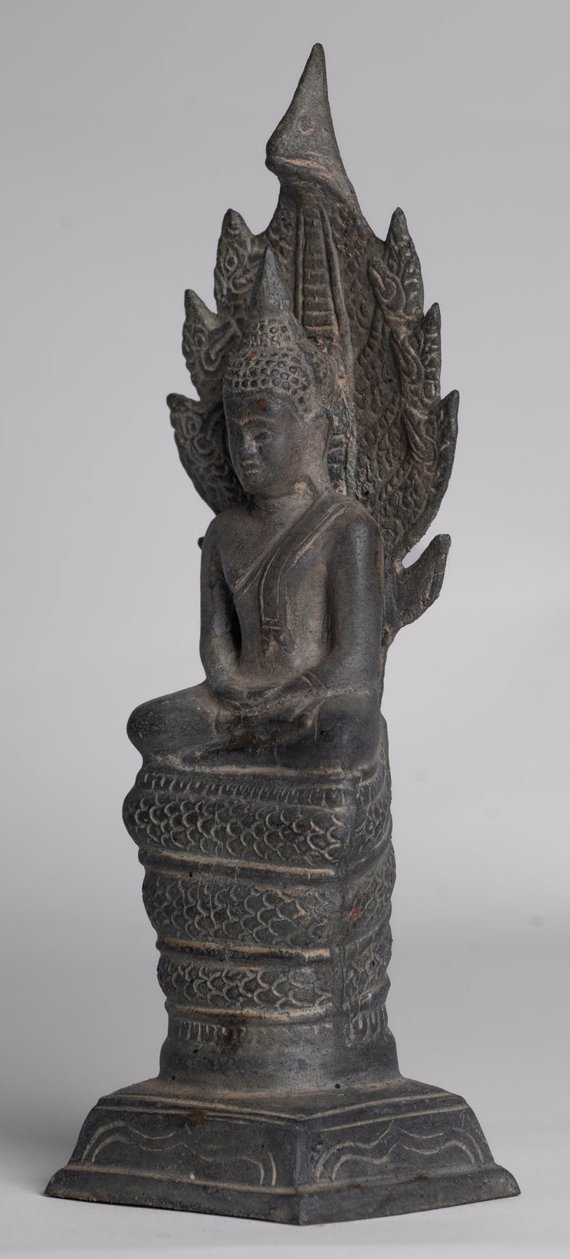 Statue de Bouddha – Statue de Bouddha Naga méditant en bronze antique de style Sukhothai – 21 cm.